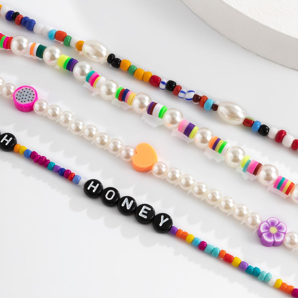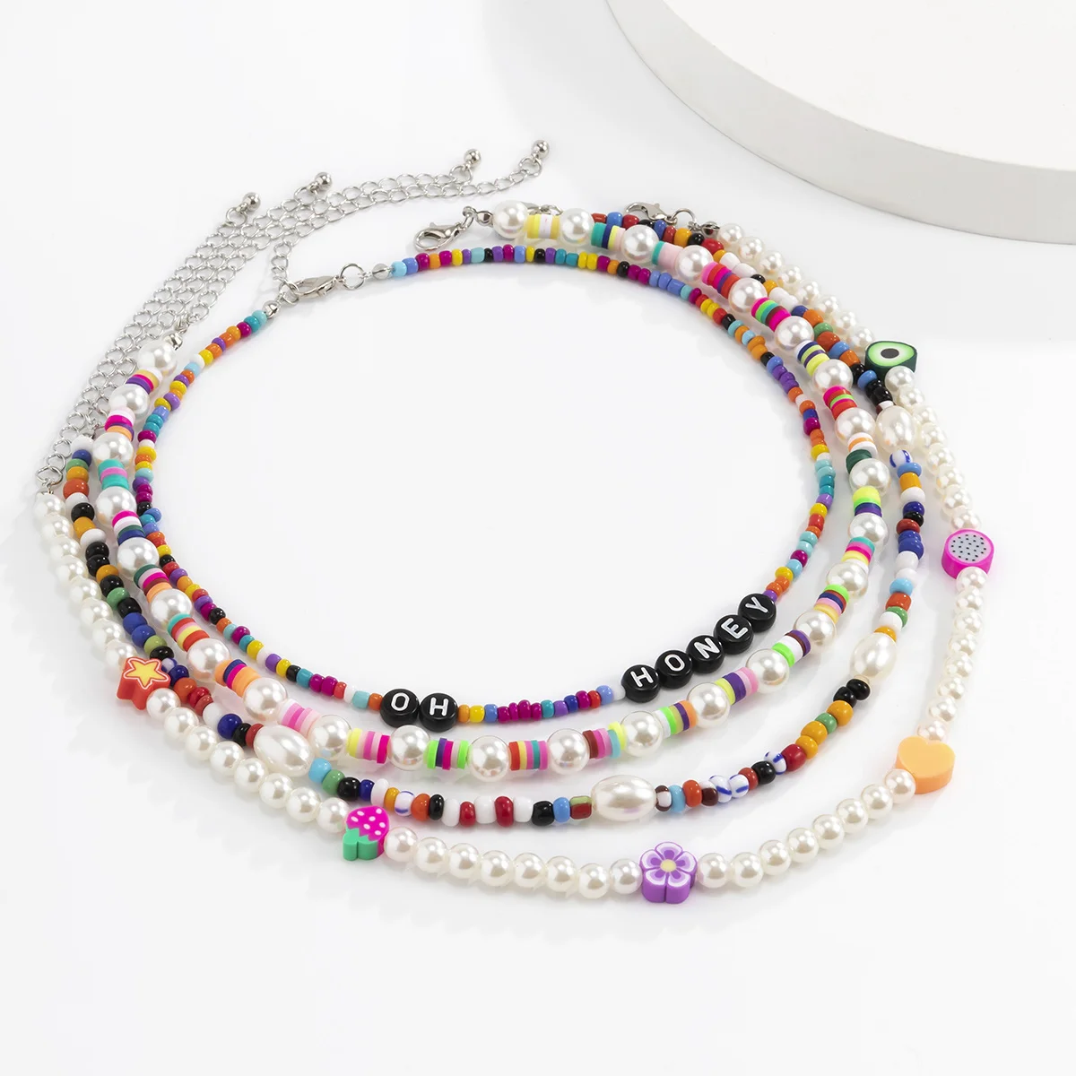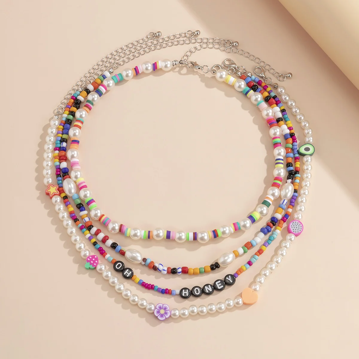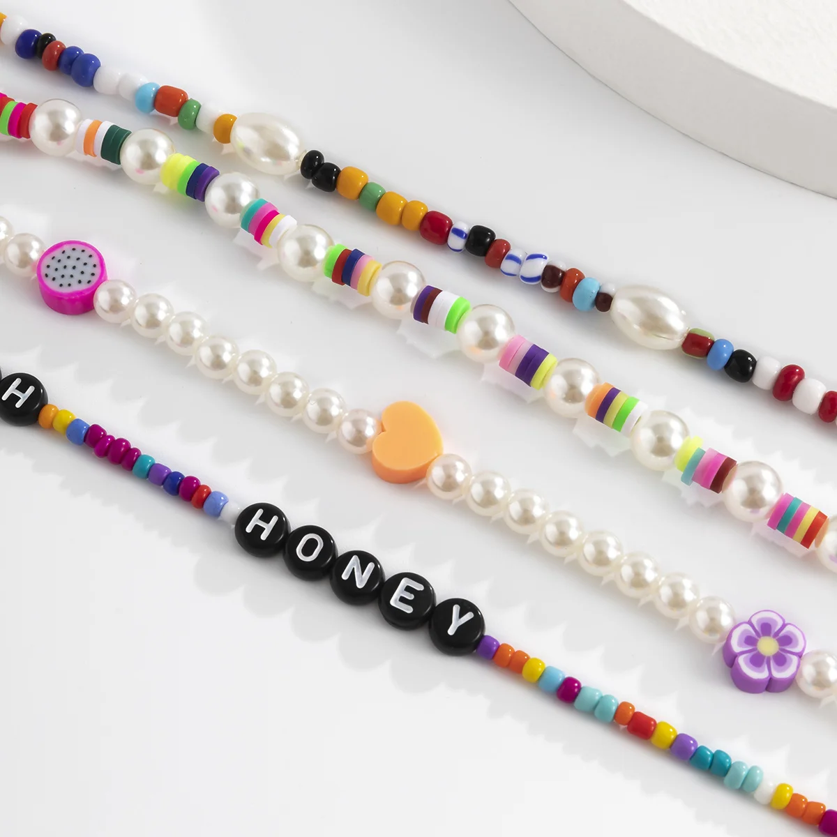 Lacteo 4 Pcs/Set Y2K Resin Flower Fruit Letter Choker Necklace Bohemian Rainbow Coloful Beads Chain Charm Necklace
