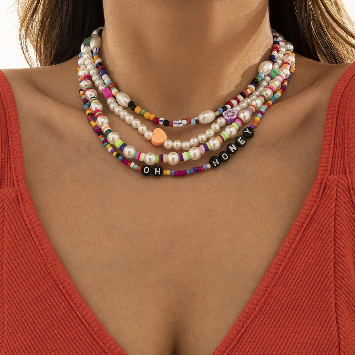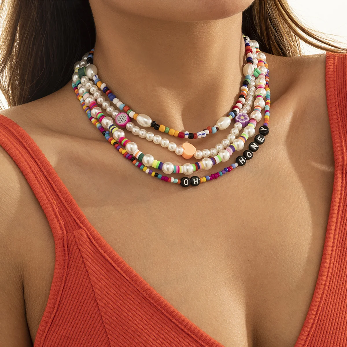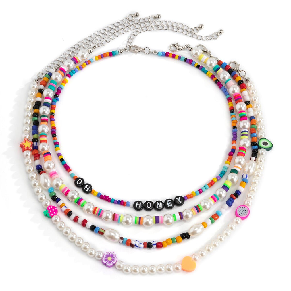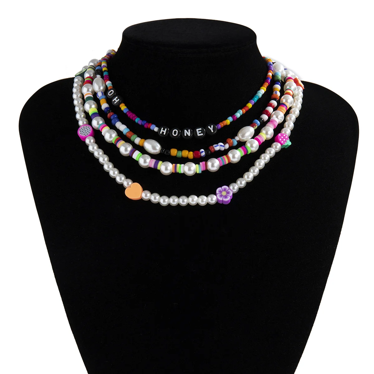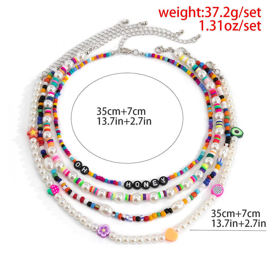 Lacteo 4 Pcs/Set Y2K Resin Flower Fruit Letter Choker Necklace Bohemian Rainbow Coloful Beads Chain Charm Necklace