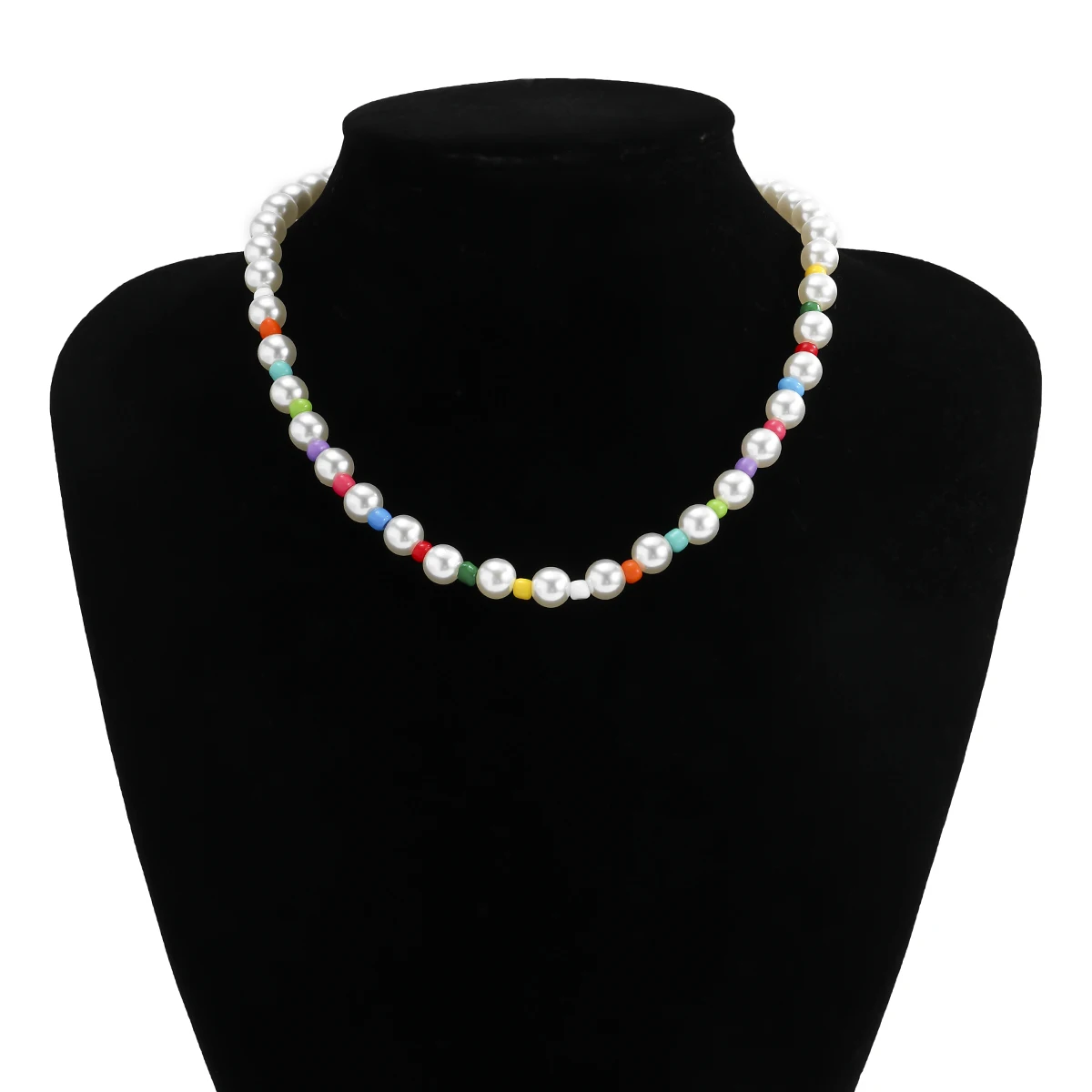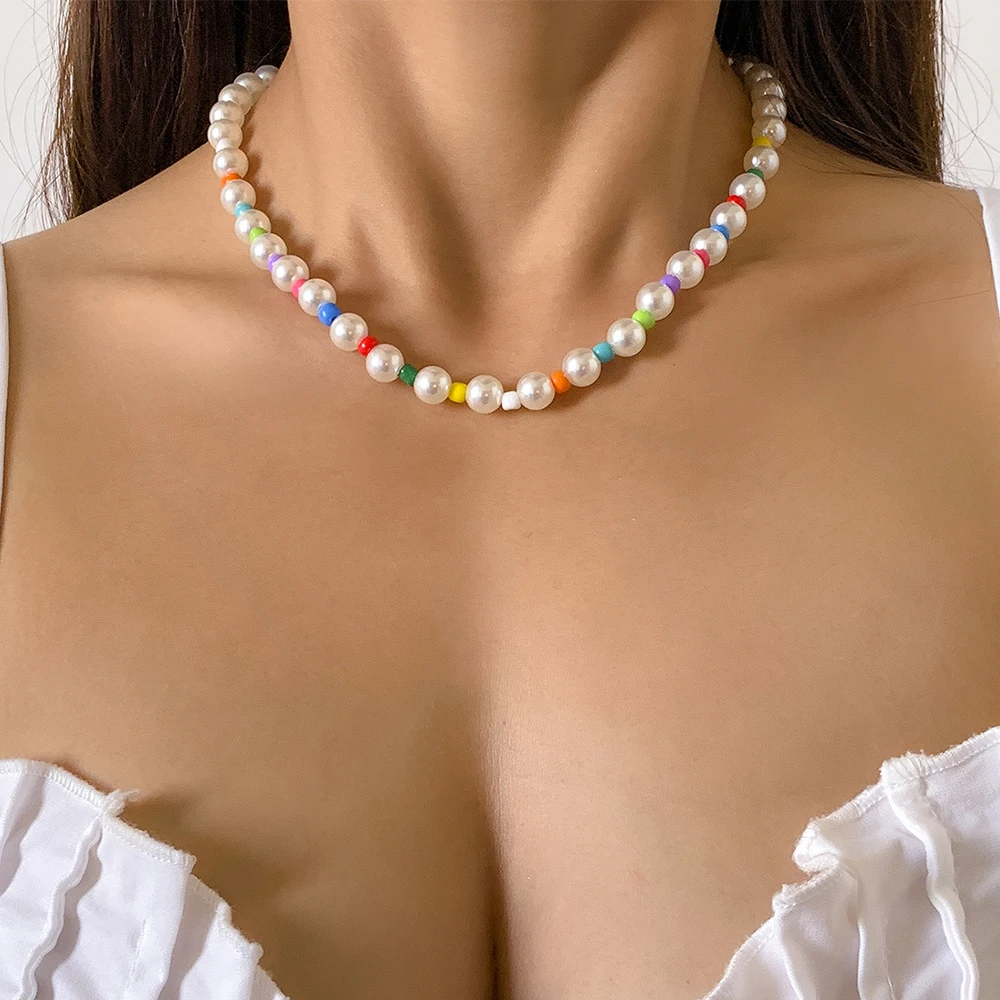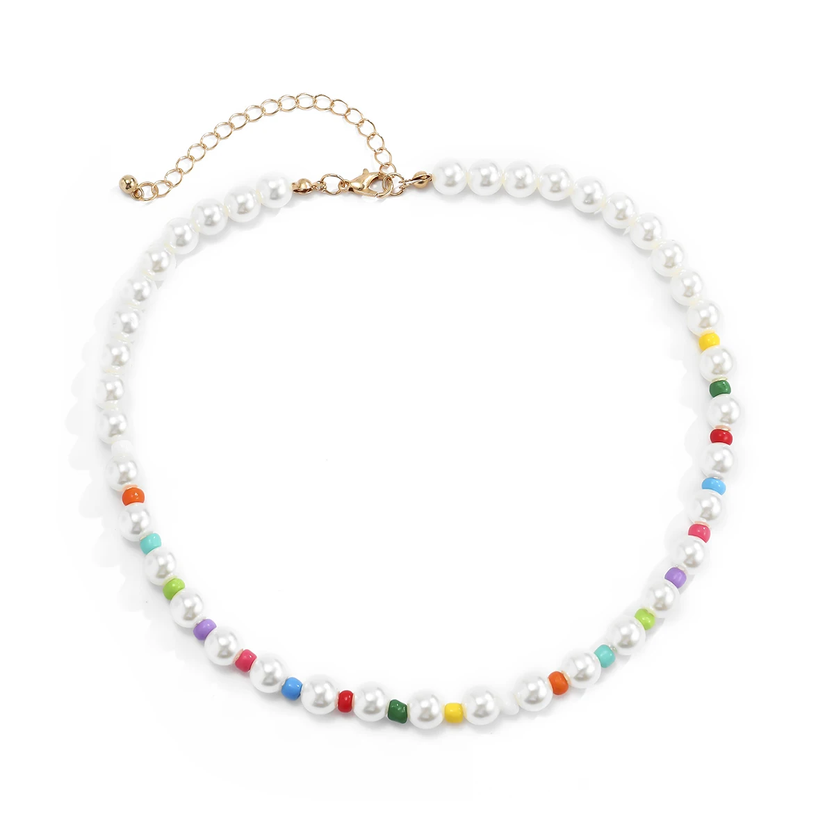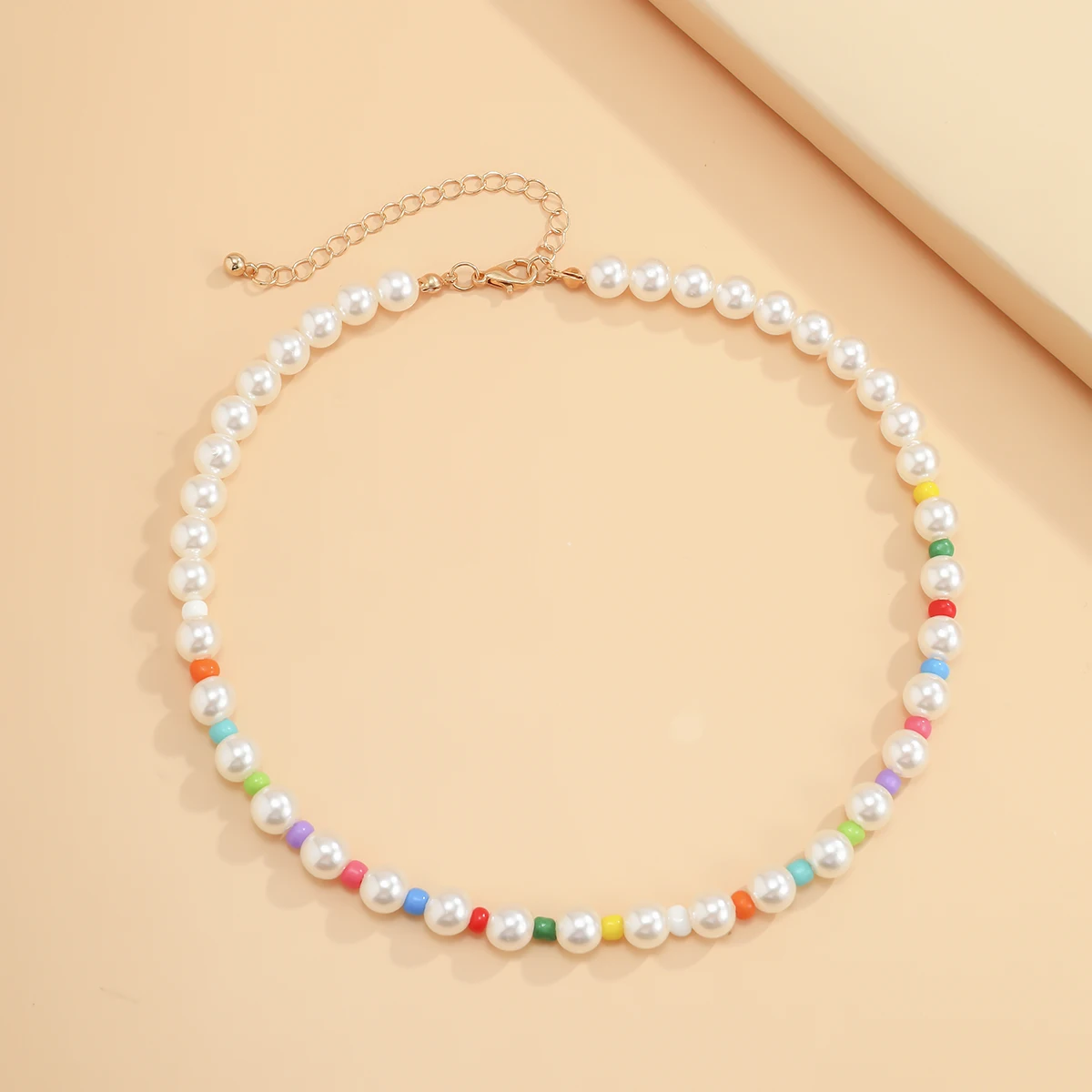 Lacteo Y2K Rainbow Color Acrylic Imitation Pearls Asymmetric Choker Necklace 2022 Trendy Clavicle Chain Necklace