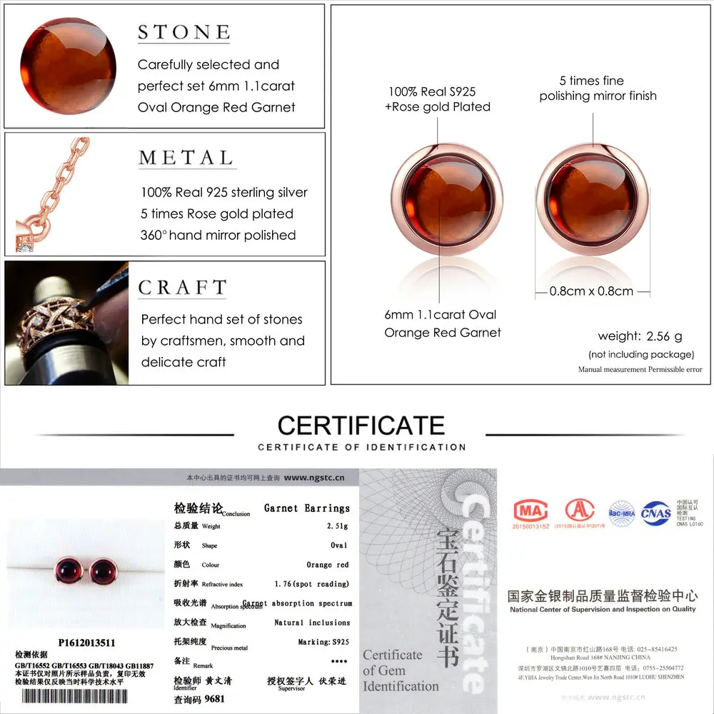 Women's 925 Sterling Silver Jewelry Sets 6mm 1.2ct 100% Natural Round Orange Red Rubin Garnet Fine Jewelry Set Necklace