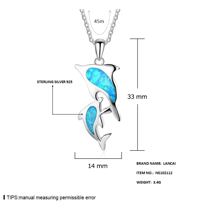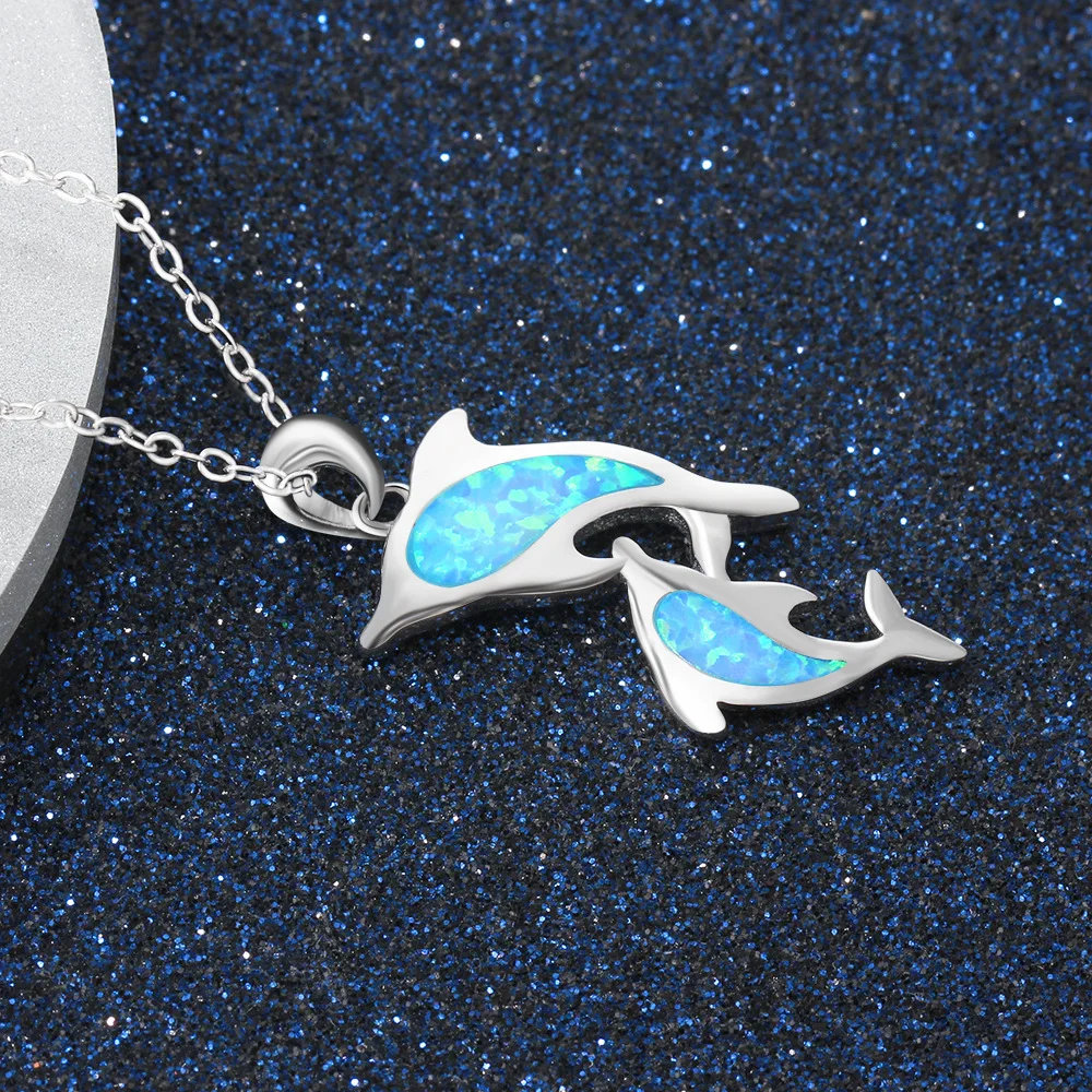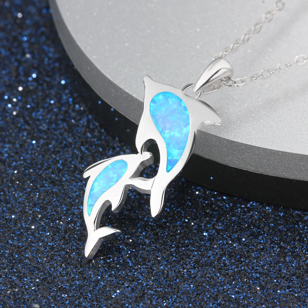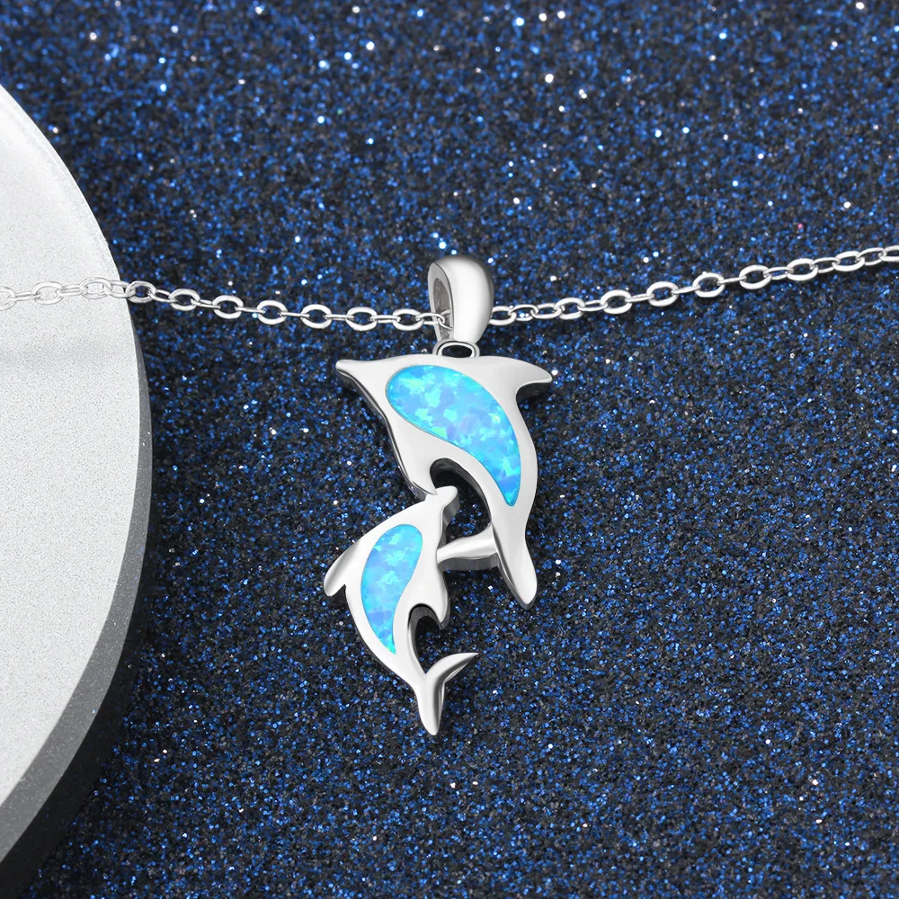 Silver inlaid Blue Fire Opal Cute Two Dolphins Necklace 925 Sterling Silver Pendant Necklace for Women Fine Jewelry Gift