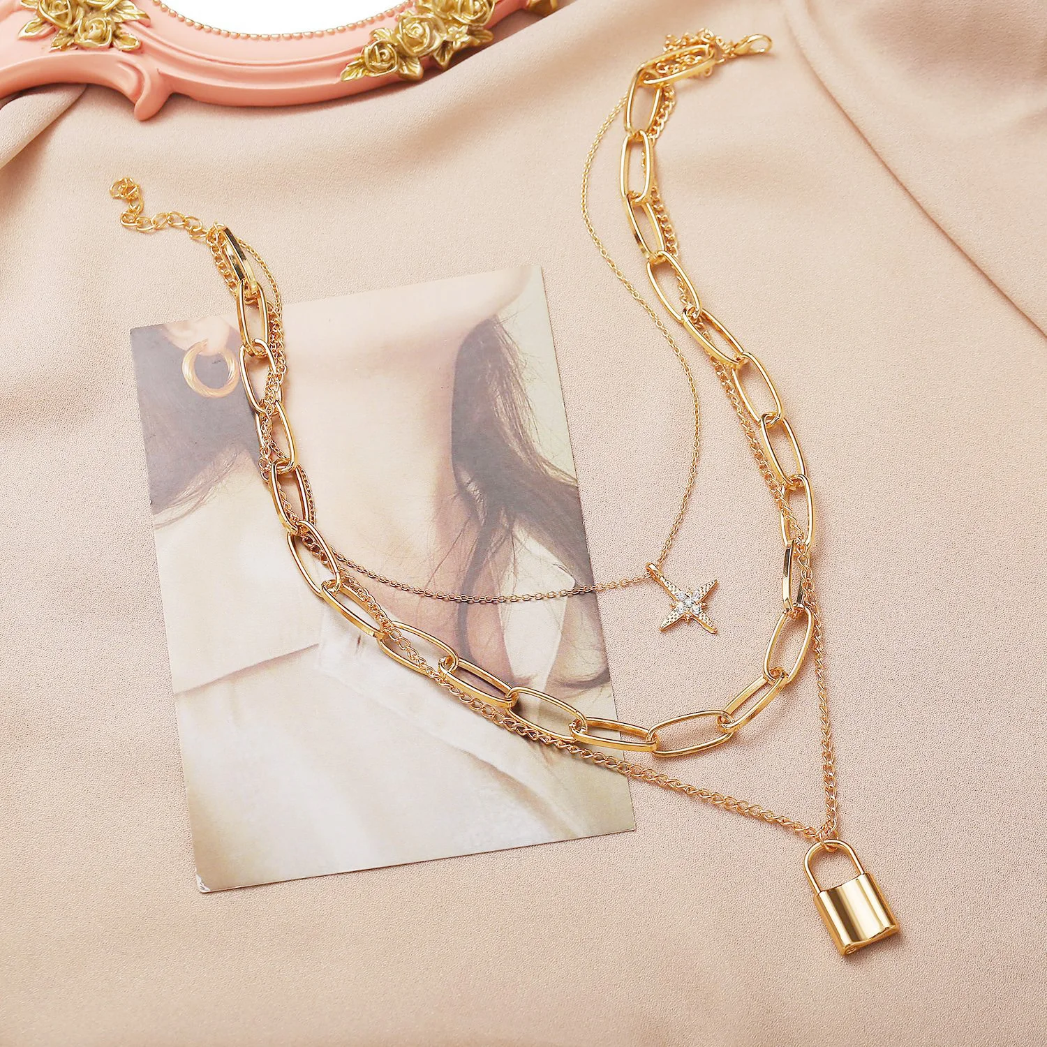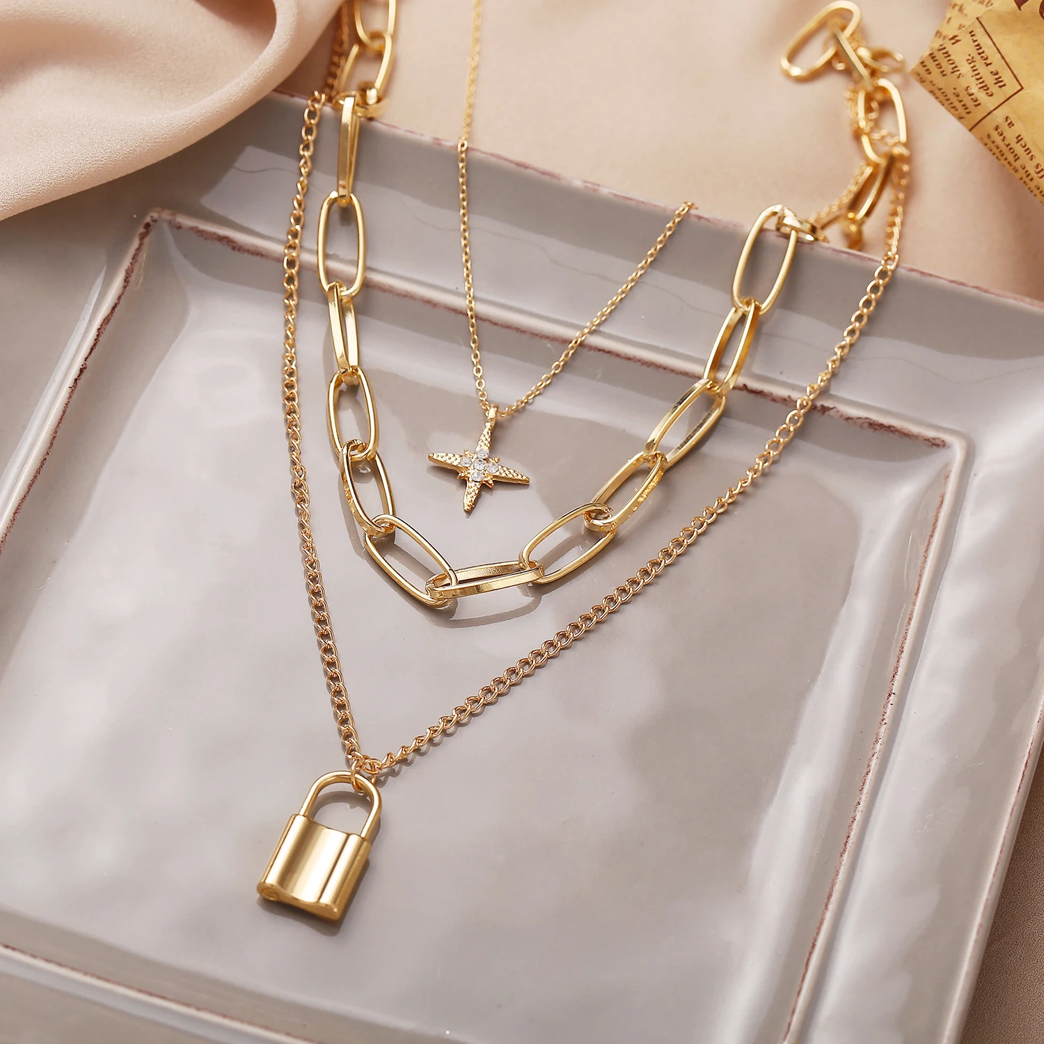LATS Multi Layer Lock Portrait Pendants Necklaces For Women Gold Metal Key Heart Necklace Design Jewelry Gift