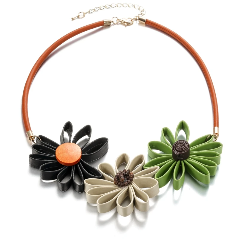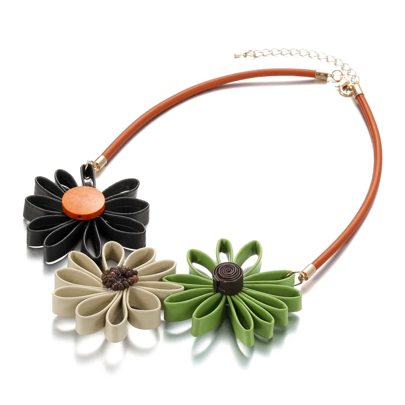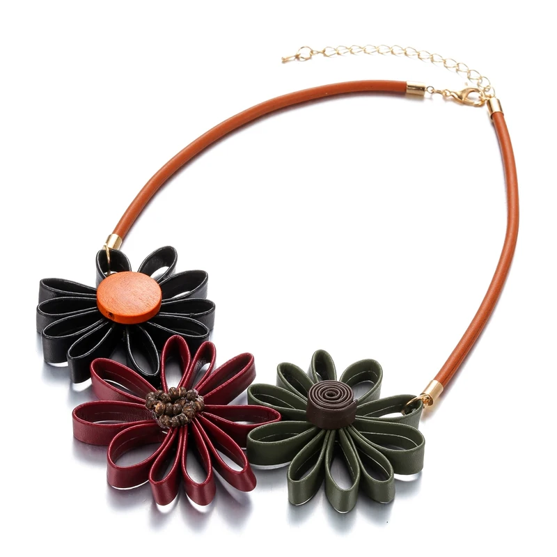 Leather Sun Flower Big Necklace for Women Hand Made Statement Necklace Pendant Vintage Ethnic Jewelry for Gift Party MX110