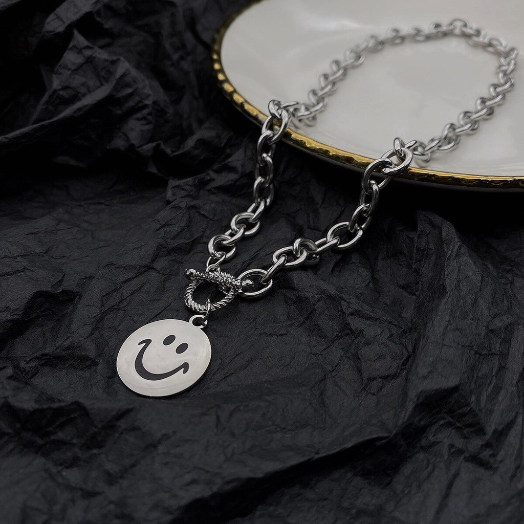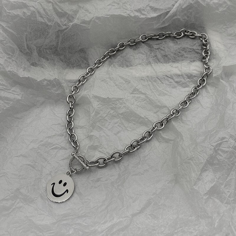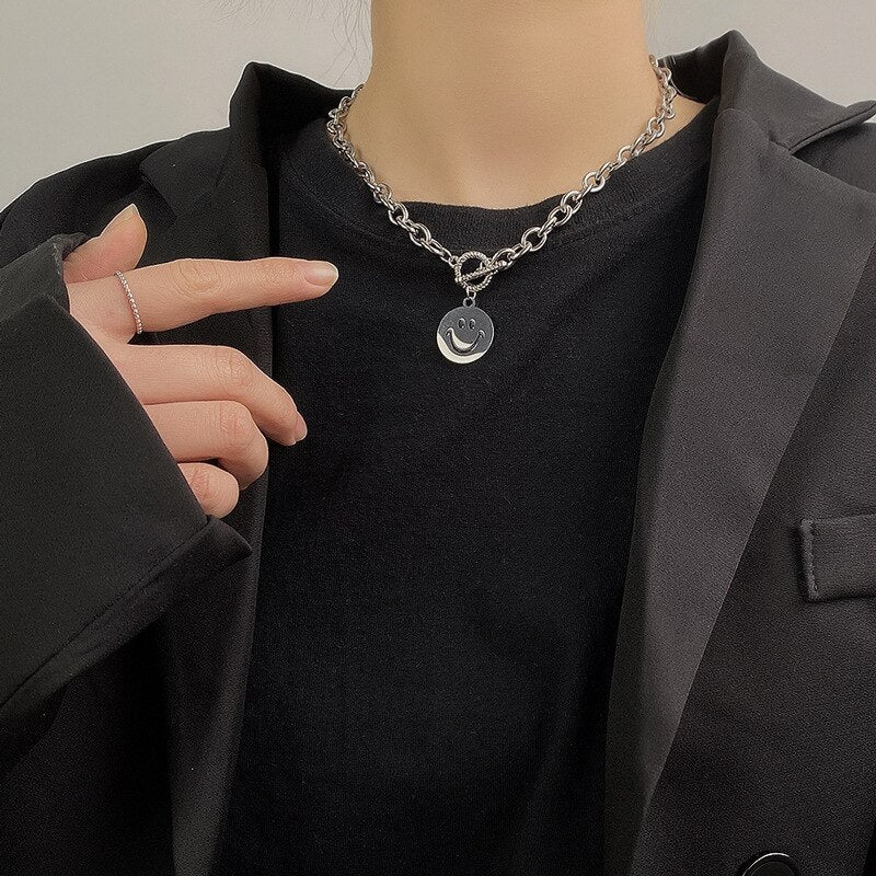 LOVOACC Hip Hop Metallic Coin Smile Pendant Necklace for Women Chunky Chain Toggle Clasp Circle Titanium Steel Chokers Necklaces