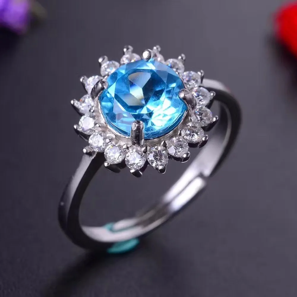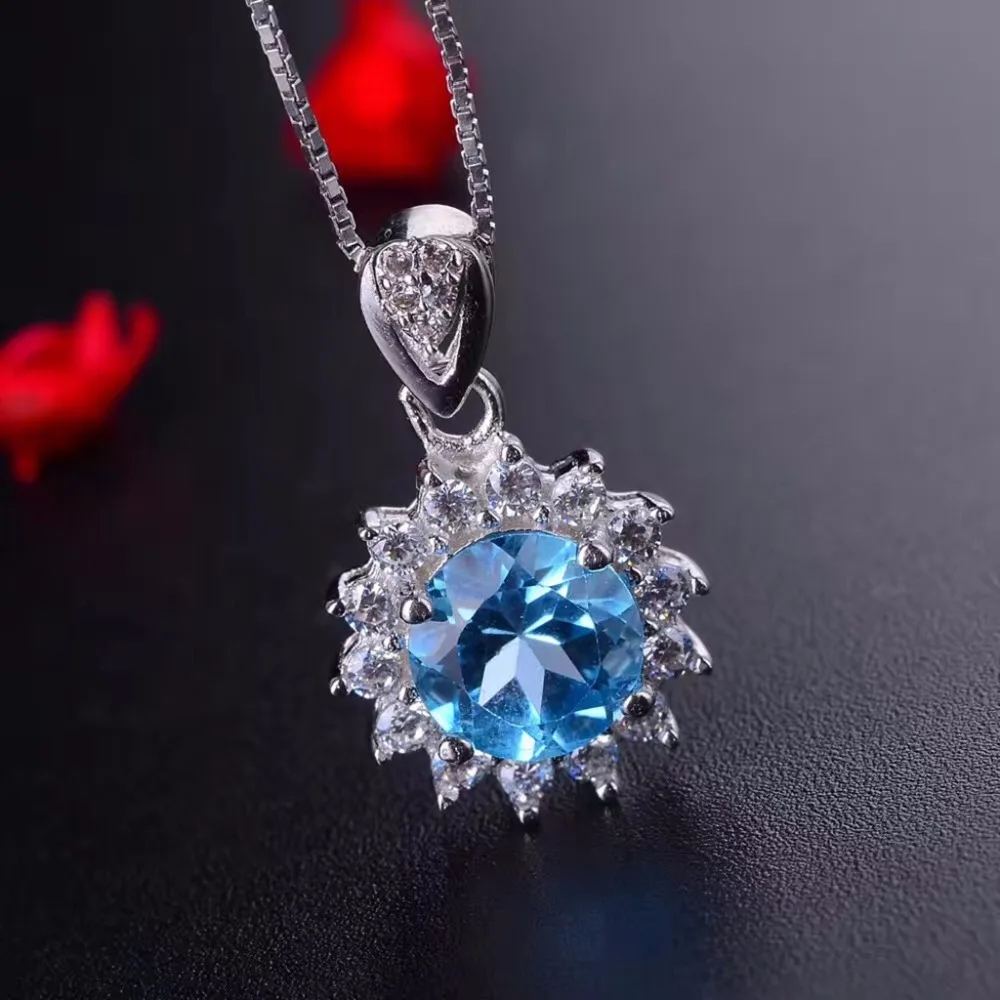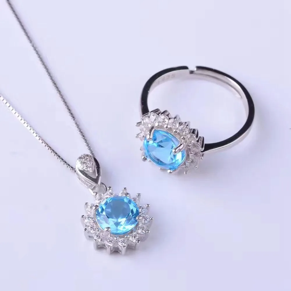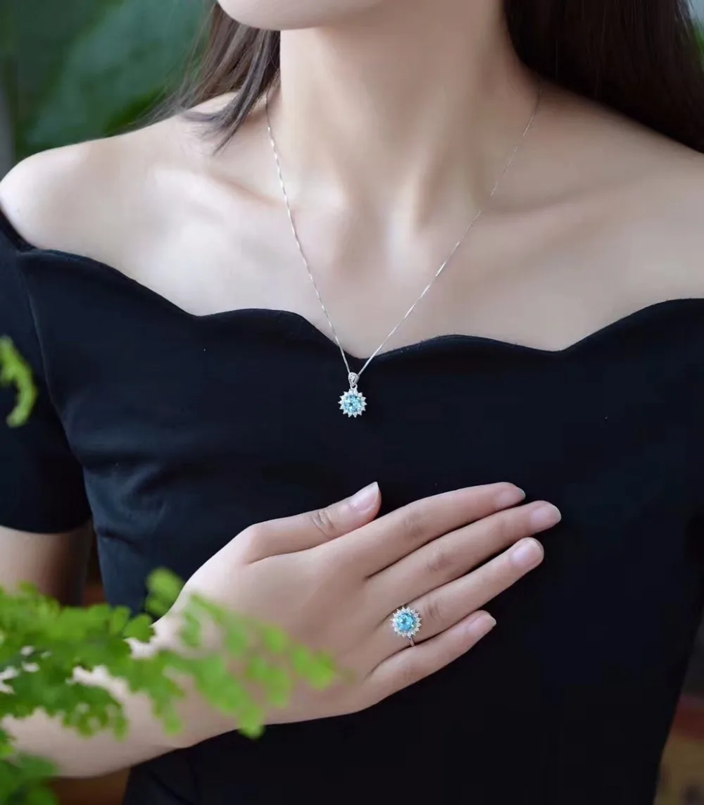 Natural Blue Topaz Flower Jewelry Set 925 Pure Silver Ring Pendant Necklace 2 Suits Fine Wedding Jewelry for Women