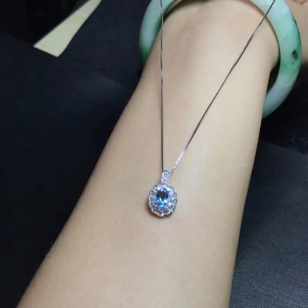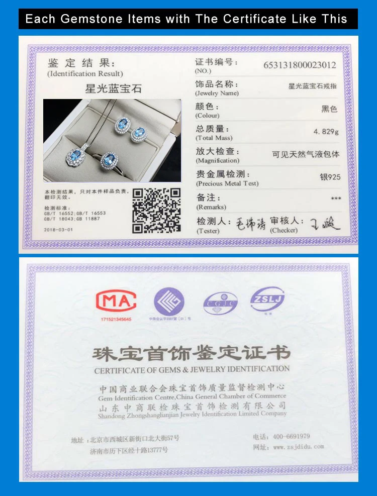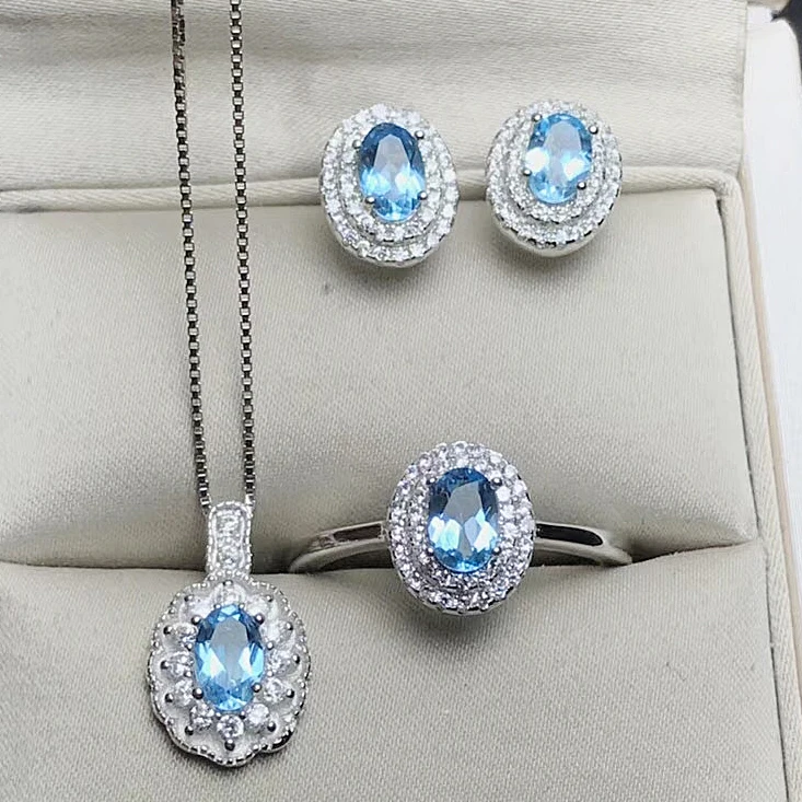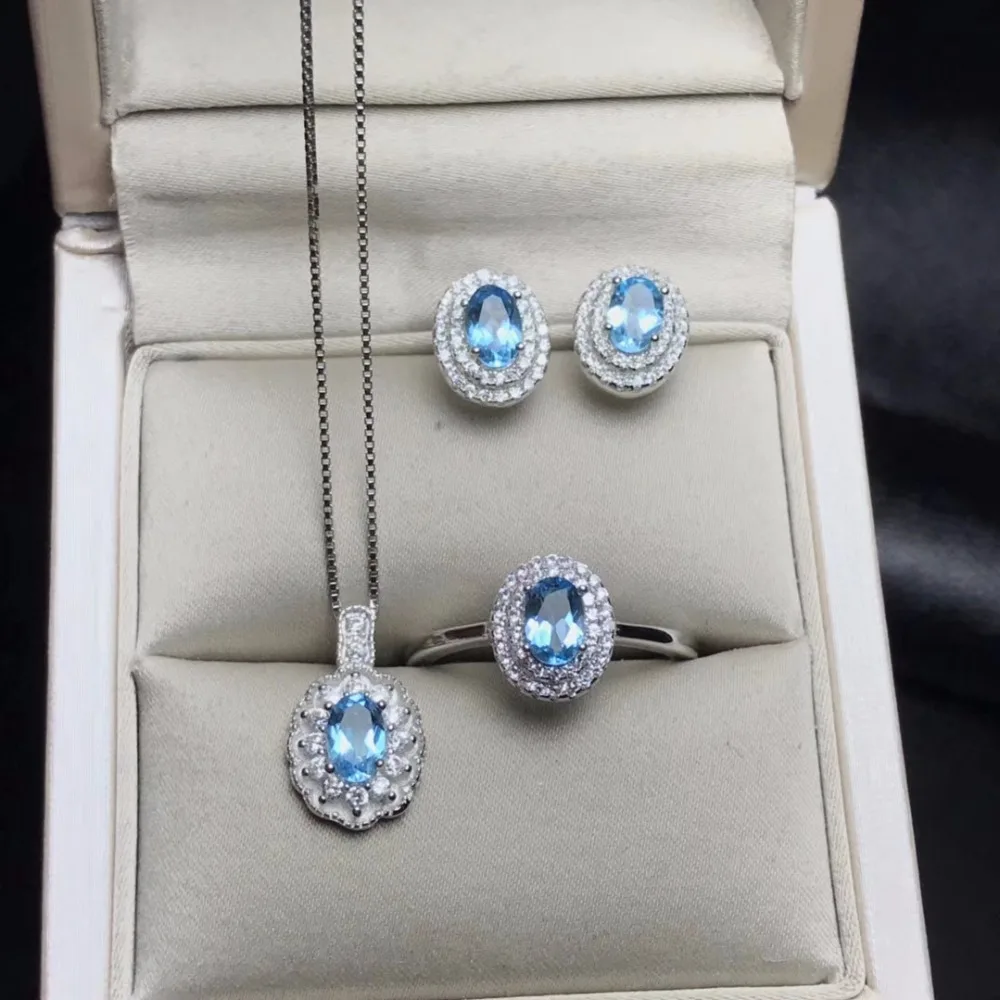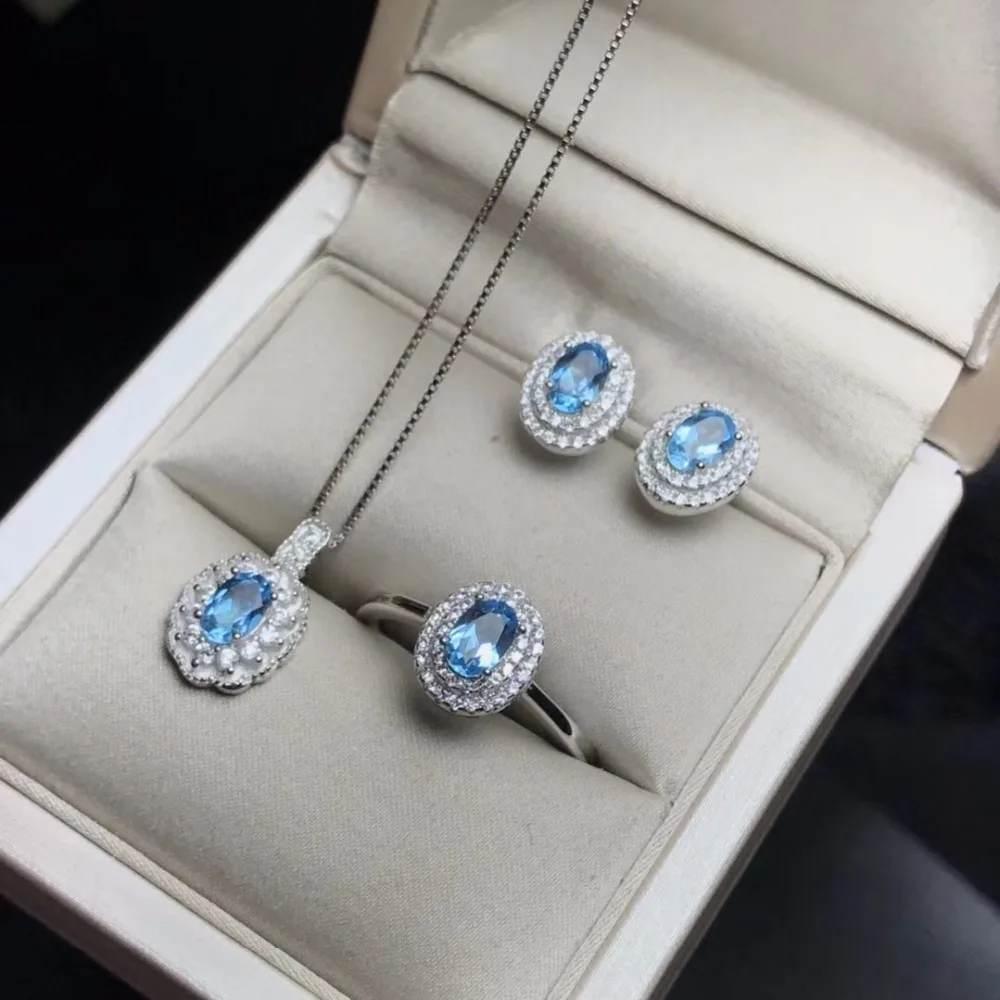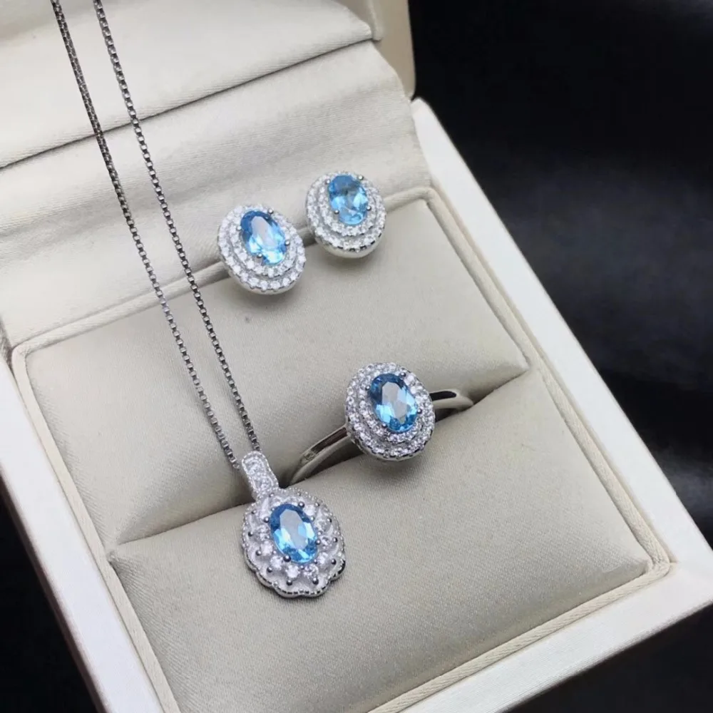 Natural Blue Topaz Jewelry Set 925 Pure Silver Ring Earrings Pendant Necklace 3 Suits Fine Wedding Jewelry for Women