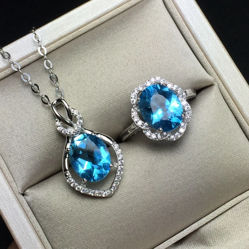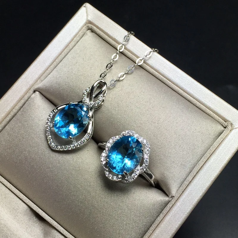 Natural Blue Topaz Jewelry Set 925 Pure Silver Ring Pendant Necklace 2 Suits Fine Wedding Jewelry for Women