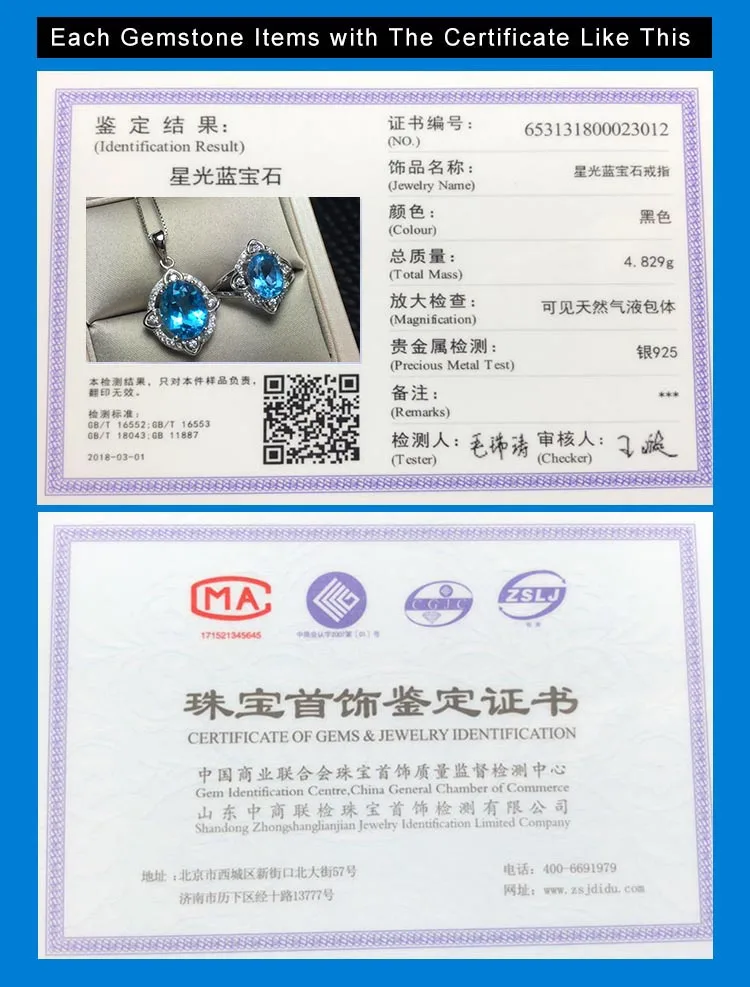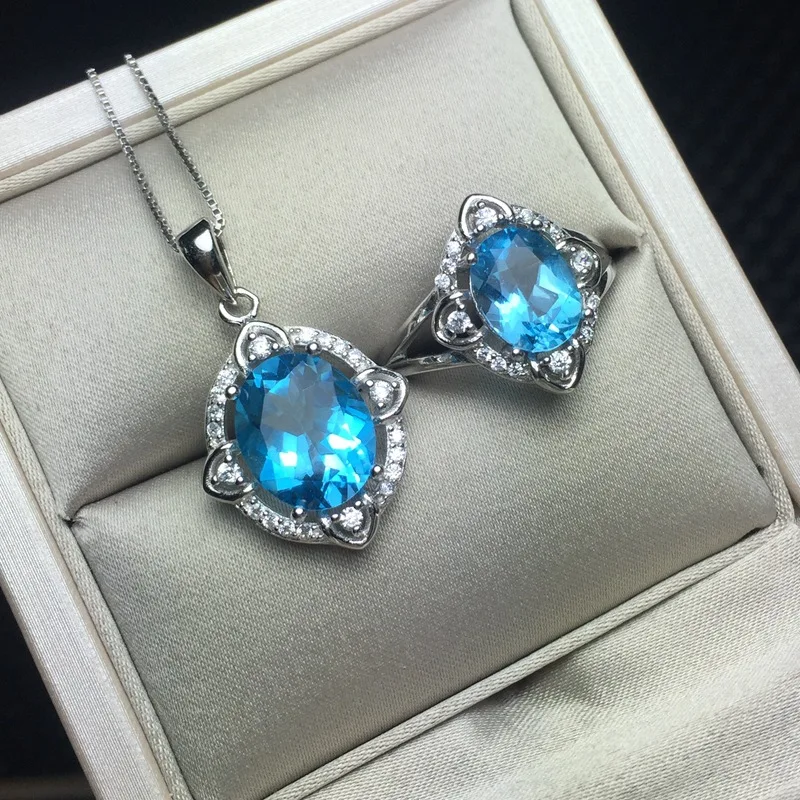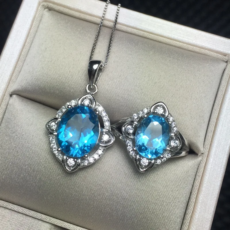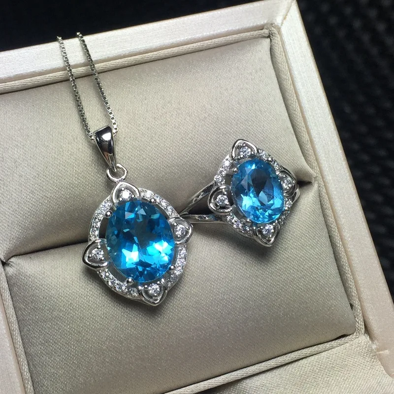 Natural Blue Topaz Jewelry Set 925 Pure Silver Ring Pendant Necklace 2 Suits Fine Wedding Jewelry for Women