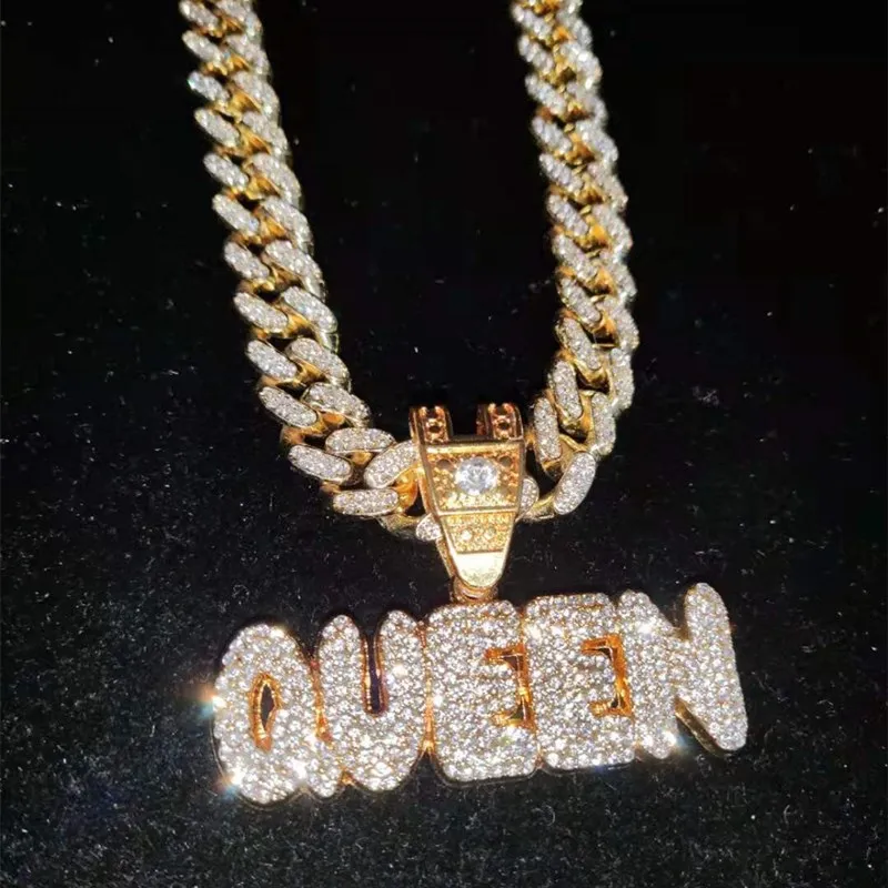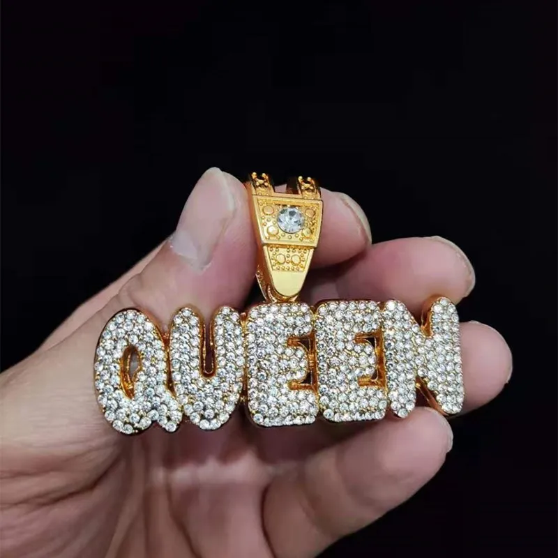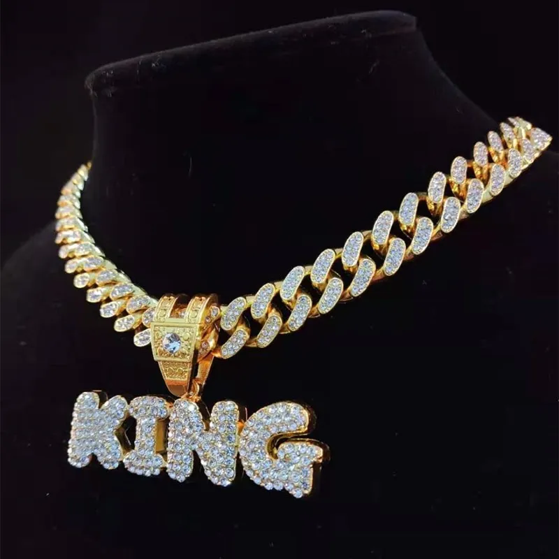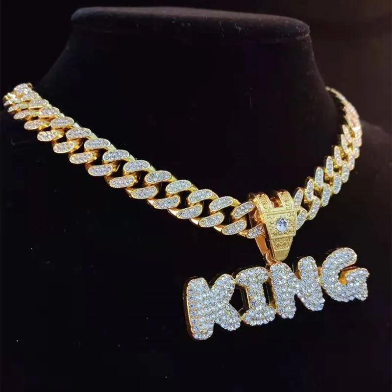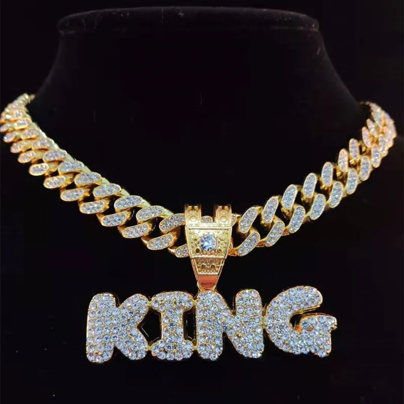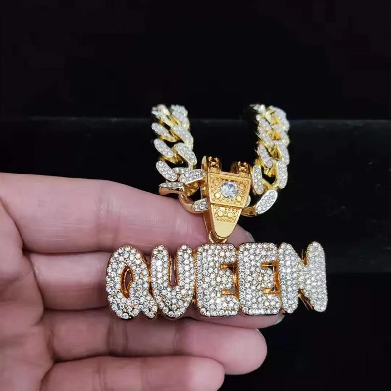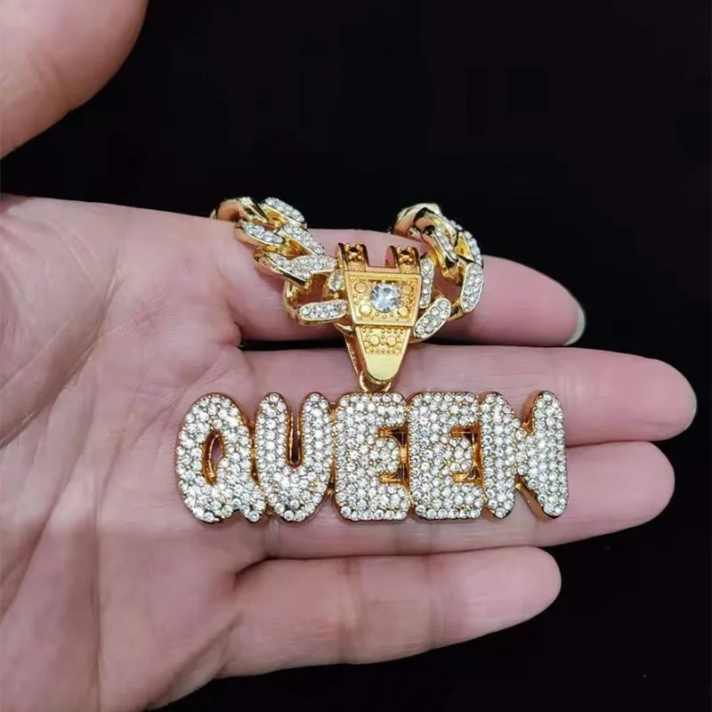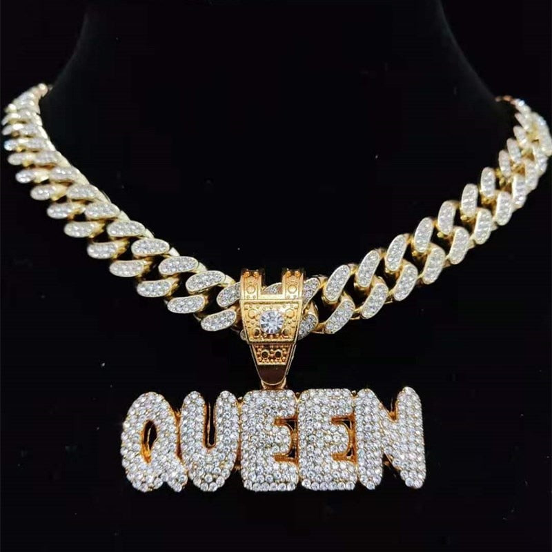 Men Women Hip Hop KING QUEEN Letter Pendant Necklace with 13mm Miami Cuban Chain Iced Out Bling HipHop Necklaces Jewelry