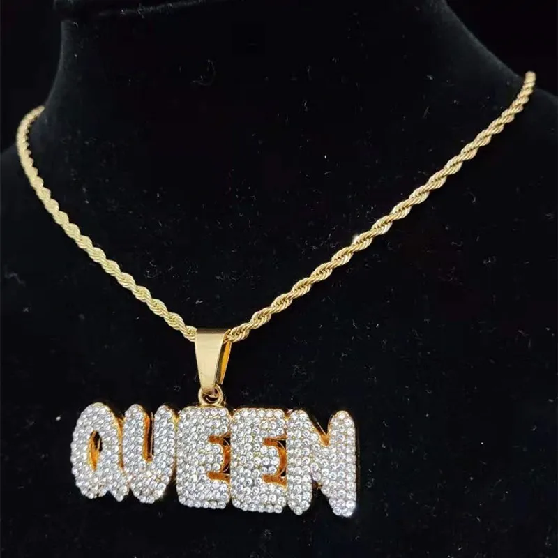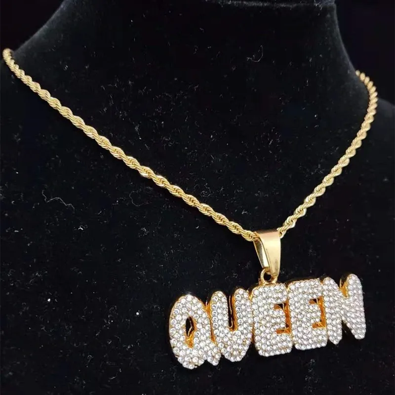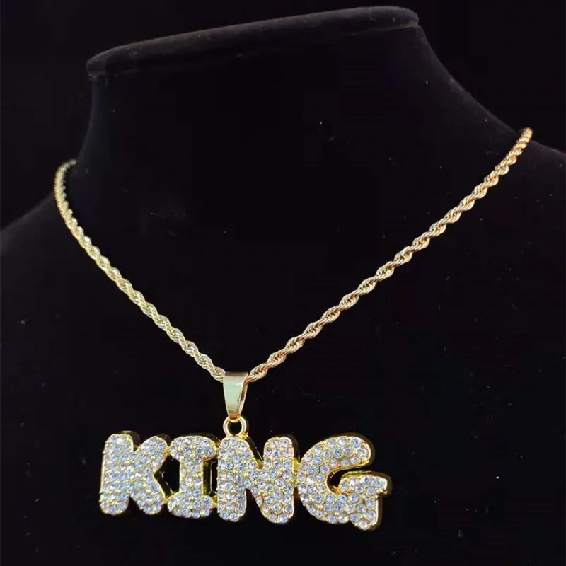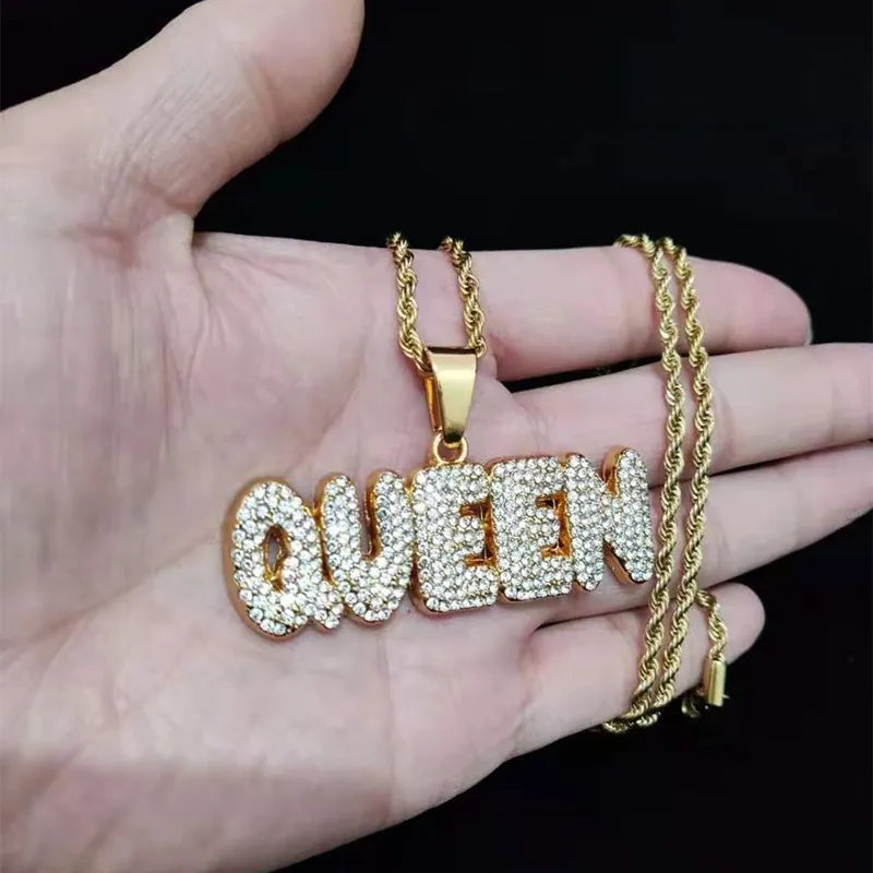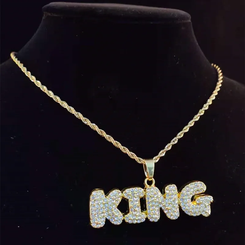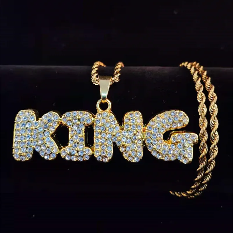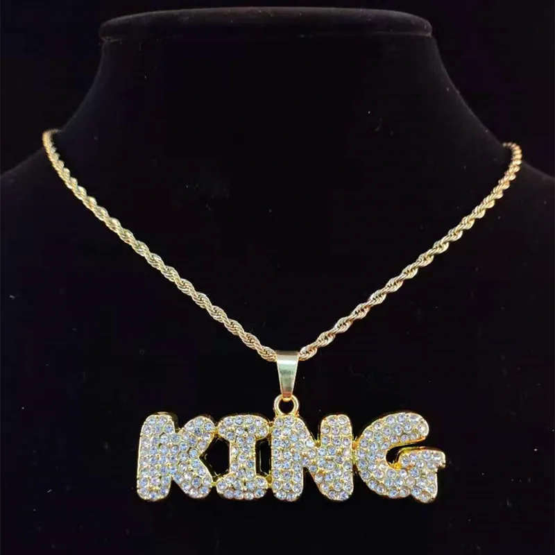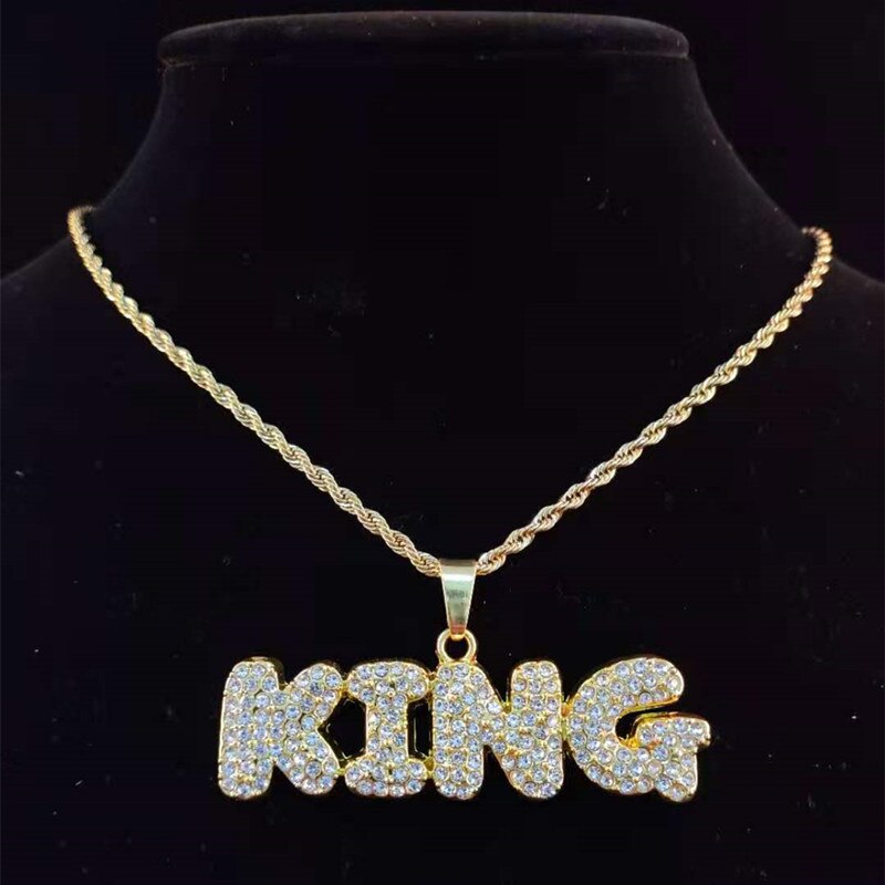 Men Women Hip Hop KING QUEEN Letter Pendant Necklace with 13mm Miami Cuban Chain Iced Out Bling HipHop Necklaces Jewelry