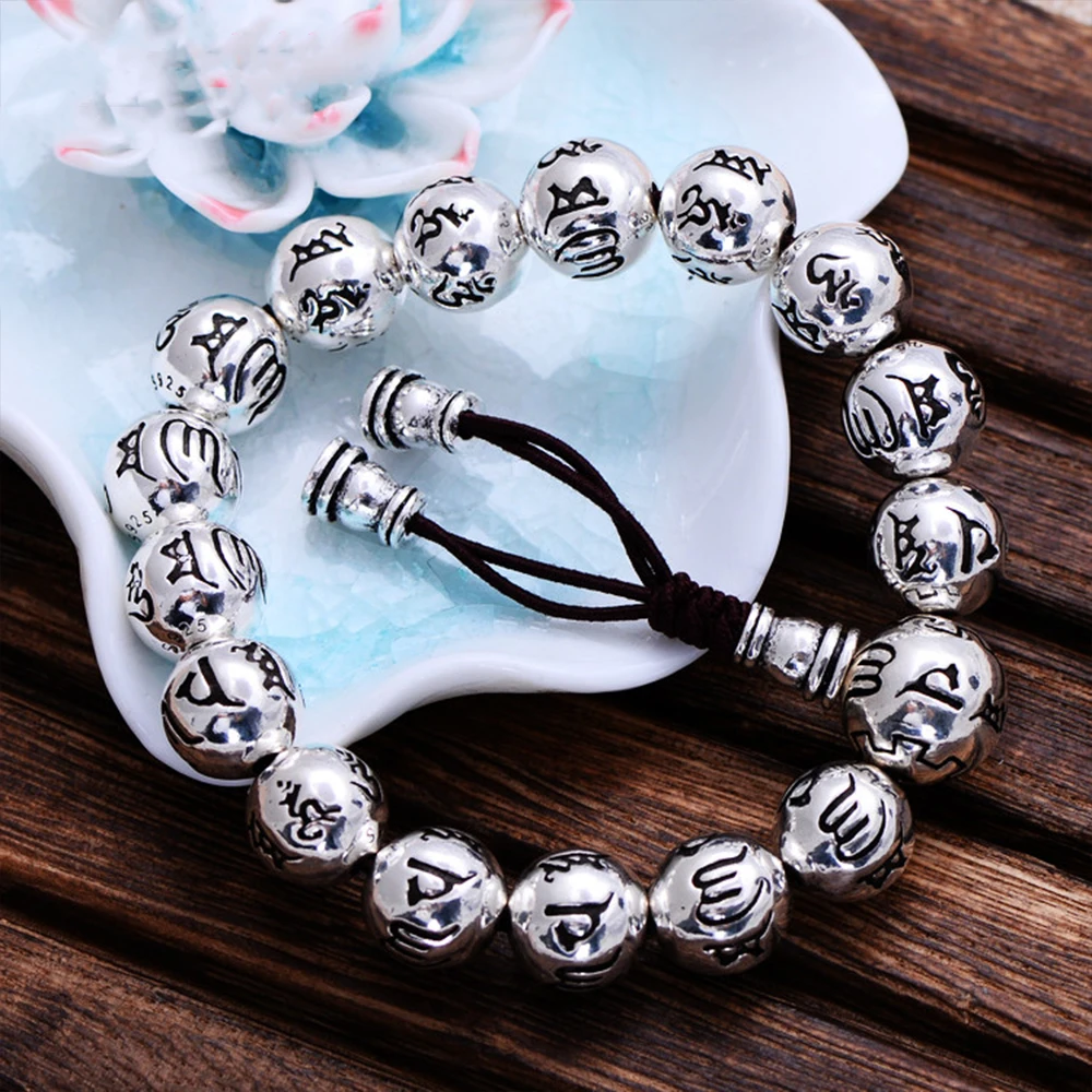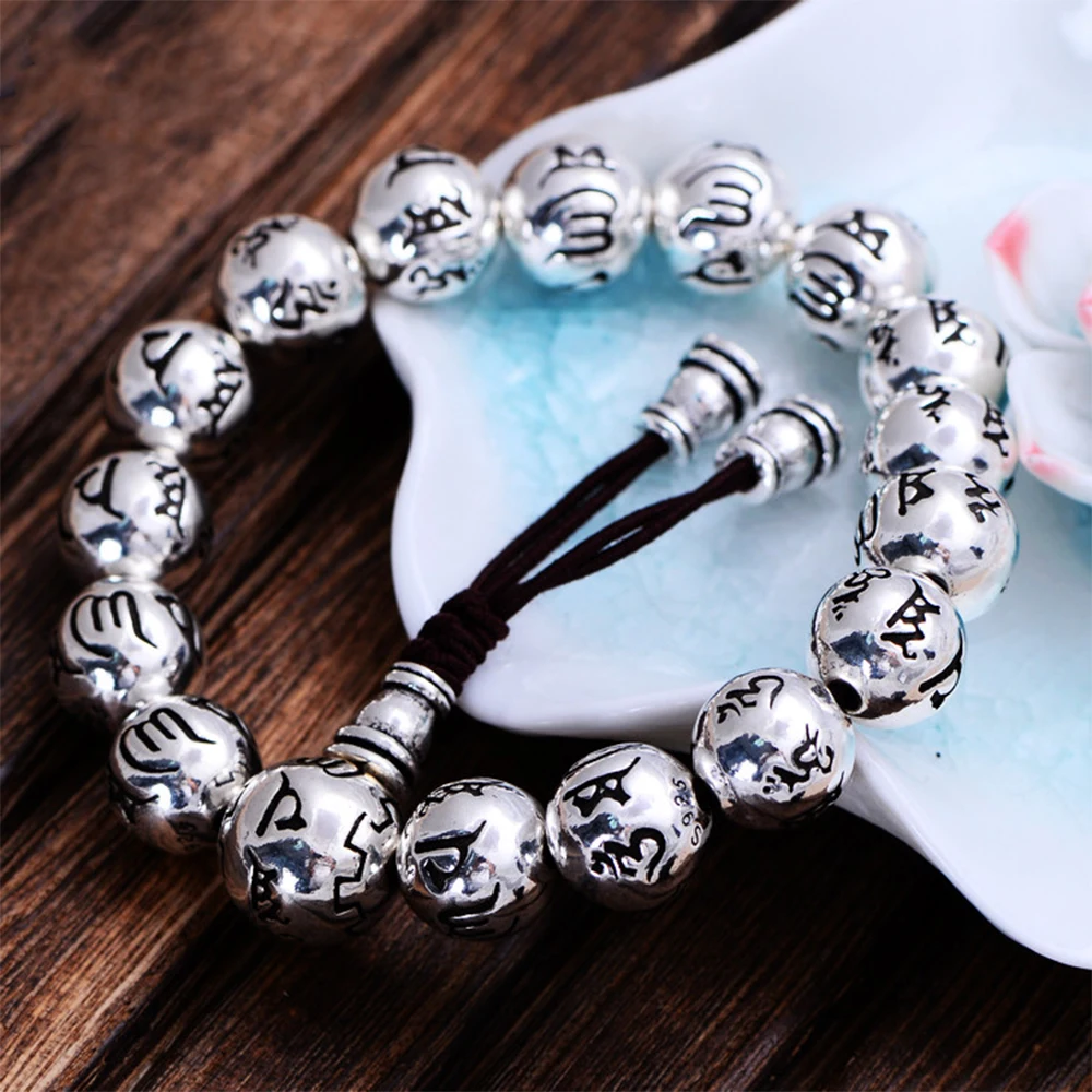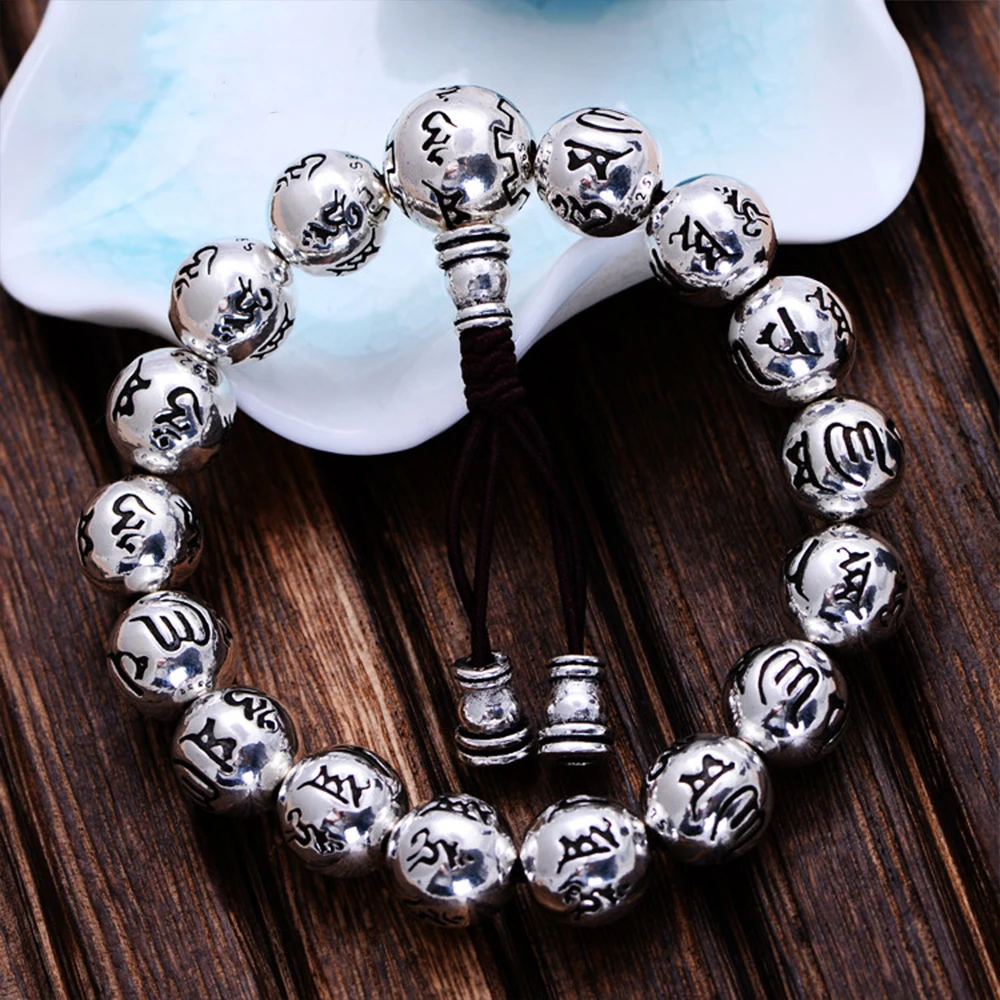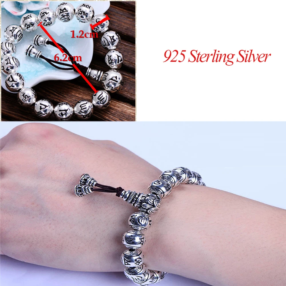 Buddhism Mantra Bracelet Solid S925 Sterling Silver Buddha Beads Bracelet for Unisex Vintage Jewelry Stretching 19-23cm