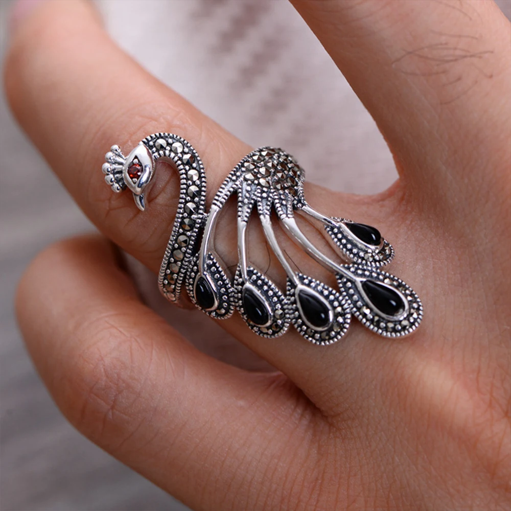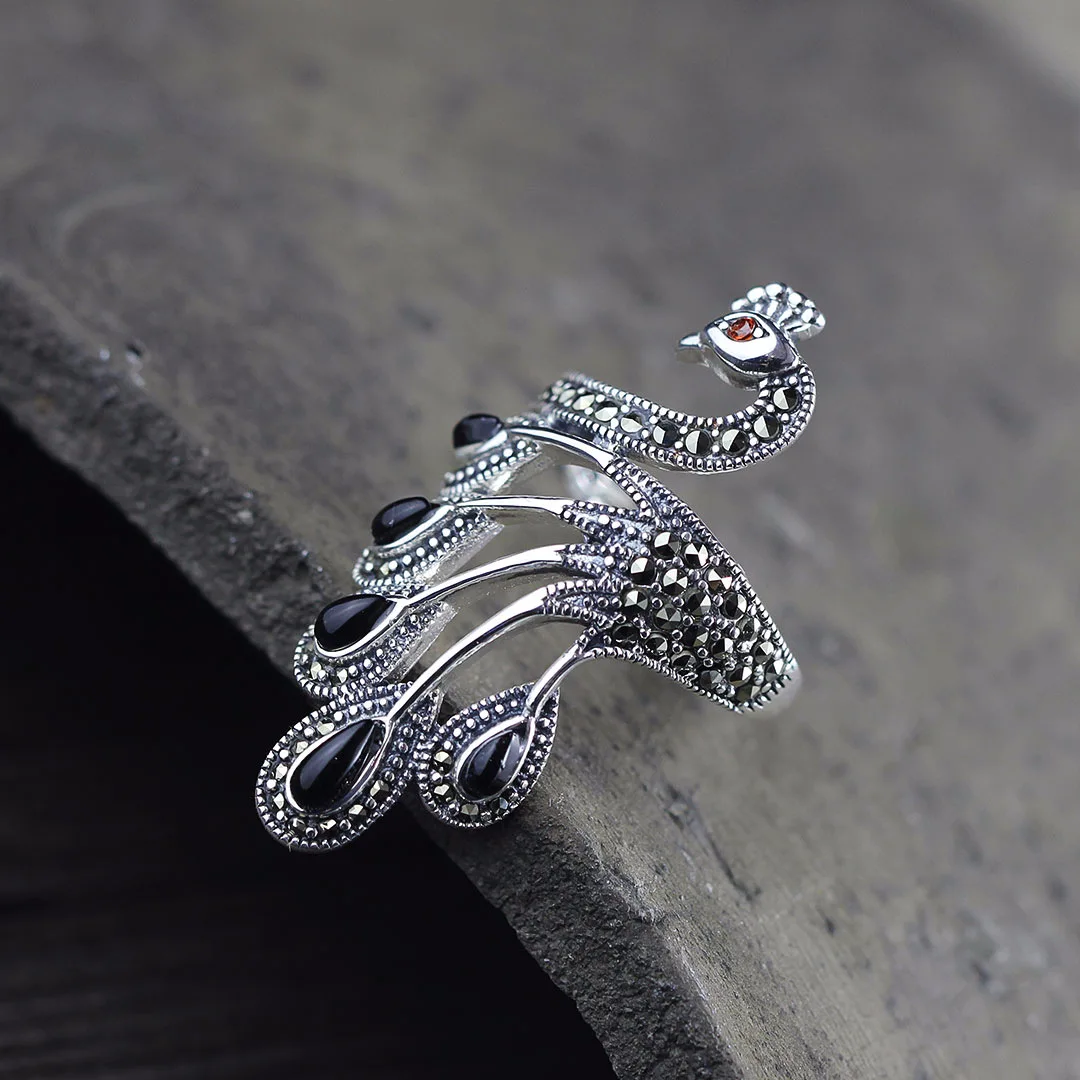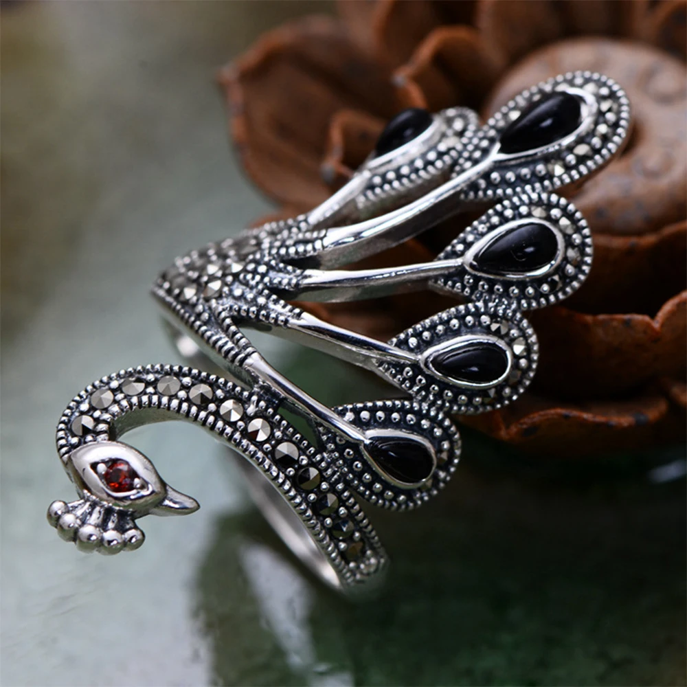 Natural Agate Ring with Ruby Solid 925 Sterling Silver Zircon Ring for Women Vintage Thai Silver Fine Jewelry Open Ring