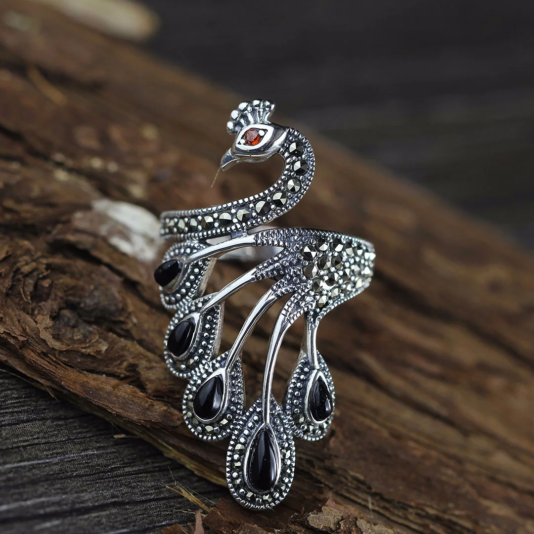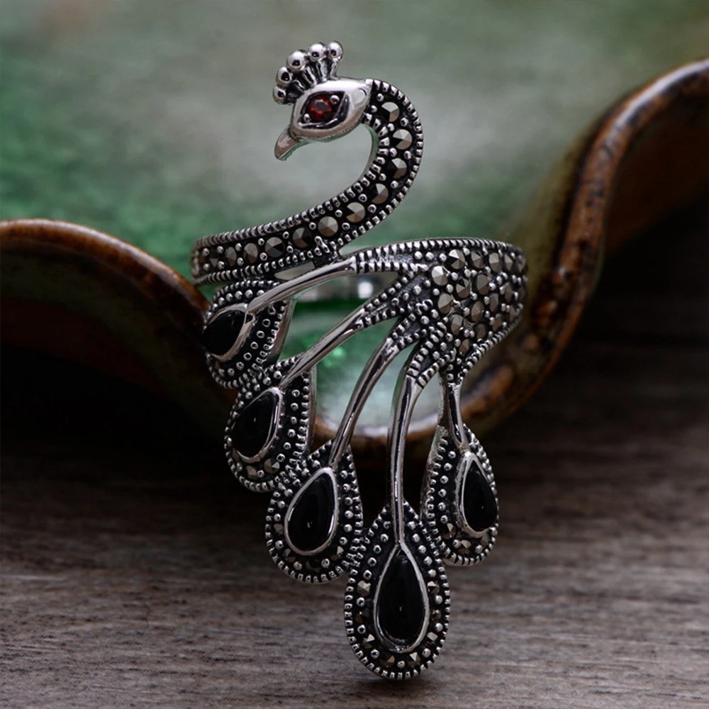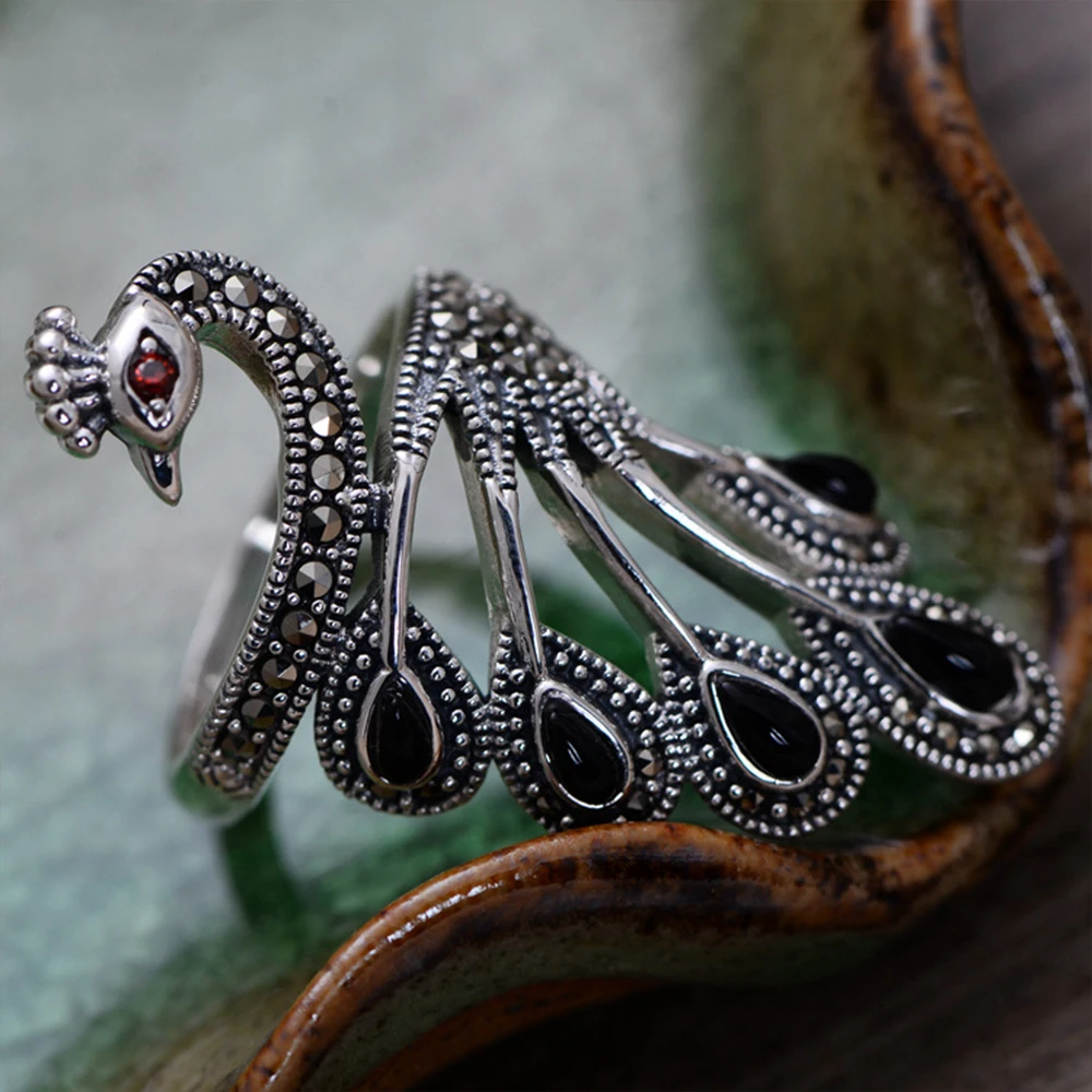 Natural Agate Ring with Ruby Solid 925 Sterling Silver Zircon Ring for Women Vintage Thai Silver Fine Jewelry Open Ring