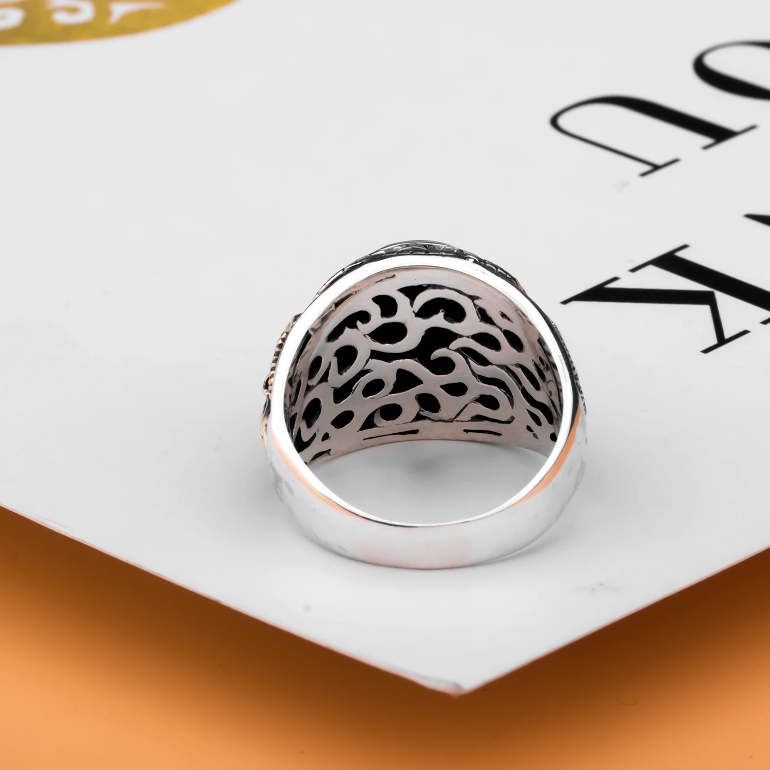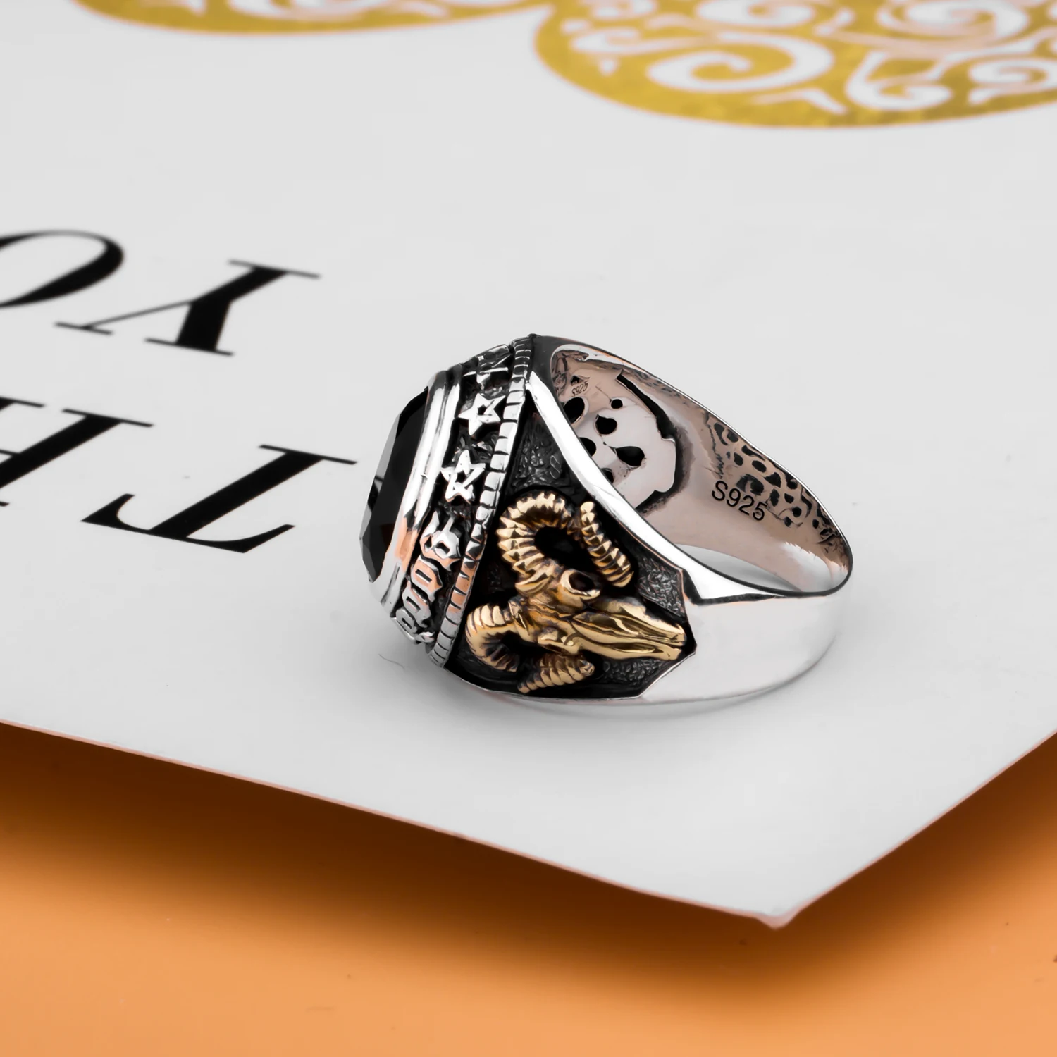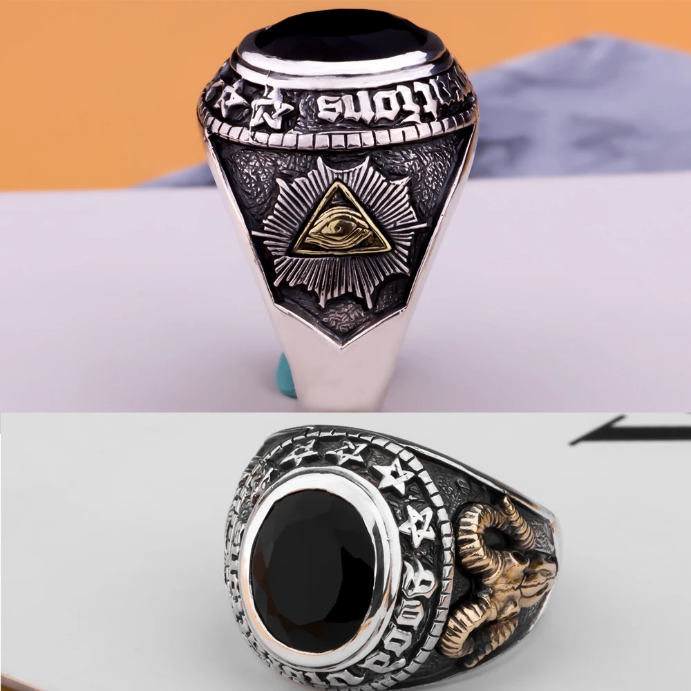 Pentagram Goat's Head Satan and God's Eye Ring Solid 925 Sterling Silver Agate Ring Hand-carved Religious Jewelry
