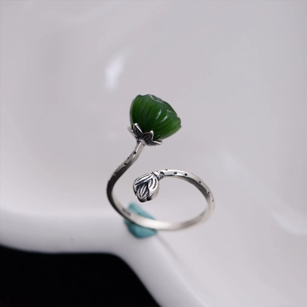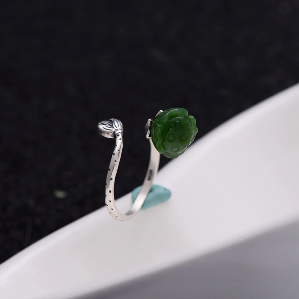 Vintage Frosted Lotus Rings Inlaid Natural Jasper Ring Solid 925 Sterling Silver Open Ring for Women's Fine Jewelry