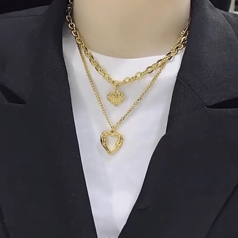 MEYRROYU 316L Stainless Steel Double Layered Love Heart Pendant Necklace For Women Vintage Punk Golden Clavicle Chain Jewelry