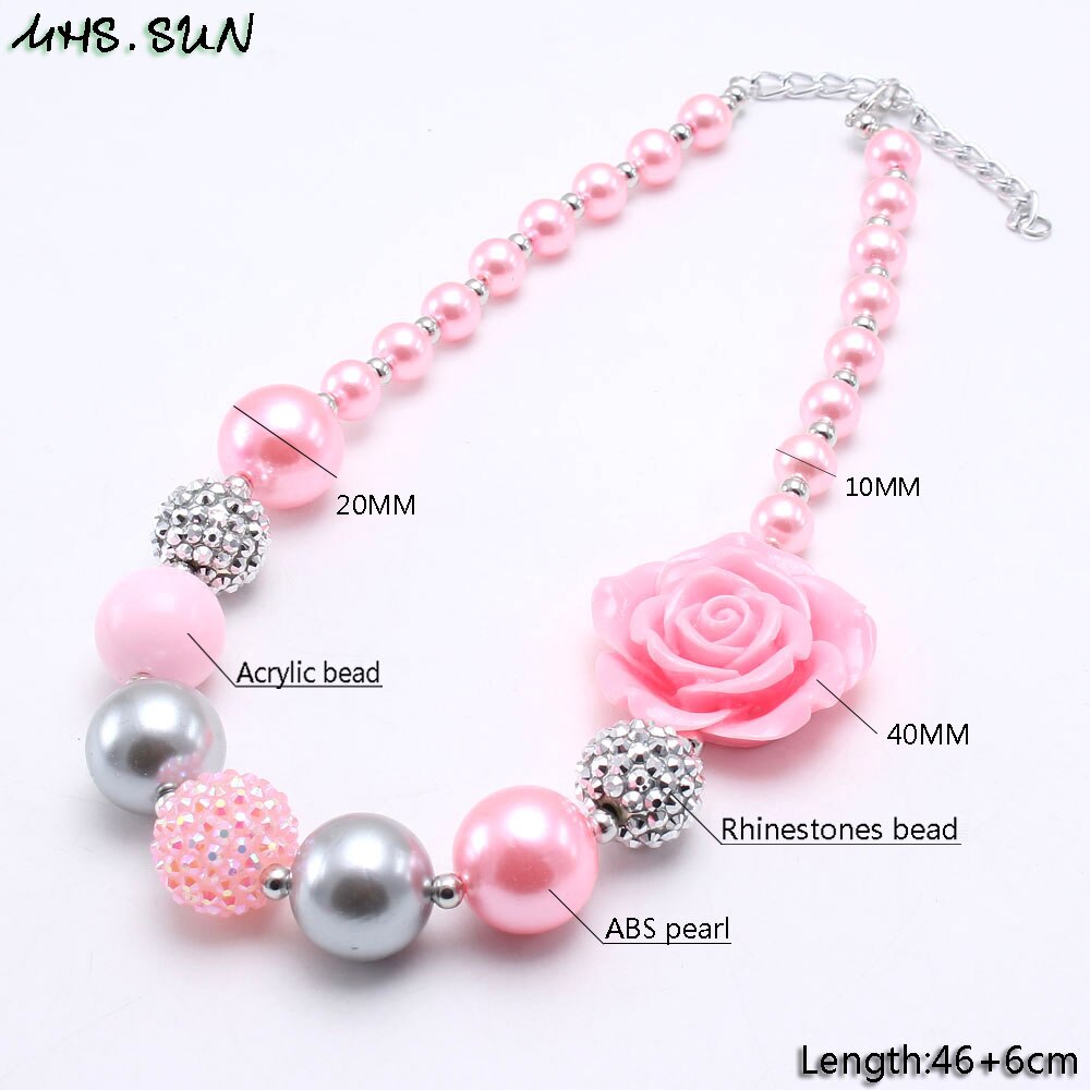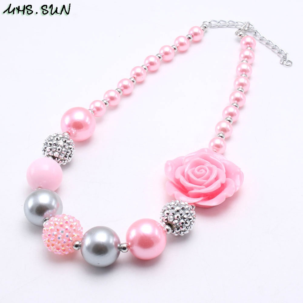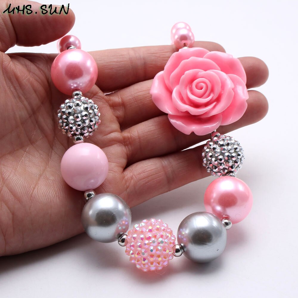 MHS.SUN Pink Style Girls Kids Chunky Beads Necklace With Rose Flower Child Bubblegum Beaded Necklace Chunky Jewelry 1PCS