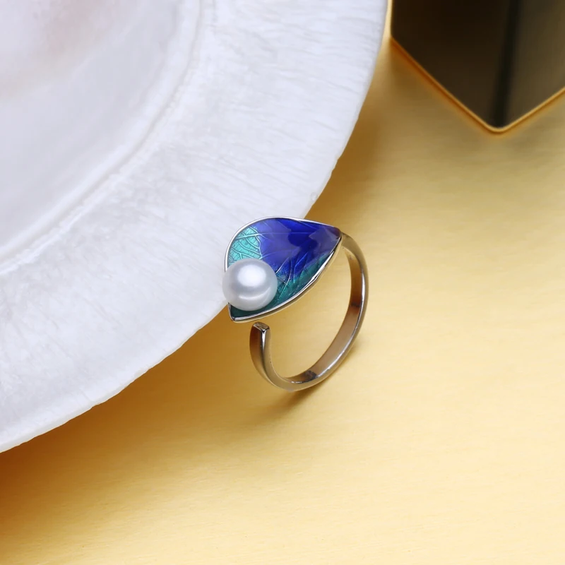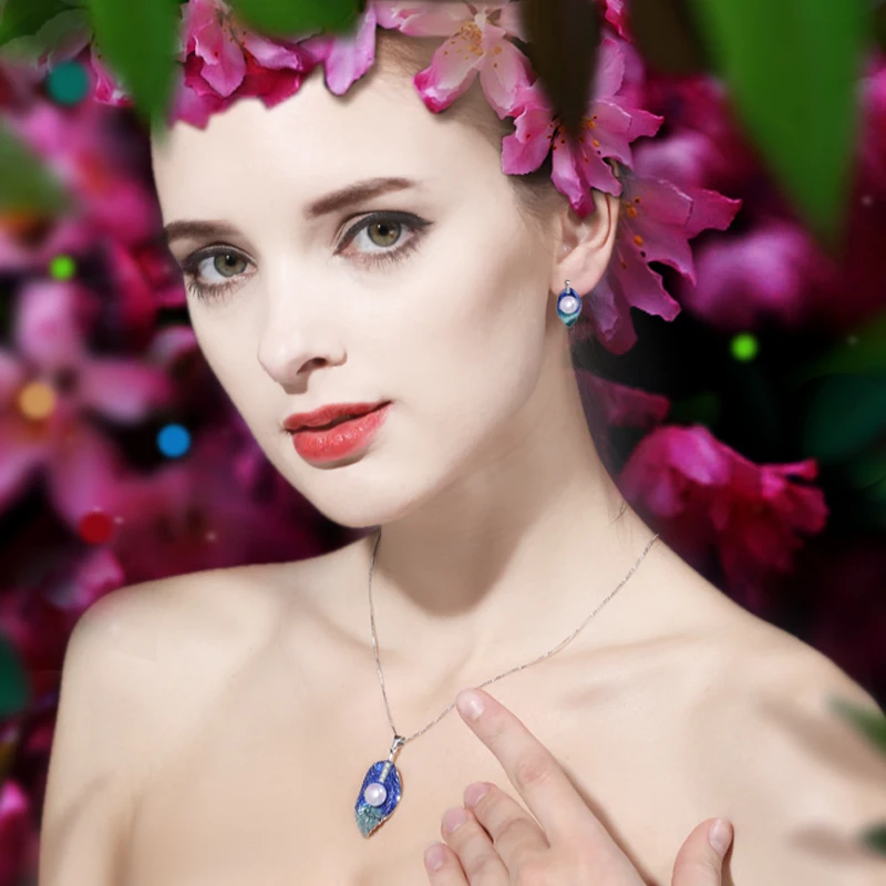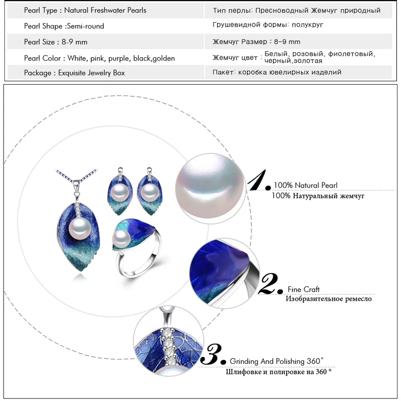Pearl Jewelry sets 925 Sterling Silver stud earrings,natural Pearl leaf necklace for women love Cloisonne earrings ring