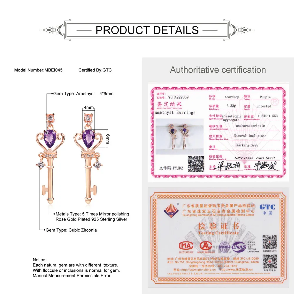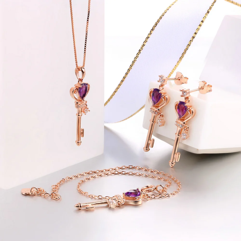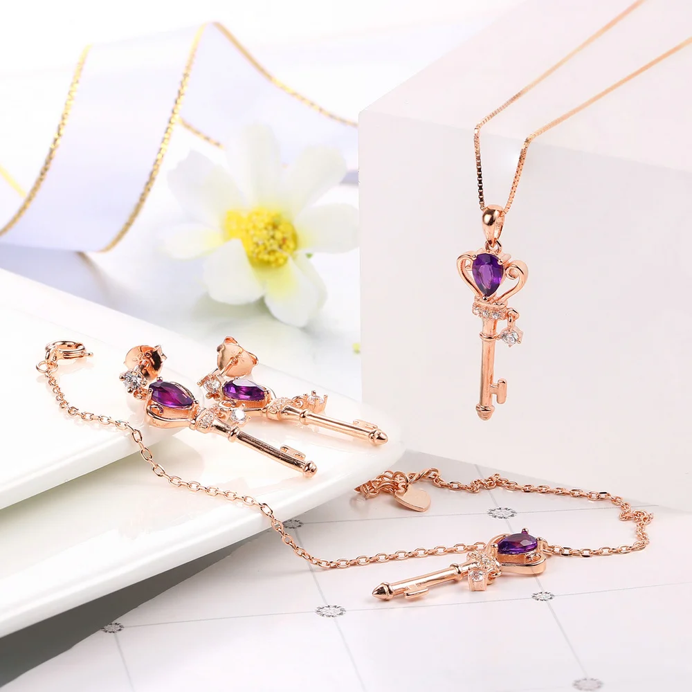 3pcs Keys Jewelry Sets 100% 925 Sterling Silver Natrual Gemstone Amethyst For Women Engagement Fine Jewelry V010EHN