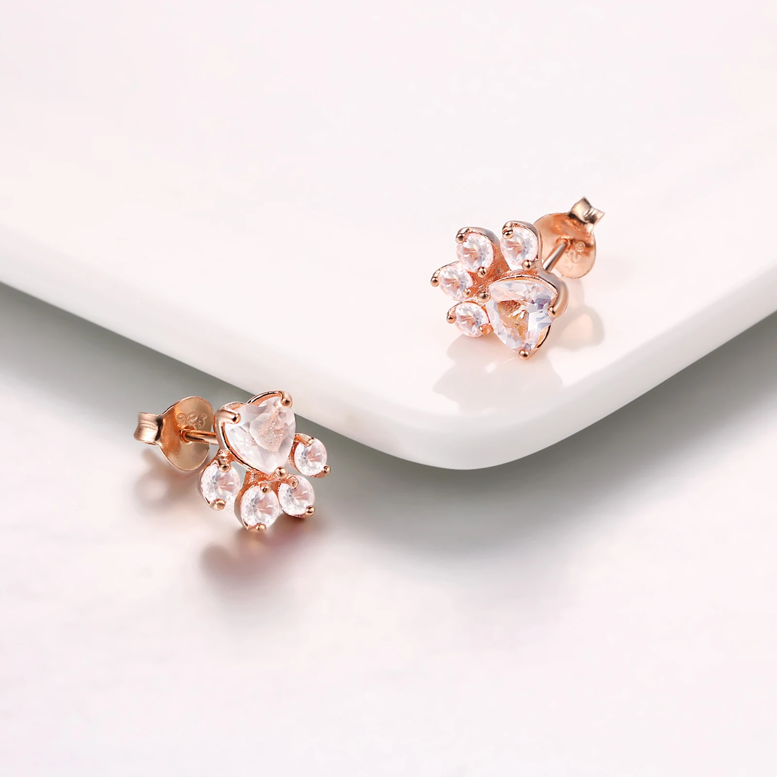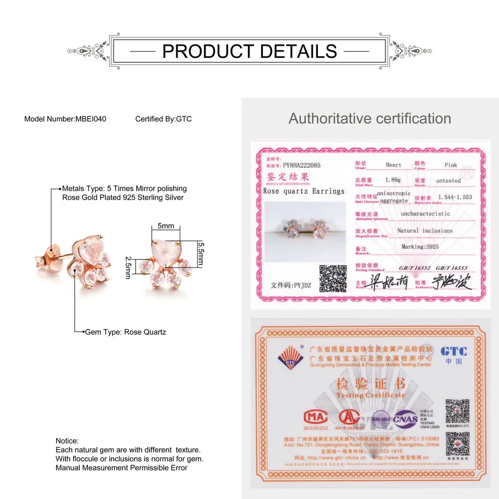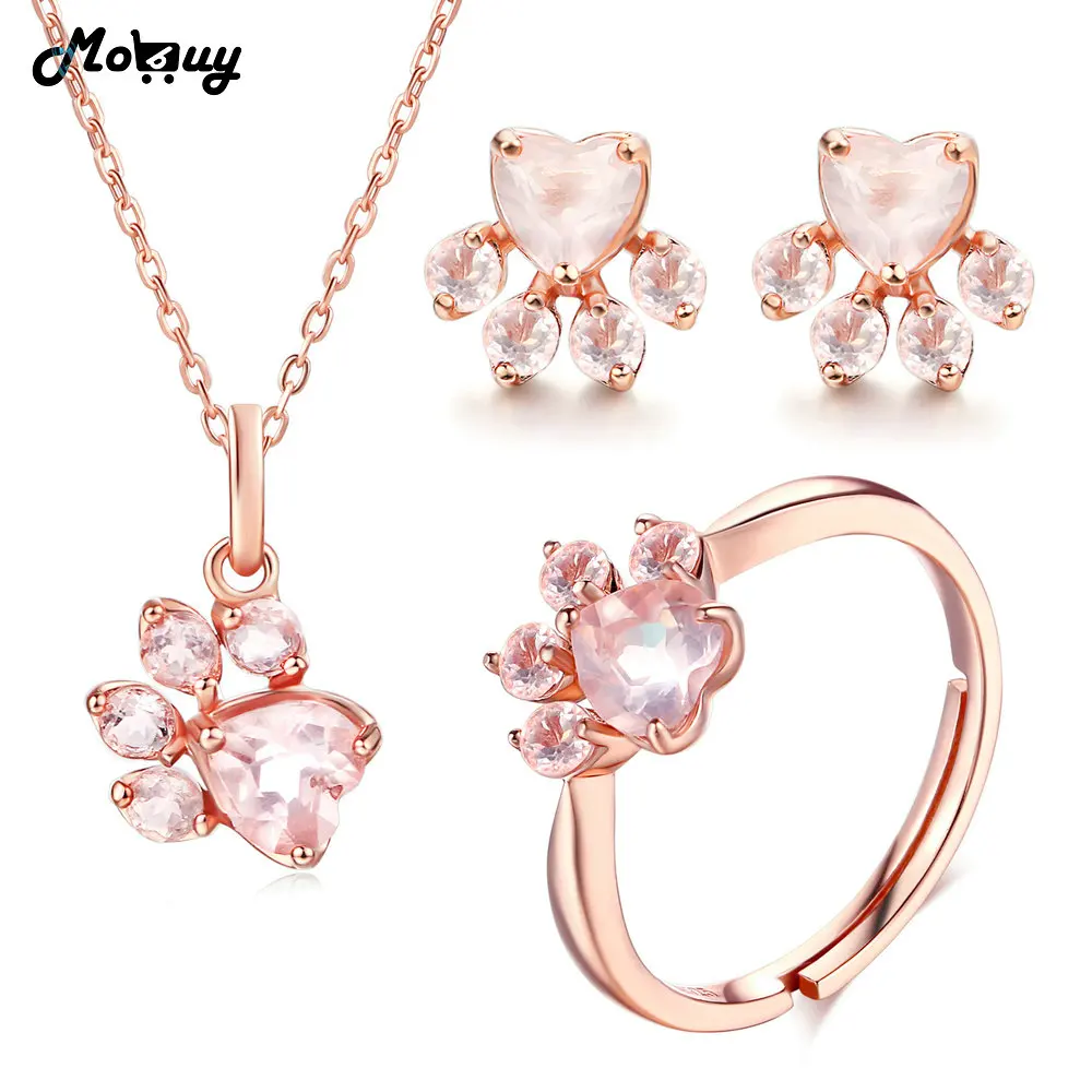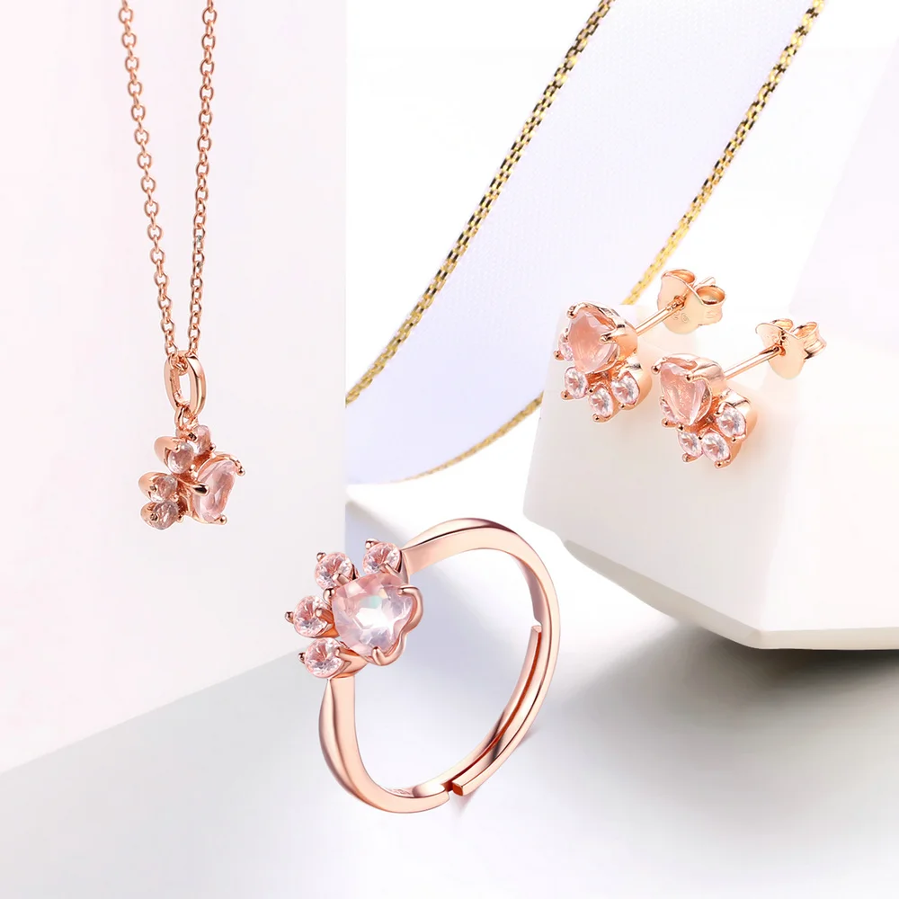 Cute Bearfoot Natural Gemstone Pink Rose Quartz 100% 925 Sterling Silver 3pcs Jewelry Sets For Women Fine Jewelry V035-ENR