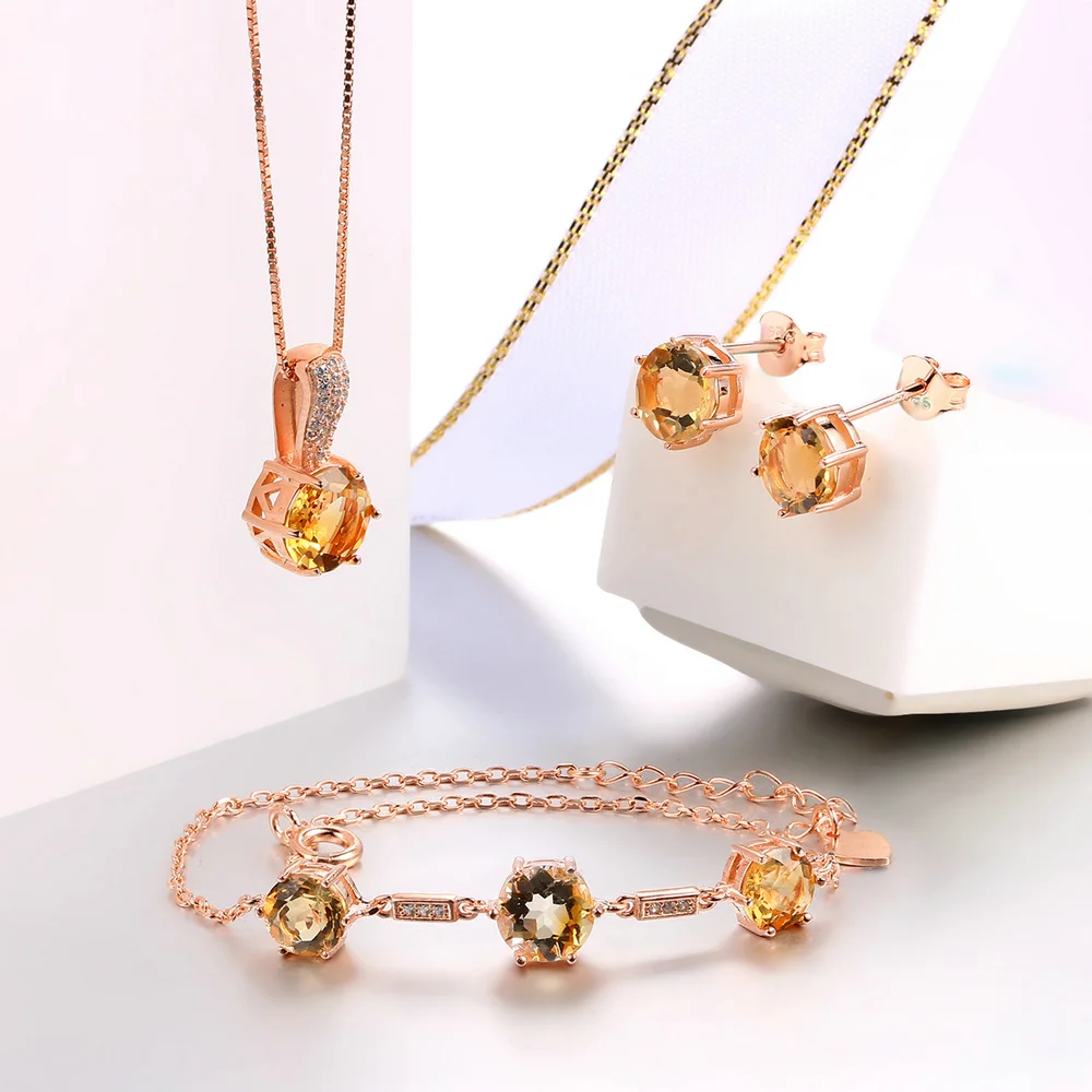 Wedding Jewelry Set Natural Gemstone Yellow Citrine 100%925 Sterling Silver 3PCS Fine Jewelry For Women Engagement V002EHN