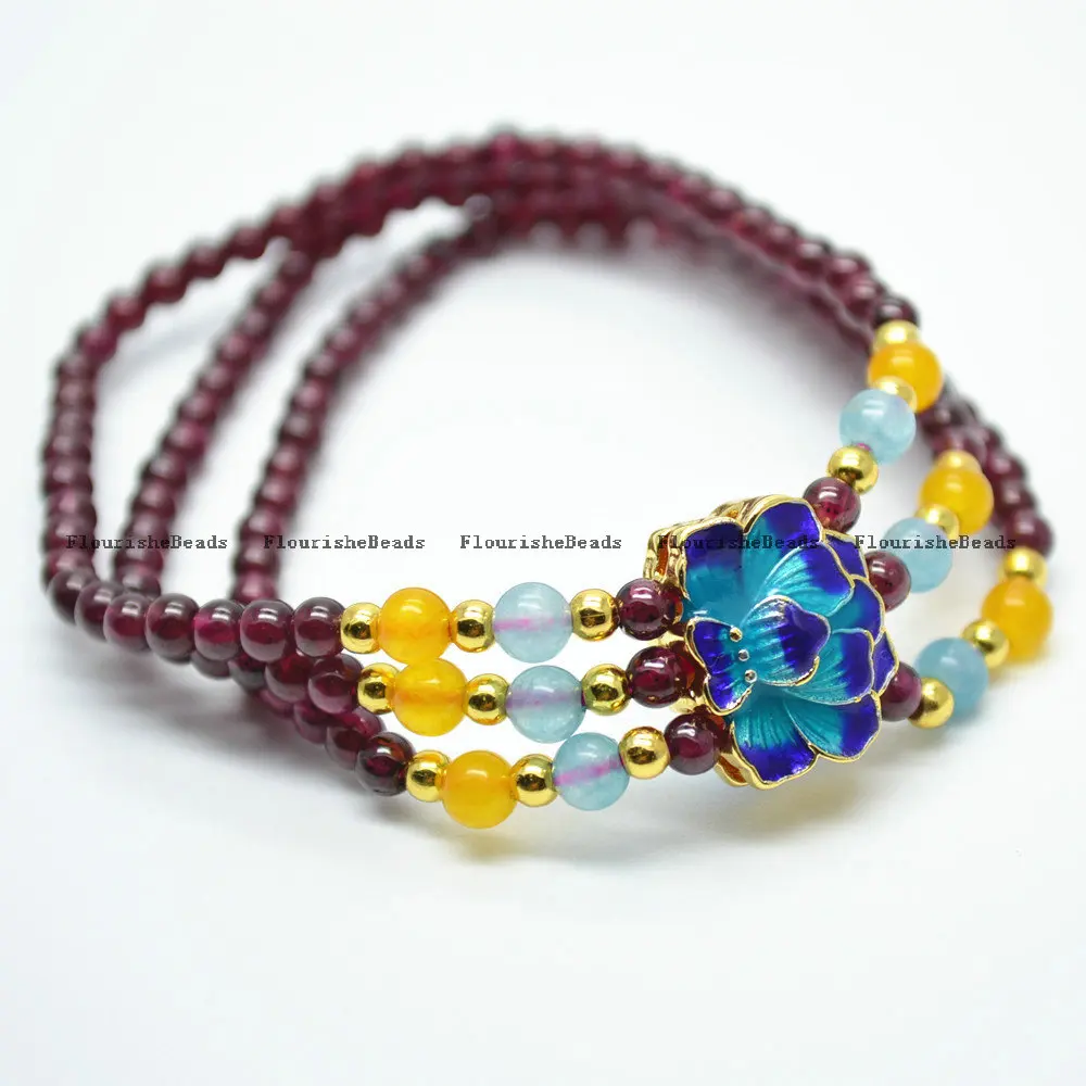 Multi Rows Natural Garnet Stone Round Beads Cute Lotus Metal Cloisonne Enamel Charm Bracelet Fashion Woman Party Jewelry