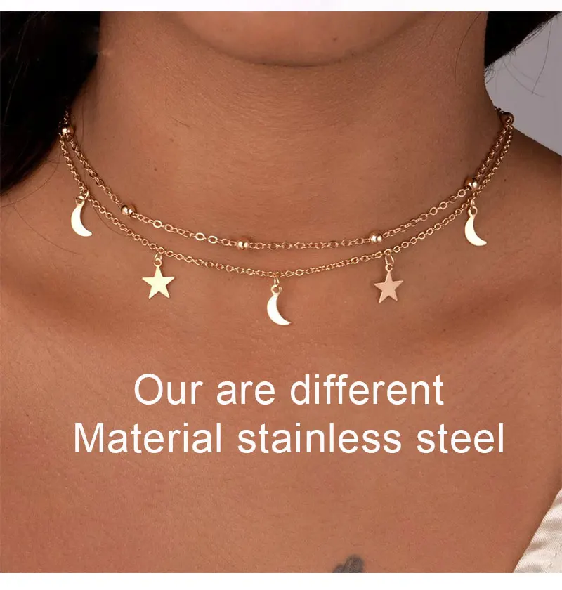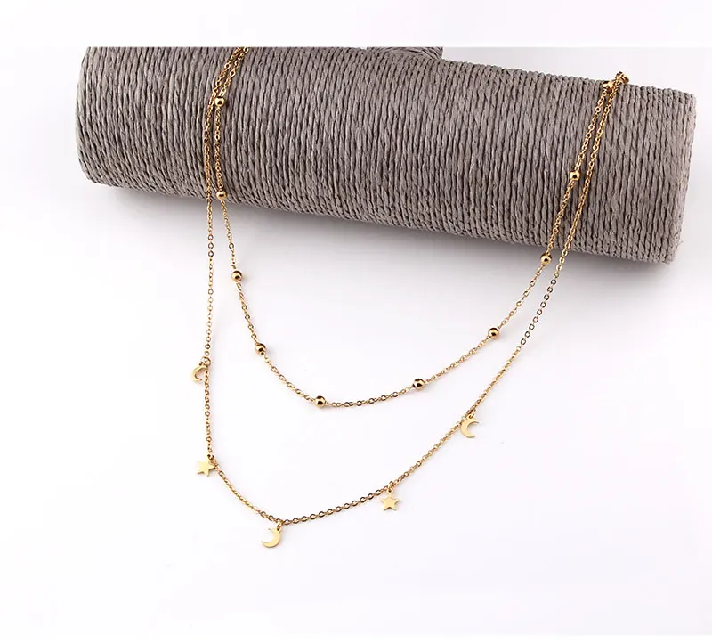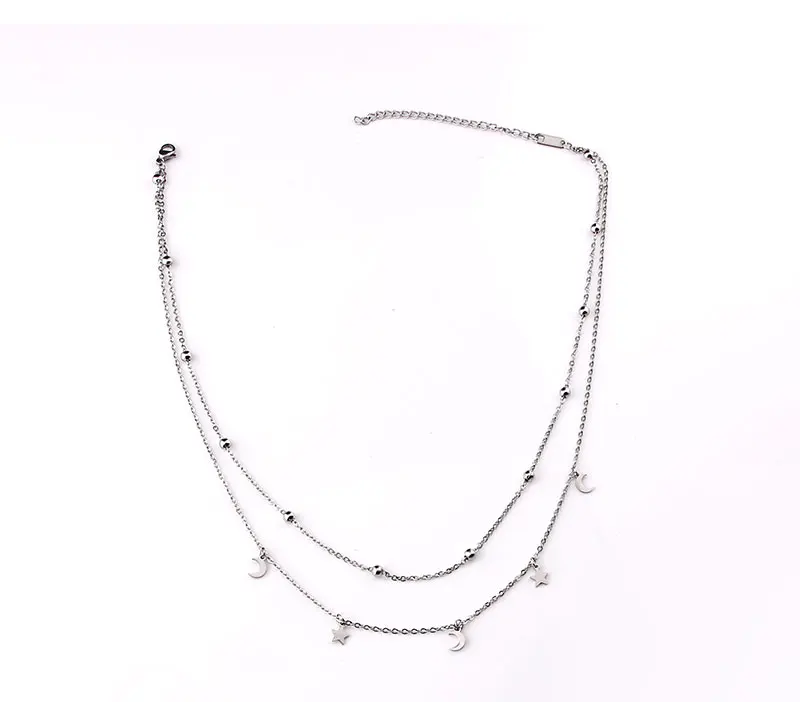 Multilayer Stainless Steel Endant Women Gold Silver Color Beads Moon Star Horn Crescent Double Chain Choker Layered Necklaces