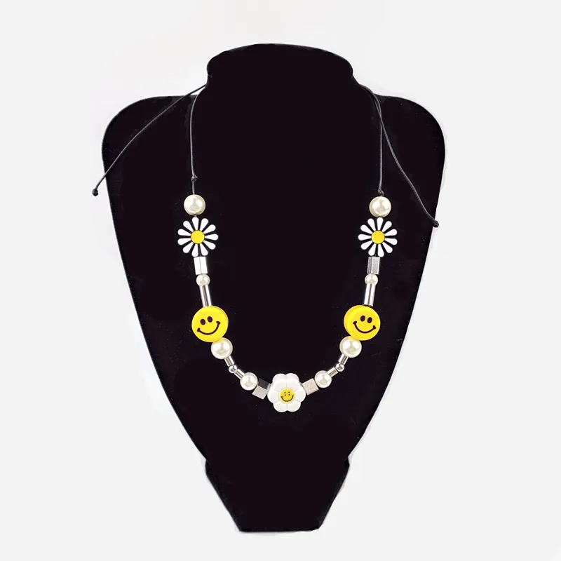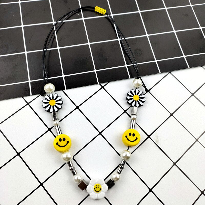 National Tide Daisy Pearl Titanium Steel Beaded Necklace Sun Flower Anti-War Smiley Face Hip Hop Stitching Necklace