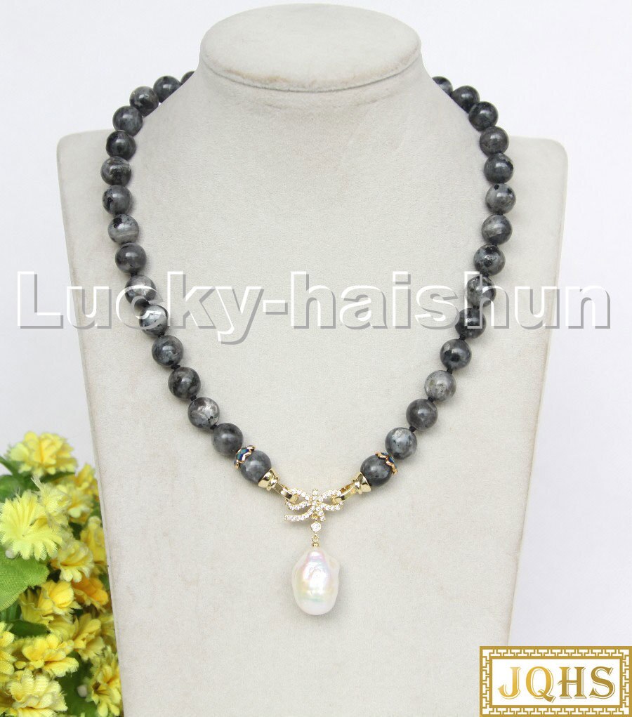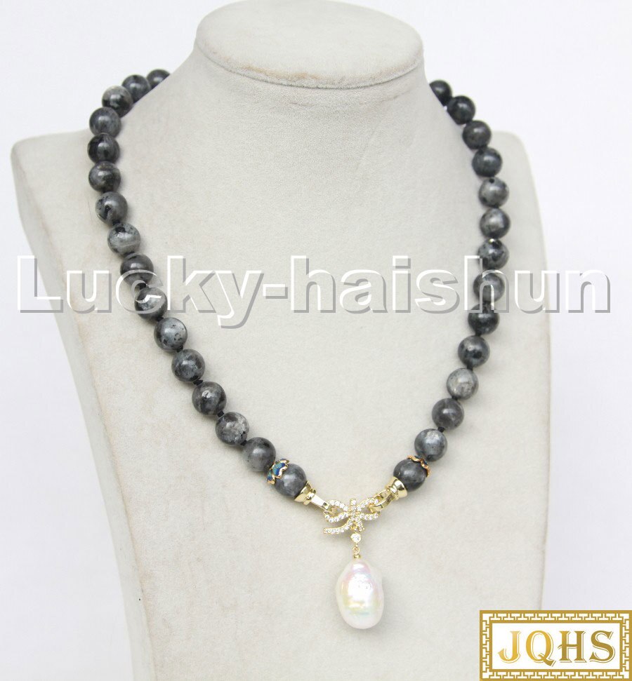 natural 18" 10mm round gray Rainbow labradorite white keshi pearl pendant necklace c329