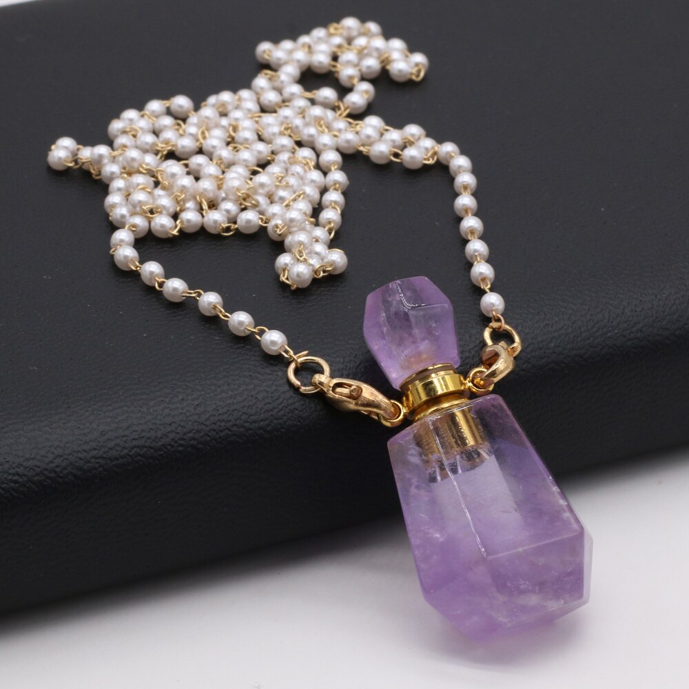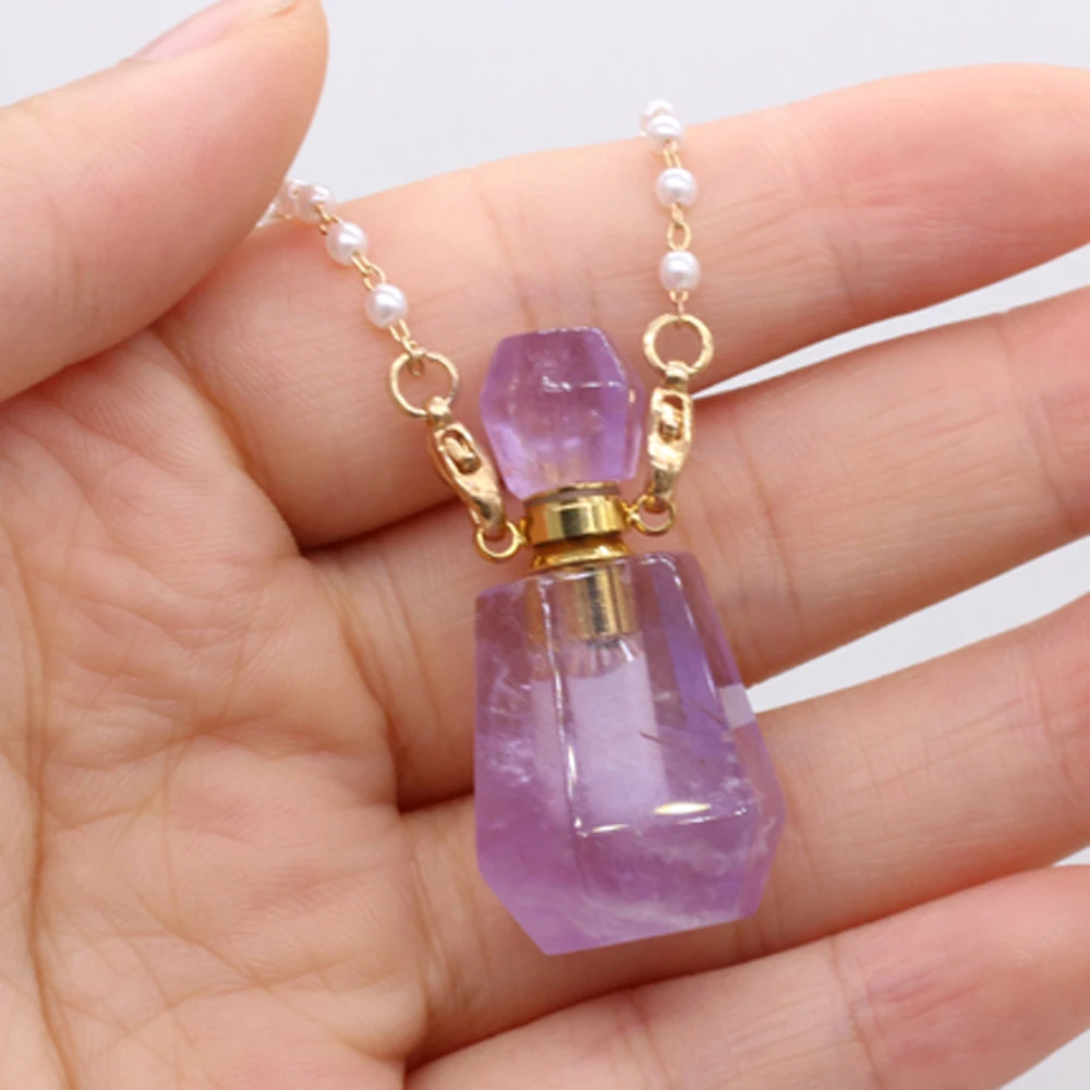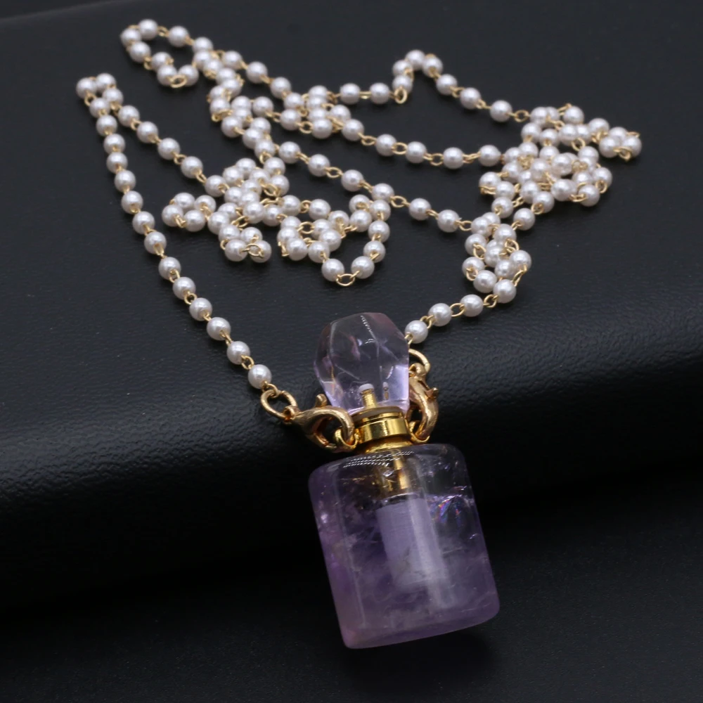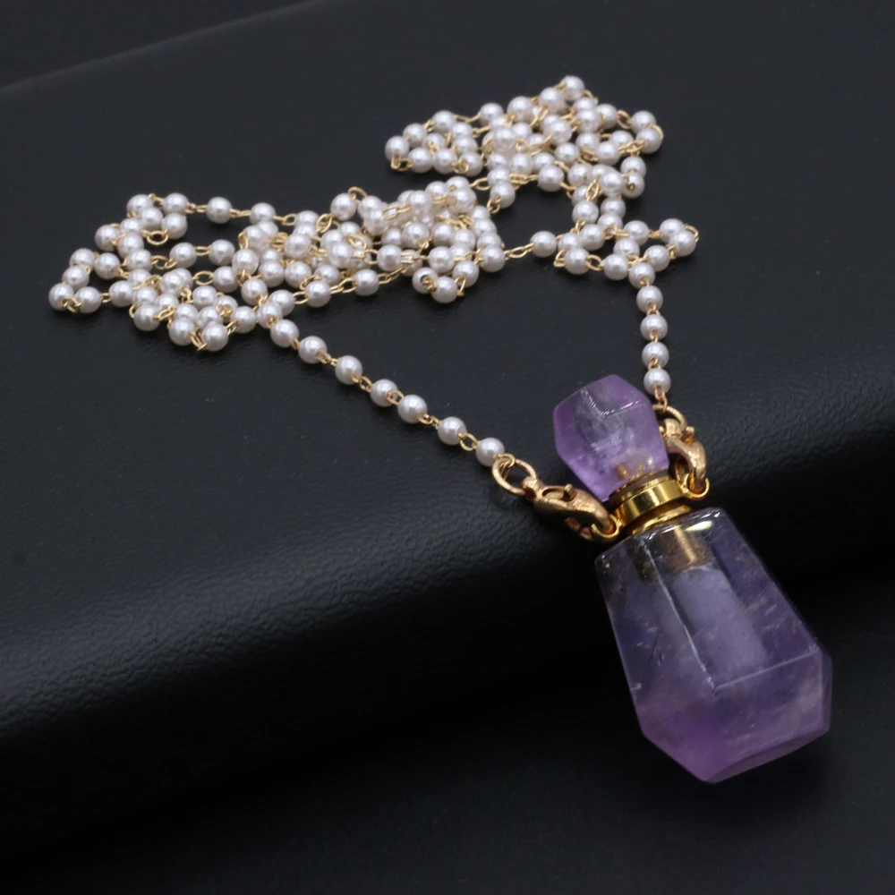 Natural Amethysts Perfume Bottle Pendant Necklace Pearl Chains Essential Oil Diffuser Agates Pendant Necklace For Women Jewerly