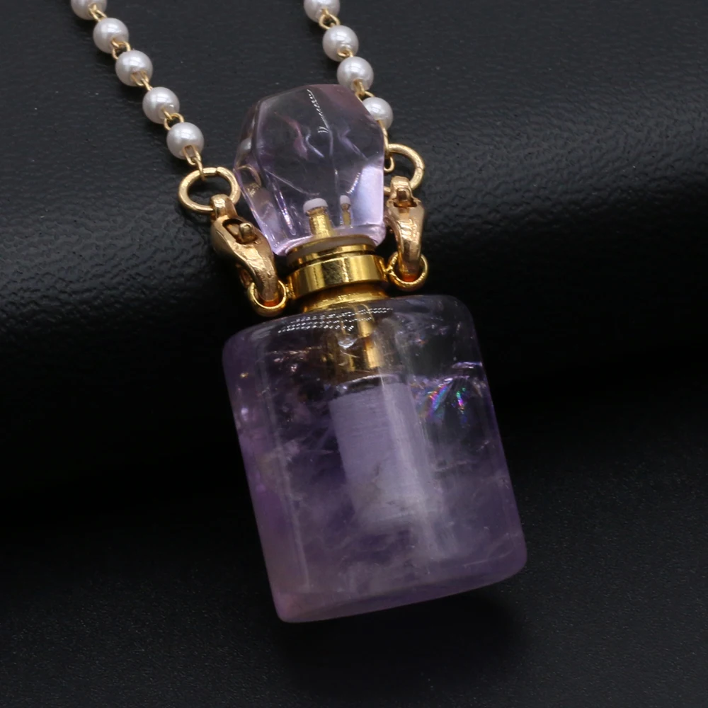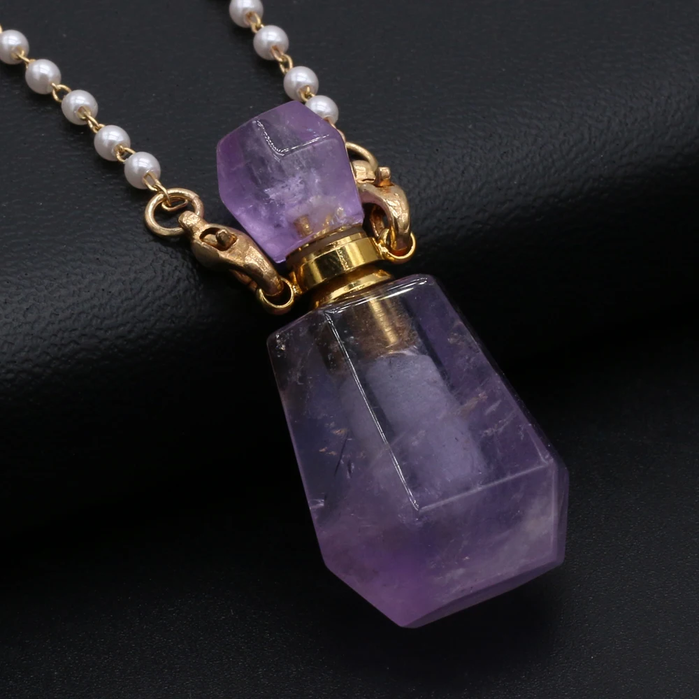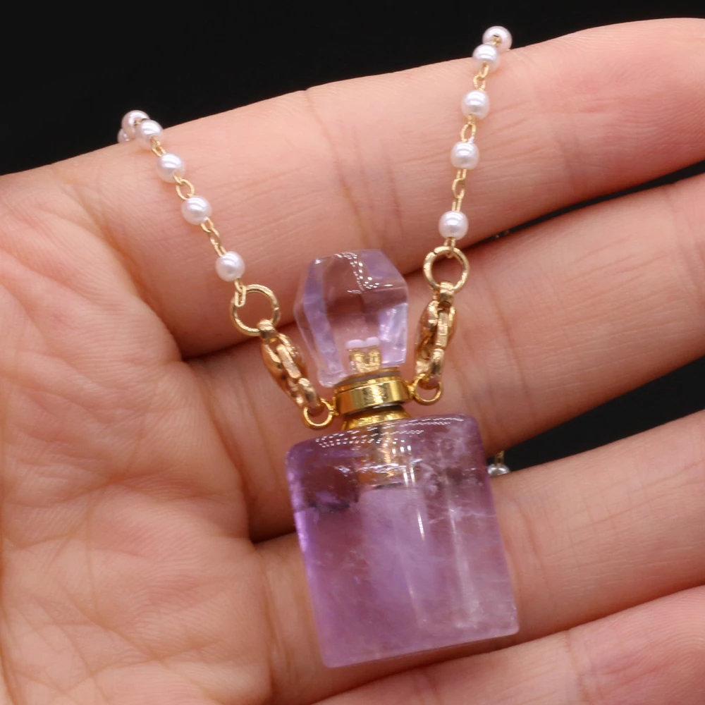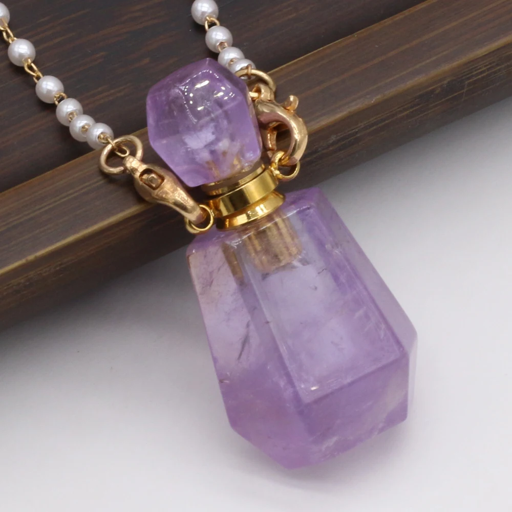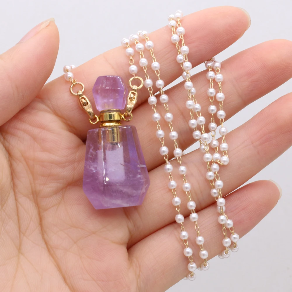 Natural Amethysts Perfume Bottle Pendant Necklace Pearl Chains Essential Oil Diffuser Agates Pendant Necklace For Women Jewerly
