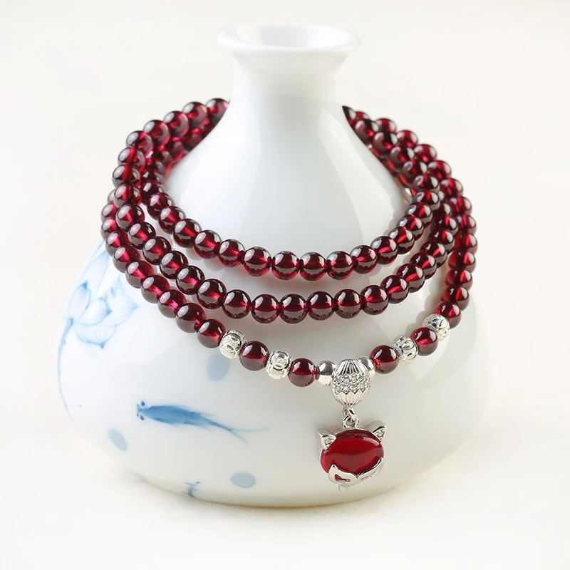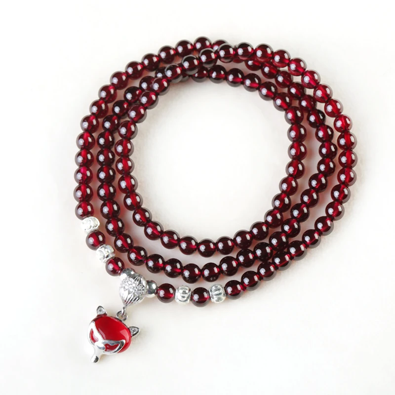 Natural Garnet Bracelets Wine Red Bead with Fox Pendant 925 Sterling Silver Bracelet for Women Girl Crystal Multiplayer Jewelry