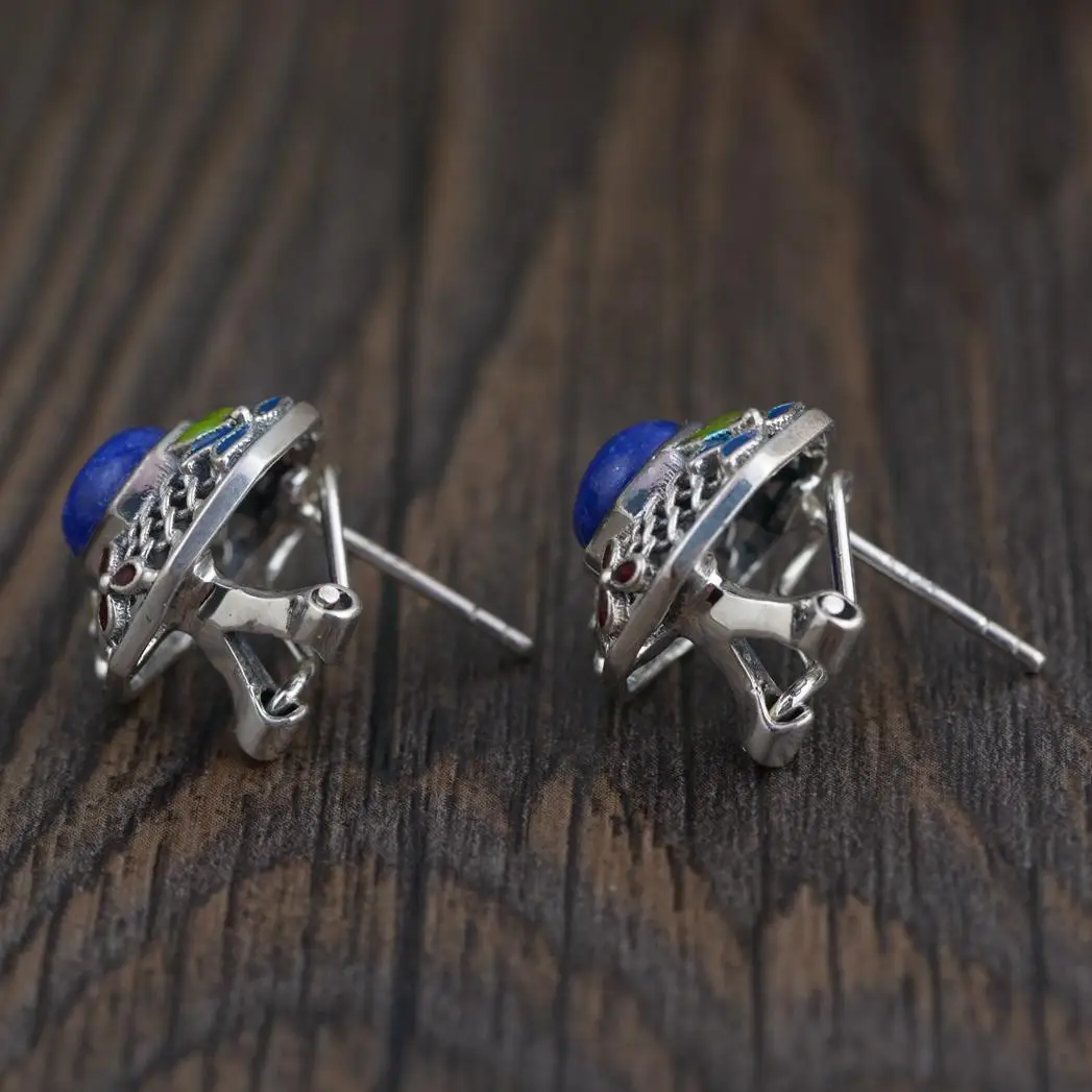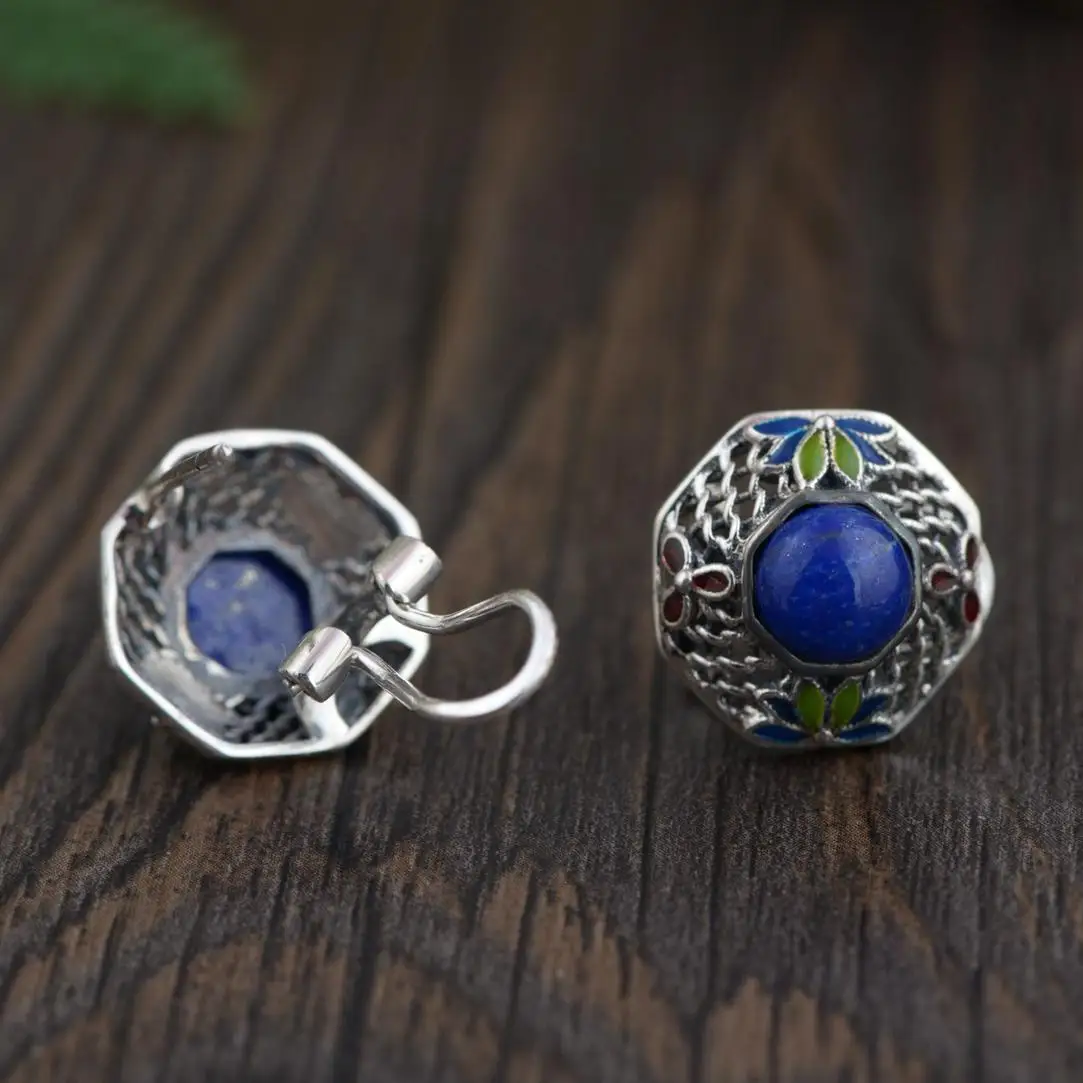 Natural Lapis Lazuli Clip Earrings 925 Silver Sterling Enameling Flowers Earrings For Women Vintage Style