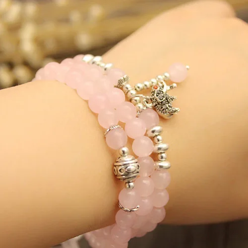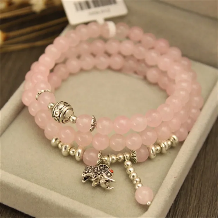 Natural Rose Quartz Crystal Stone Korea Fashion Beaded Bracelets Silver Color Elephant Pendant Great Friends Gift