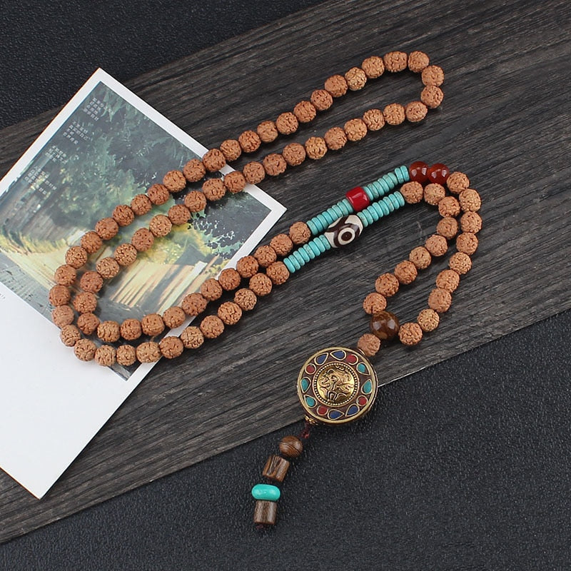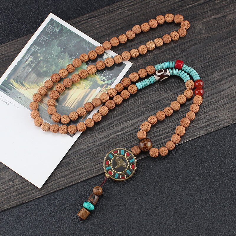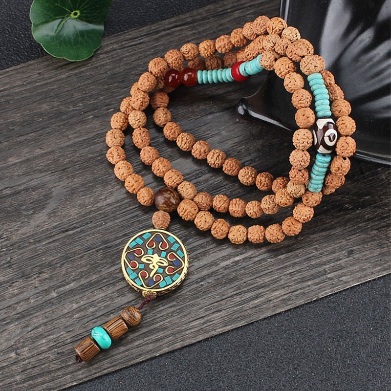 Natural Rudraksha Beads Prayer Necklace Tibetan Classic Nepal OM Pendant Necklace Yoga Meditation Strand Mala Healing Jewelry