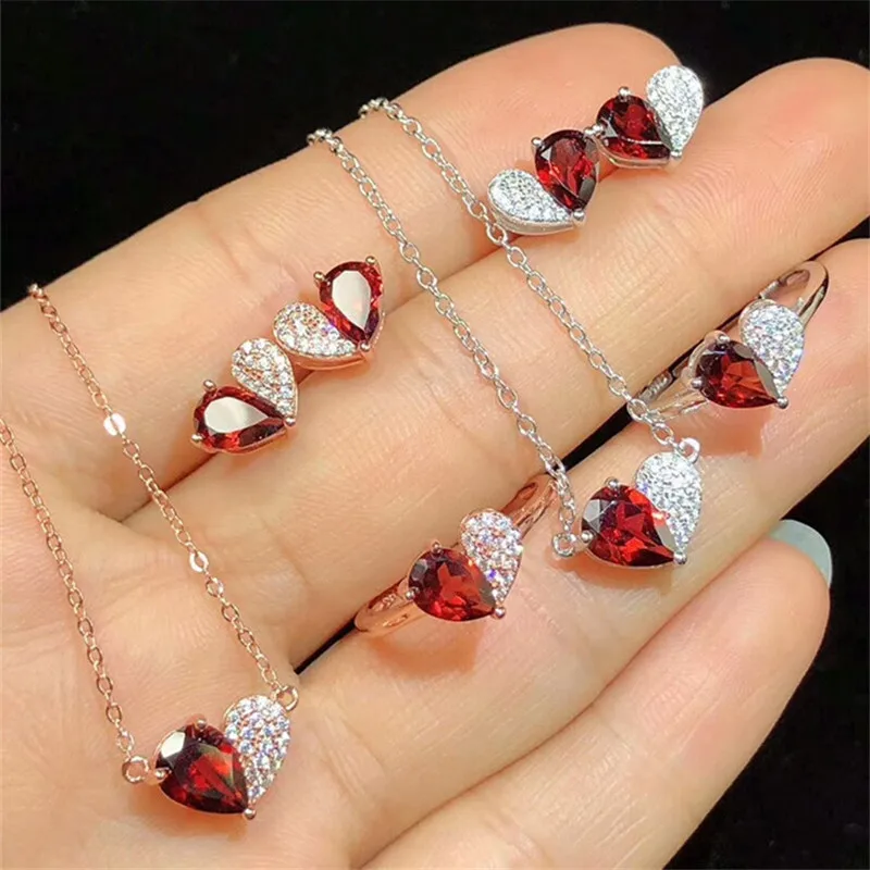 Natural Stone Garnet Ring Earrings Pendant Necklace Set Antique for Women Adjustable Brand Jewelry Set Red Gems Fashion
