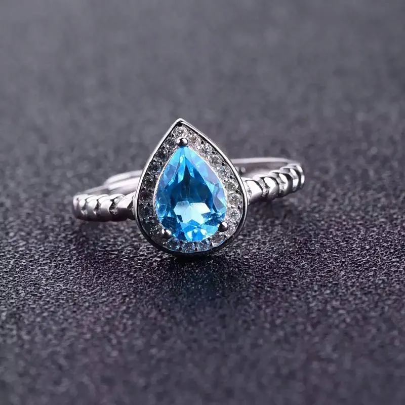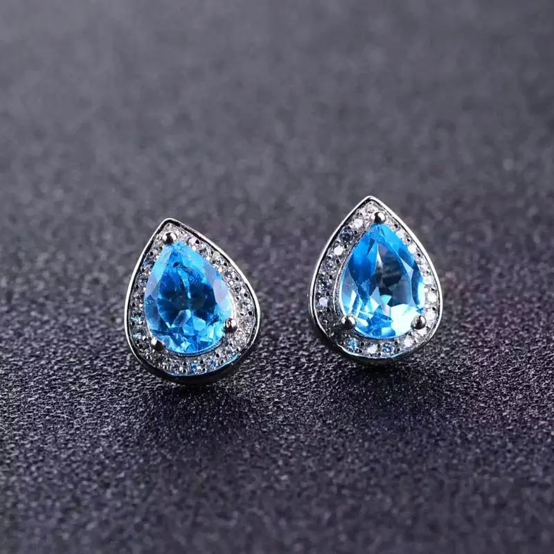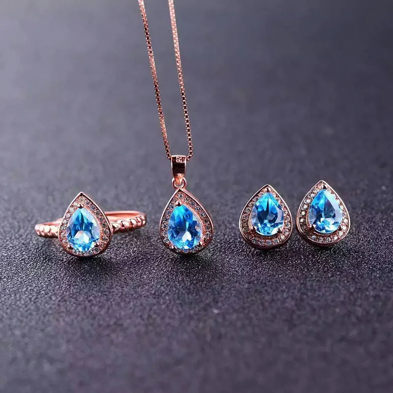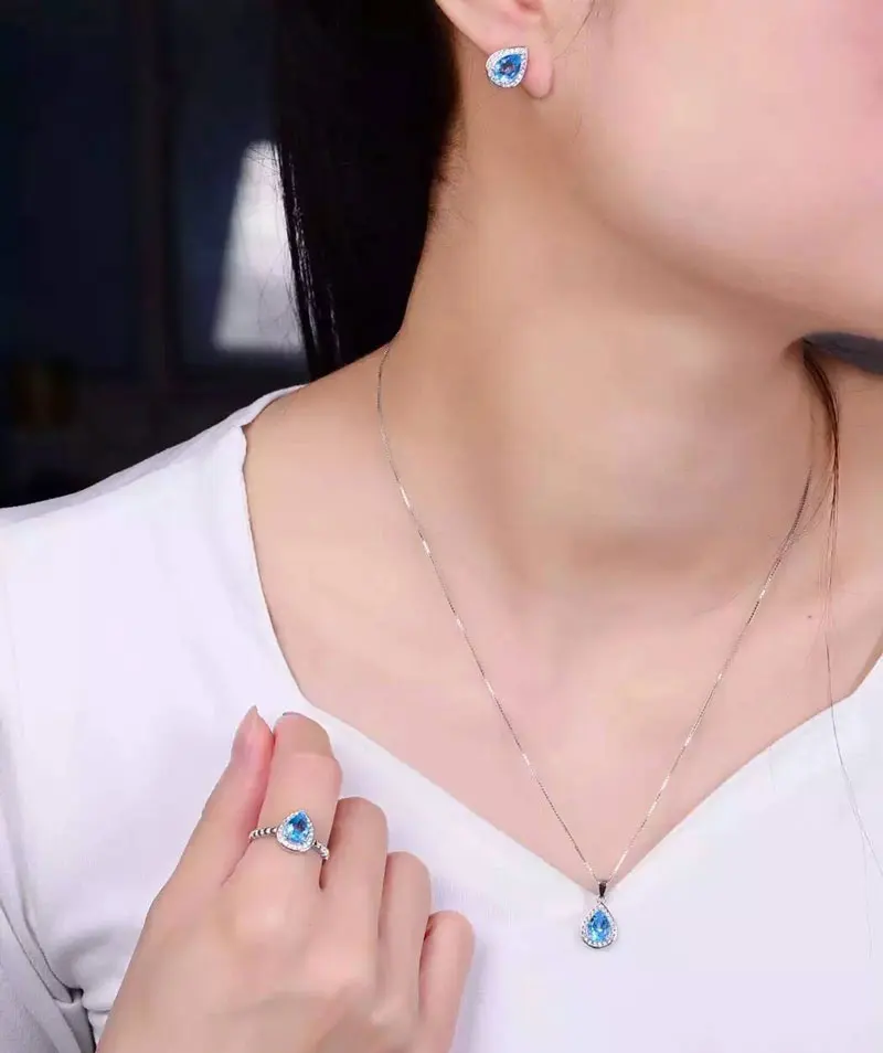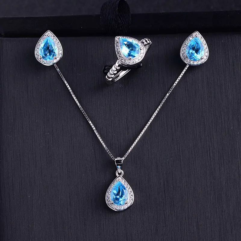 Natural Blue Topaz Jewelry Sets Genuine Solid 925 Sterling Silver Women Gemstone Ring And Necklace Pendant Earrings