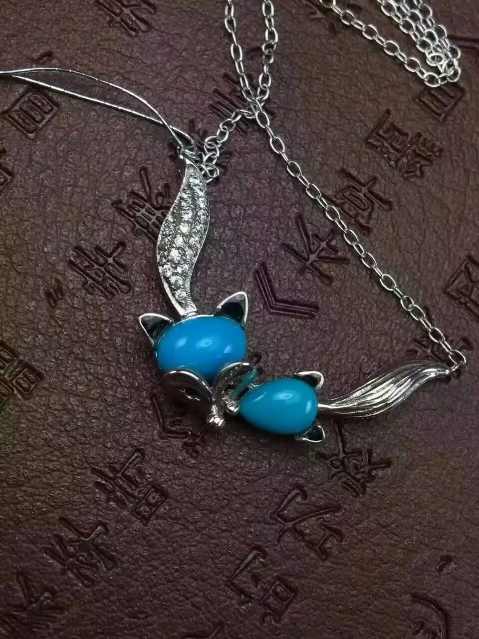 Natural turquoise Necklace natural opal Pendant Necklace S925 Sterling silver trendy elegant Cute little fox Girl party Jewelry