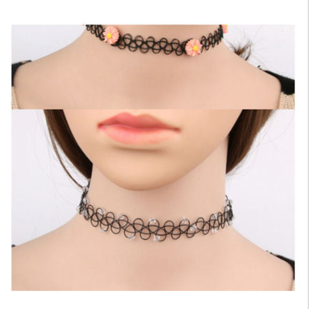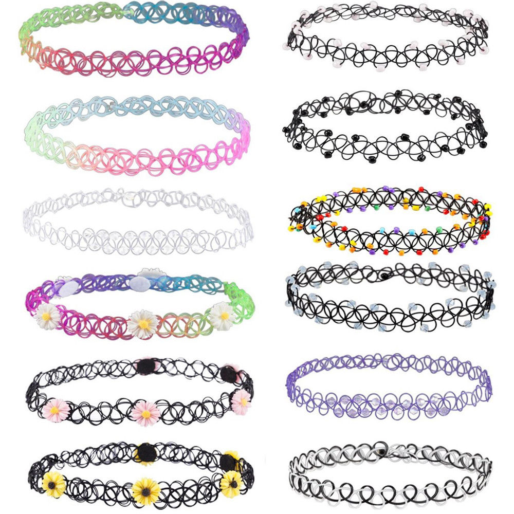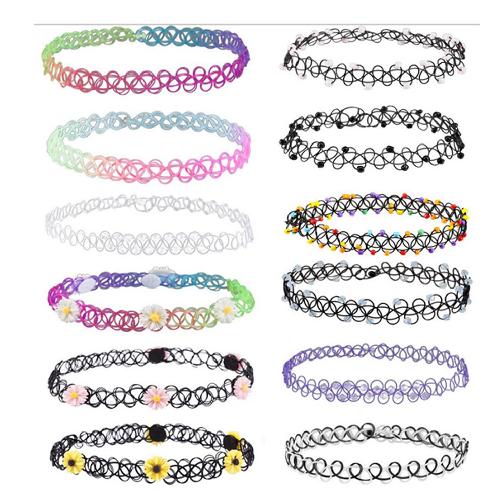 newest 12Pcs/Set Stretch Tattoo Rainbow Necklace Punk Gothic Elastic Choker Retro Punk Tattoo Necklace