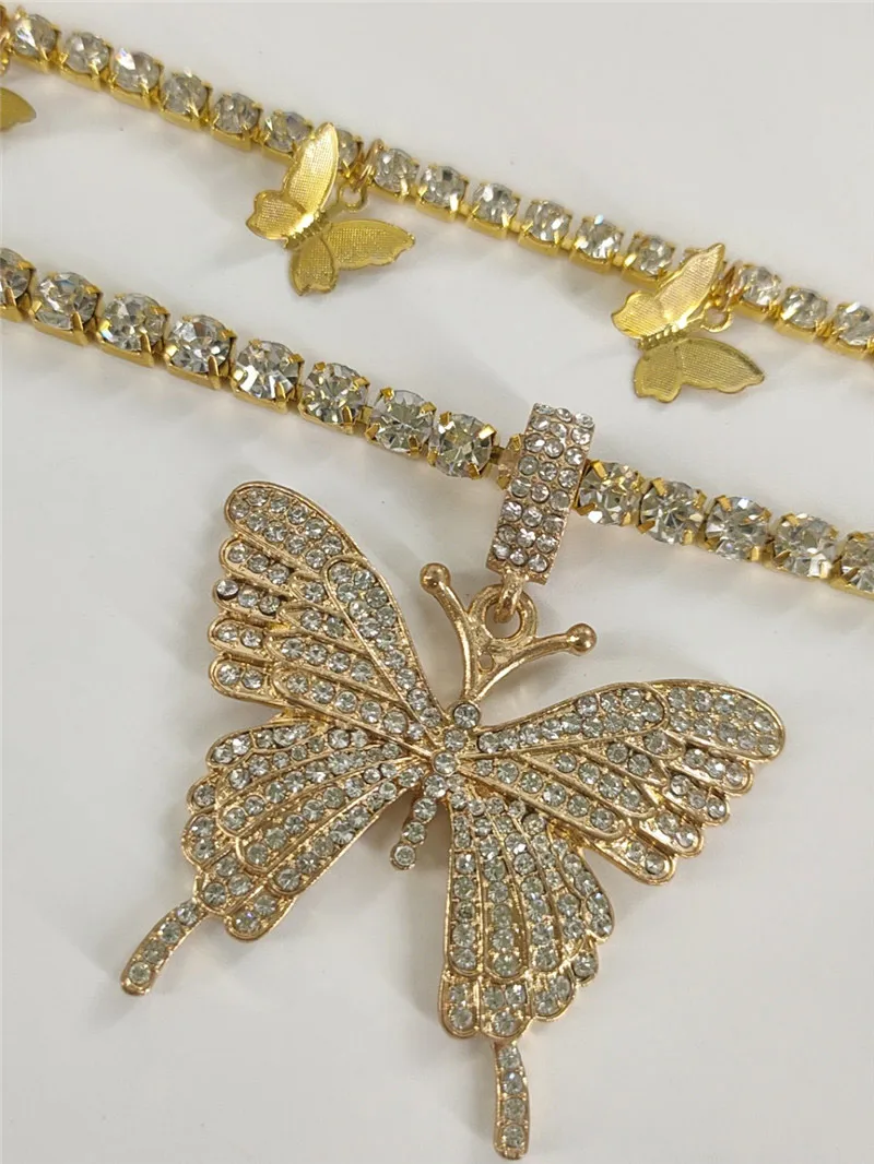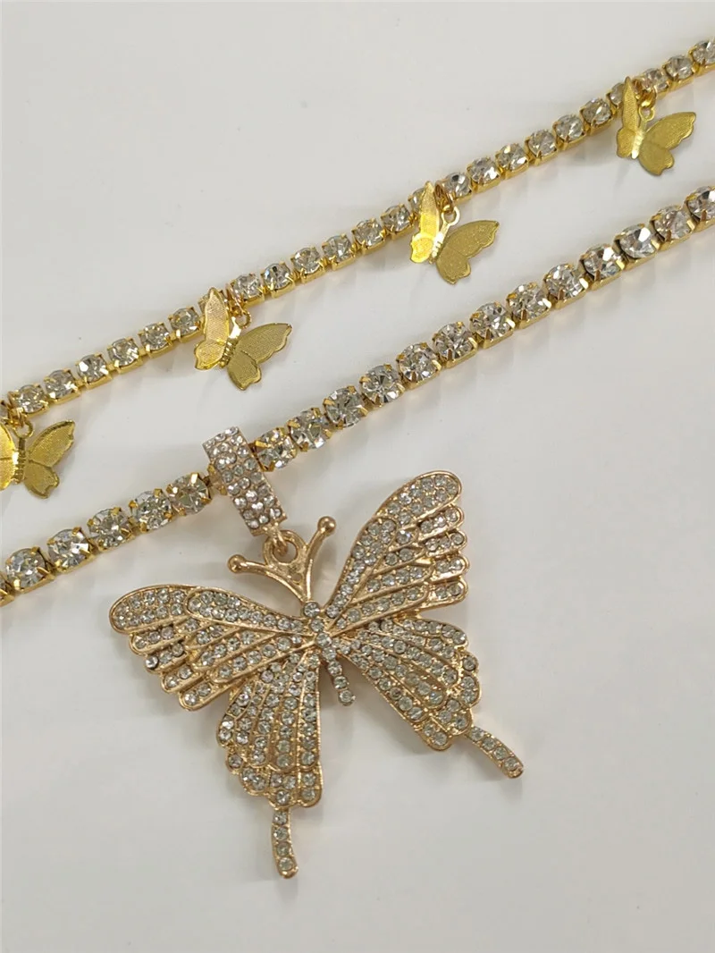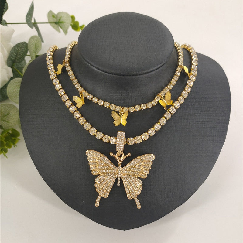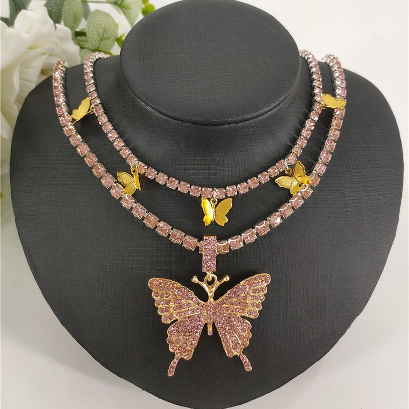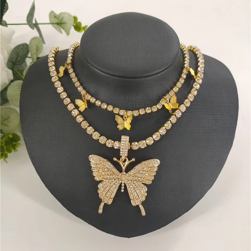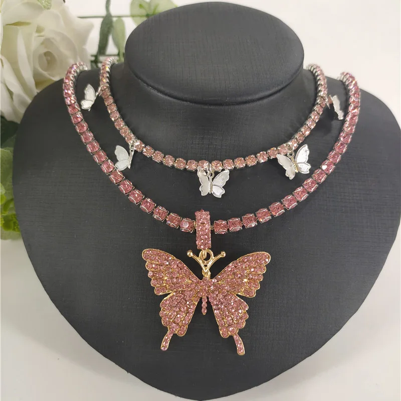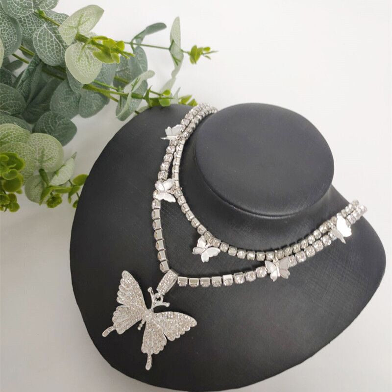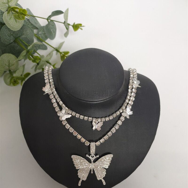 NIUYITID 2021 Bling Rhinestone Butterfly Necklace For Women Girl Jewelry Double Layer Tennis Chain Hip Hop