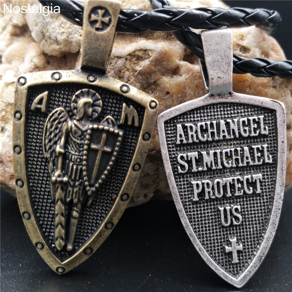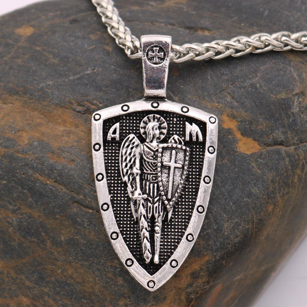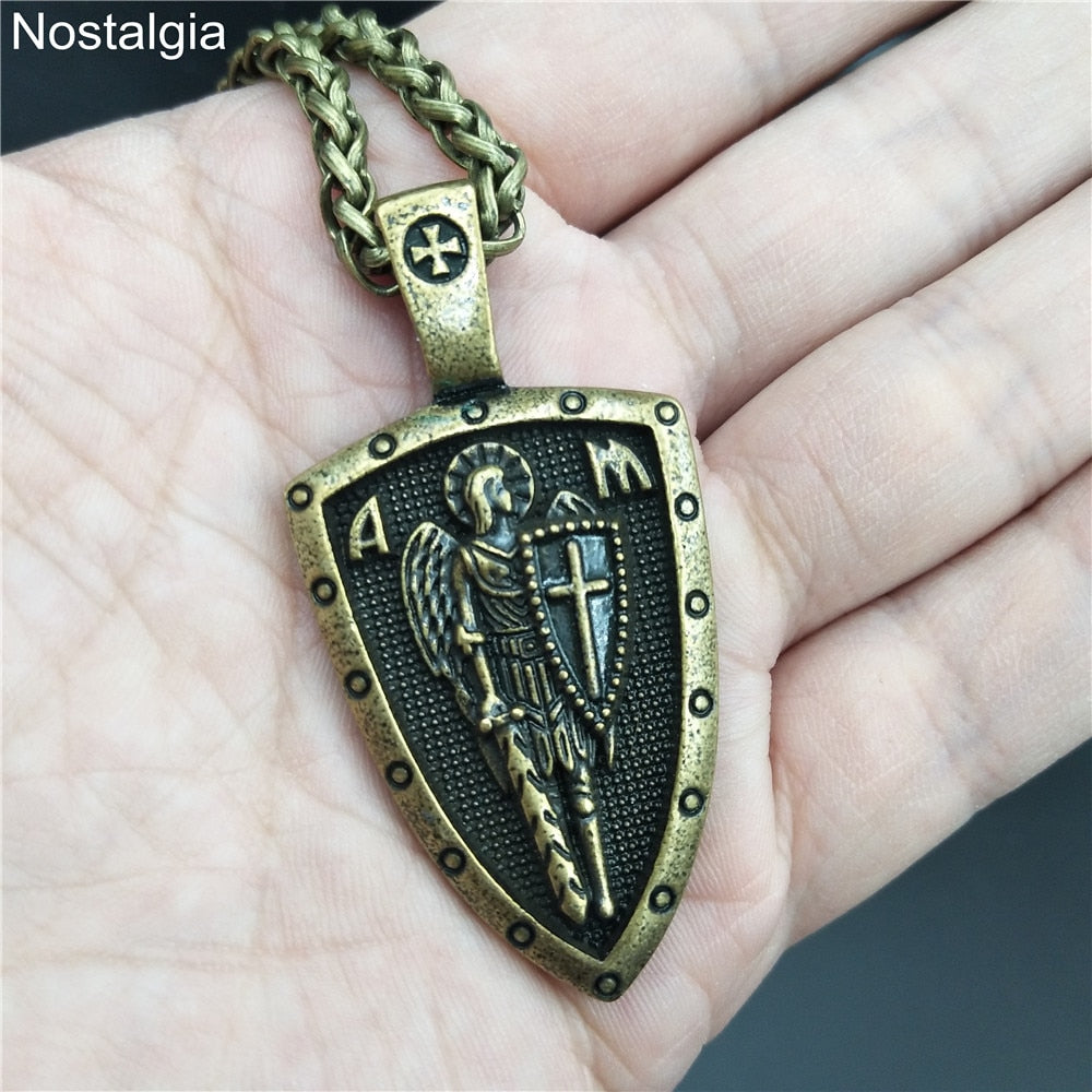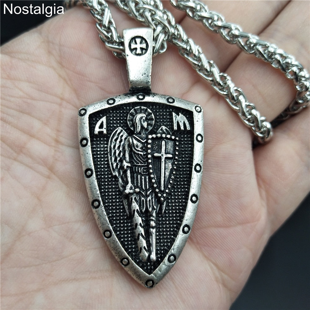 Nostalgia ARCHANGEL ST.MICHAEL PROTECT US Cross Shield Medal Amulet Pendant Necklace