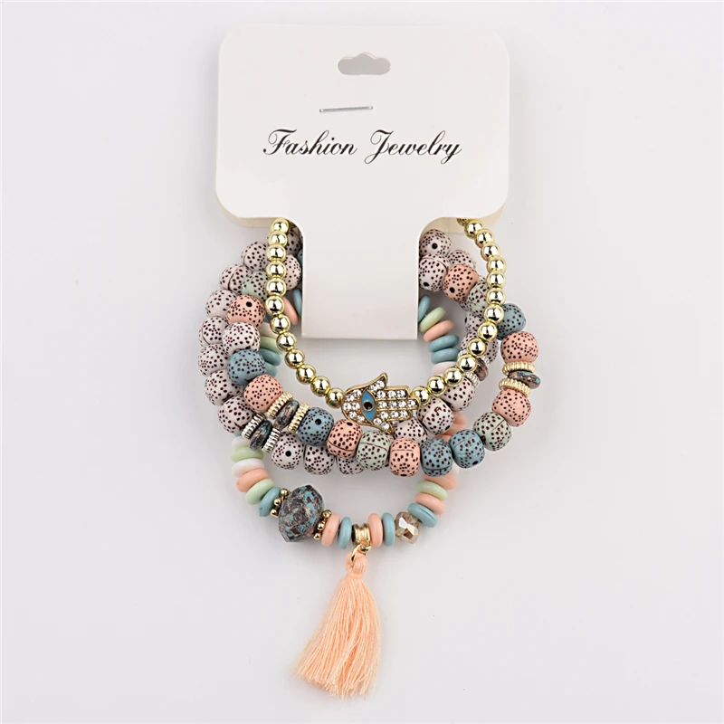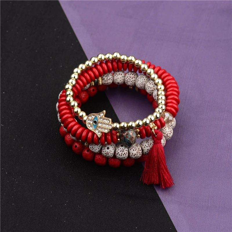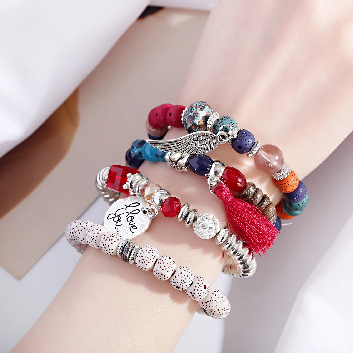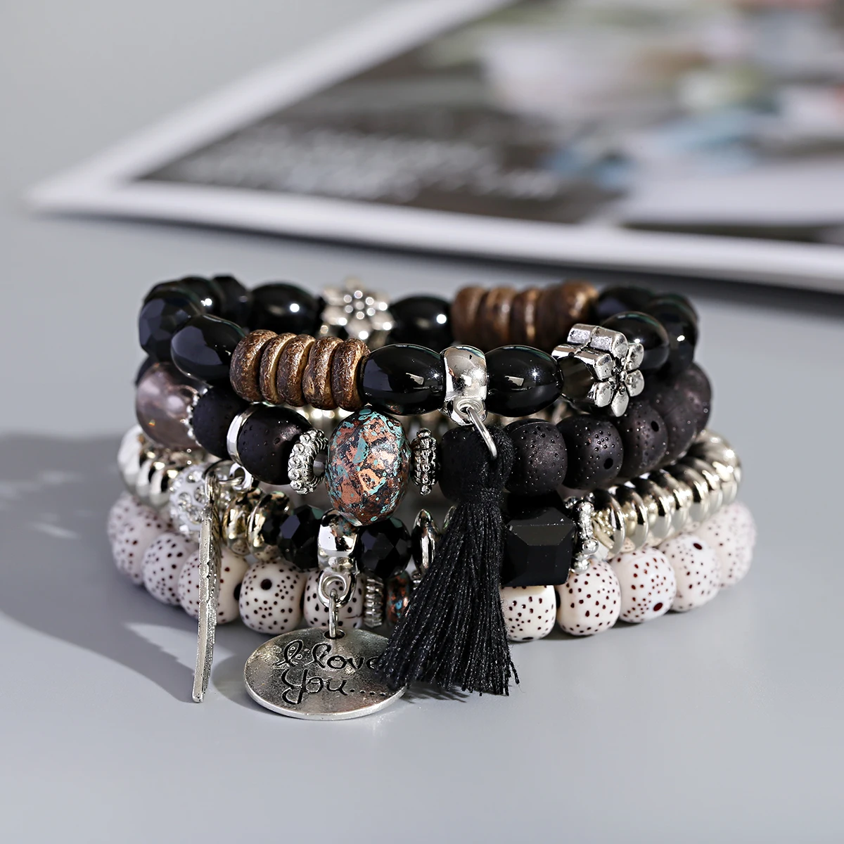 OIQUEI Vintage 4Pcs/Lot Women Bracelets Set Bohemia Charm CZ Hand Natural Stone Beads Tassel Pendents Bracelets Pour Les Femmes