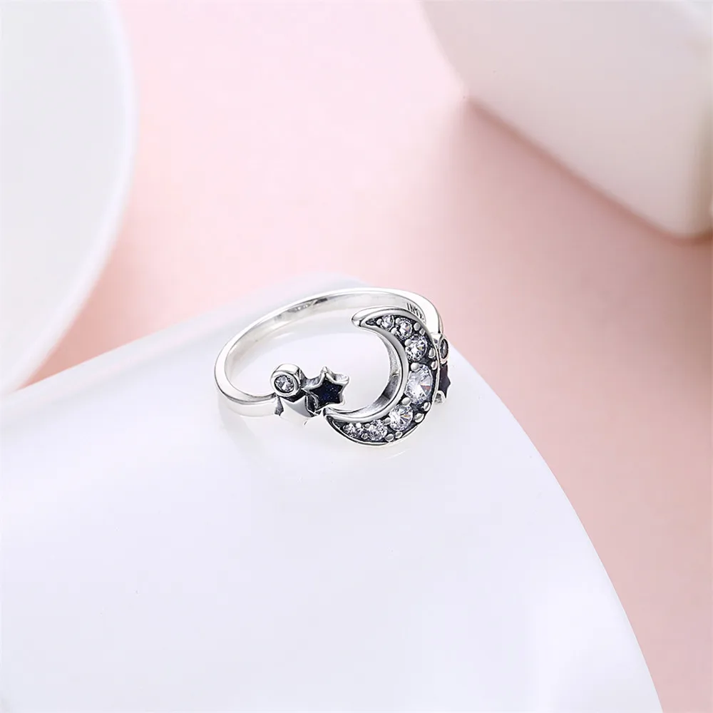 Rings Real 925 Sterling Silver Crescent Moon & Star Dazzling CZ Open Finger Ring for Women Engagement Fine Jewelry YMR033
