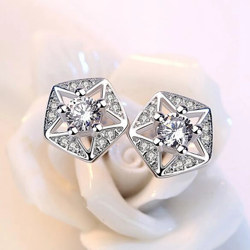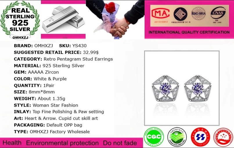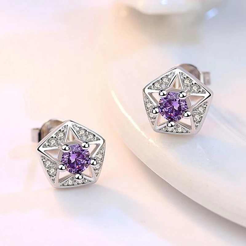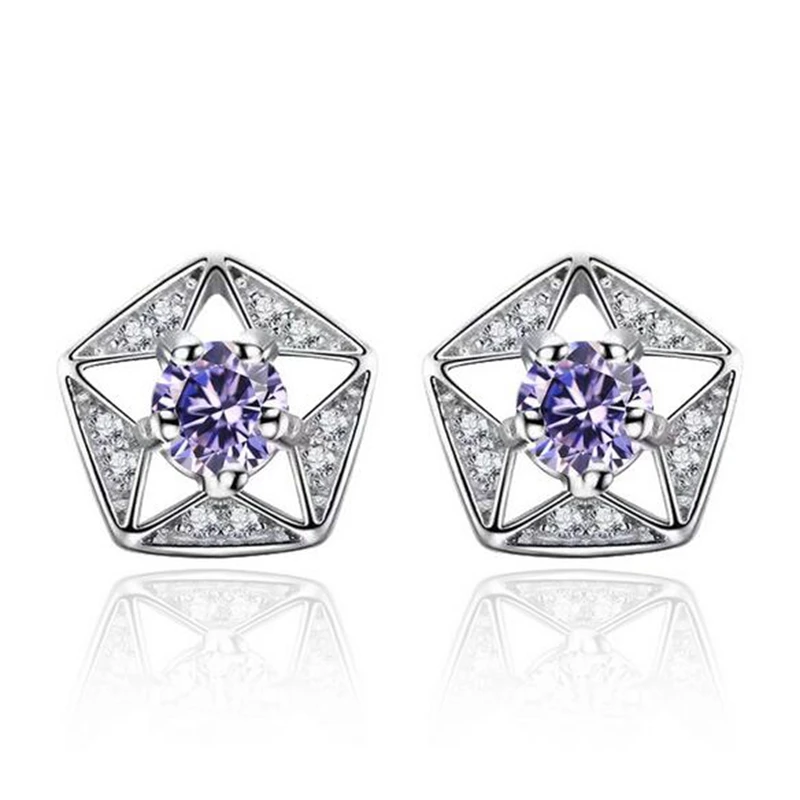 Wholesale Retro Fashion Wild Woman Girl Wedding White Purple Pentagram AAA Zircon 925 Sterling Silver Stud Earrings YS430