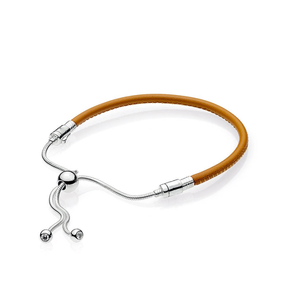 Original 925 Silver Charm Sliding Sliding Golden Tan Black Leather Bracelet, Clear CZ High Quality Leather Female Charm Bracelet