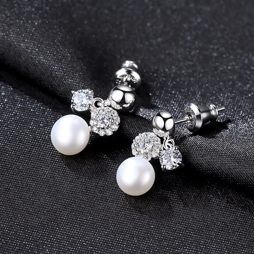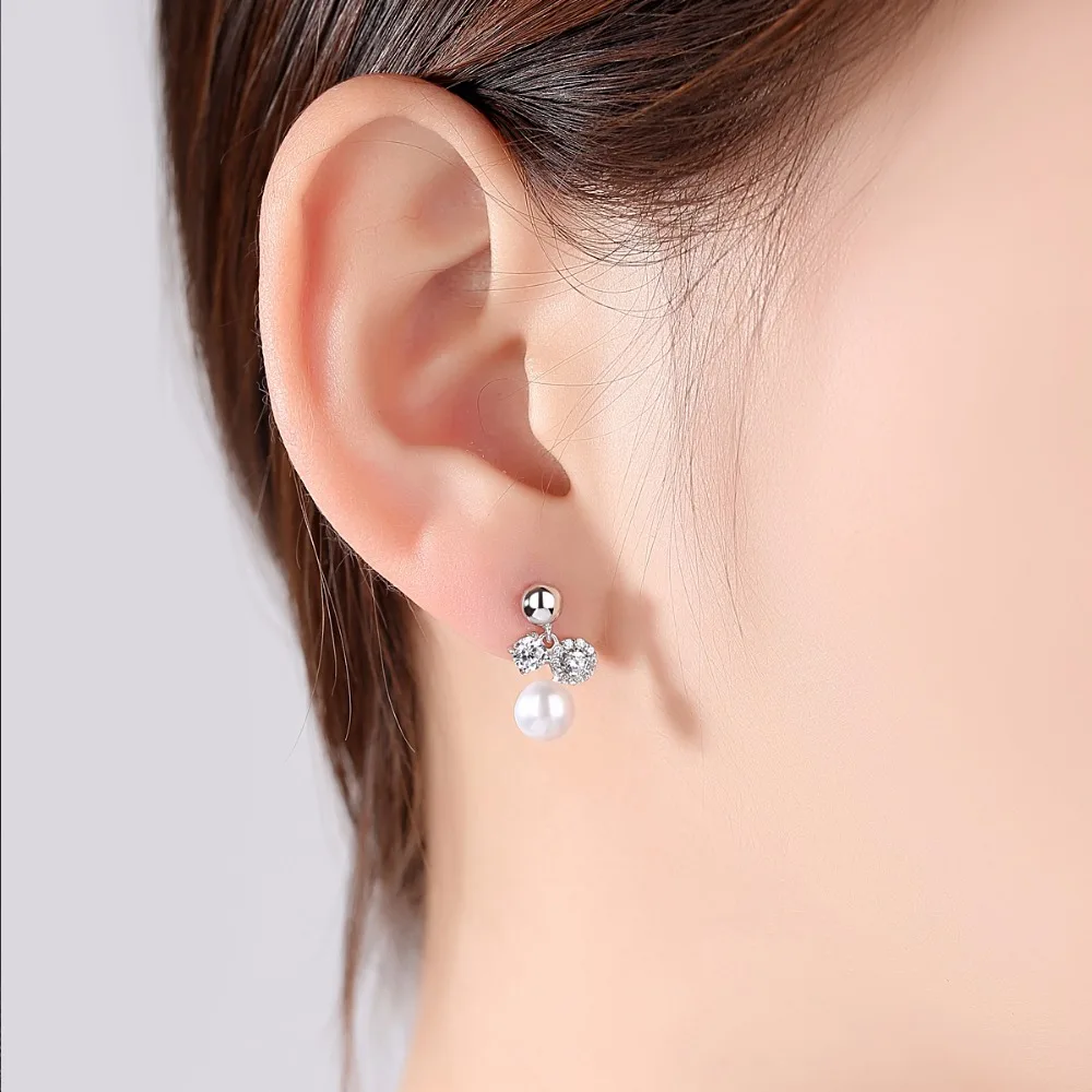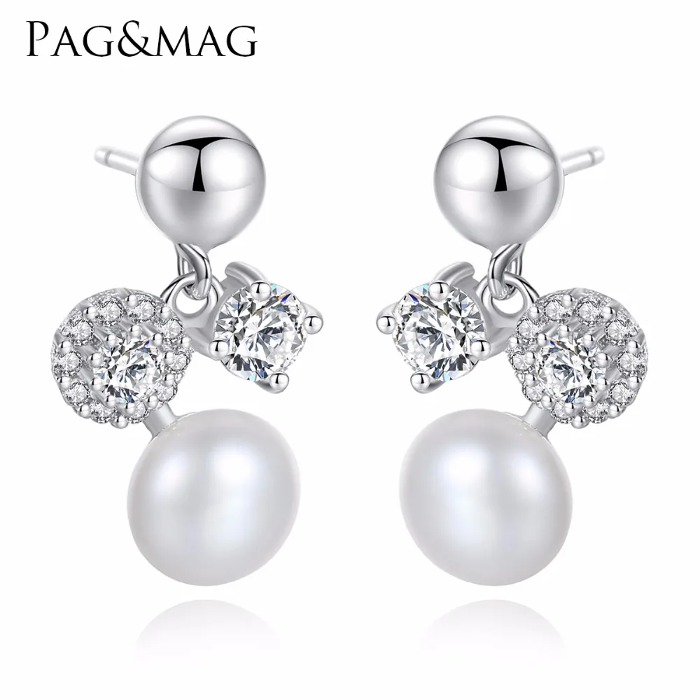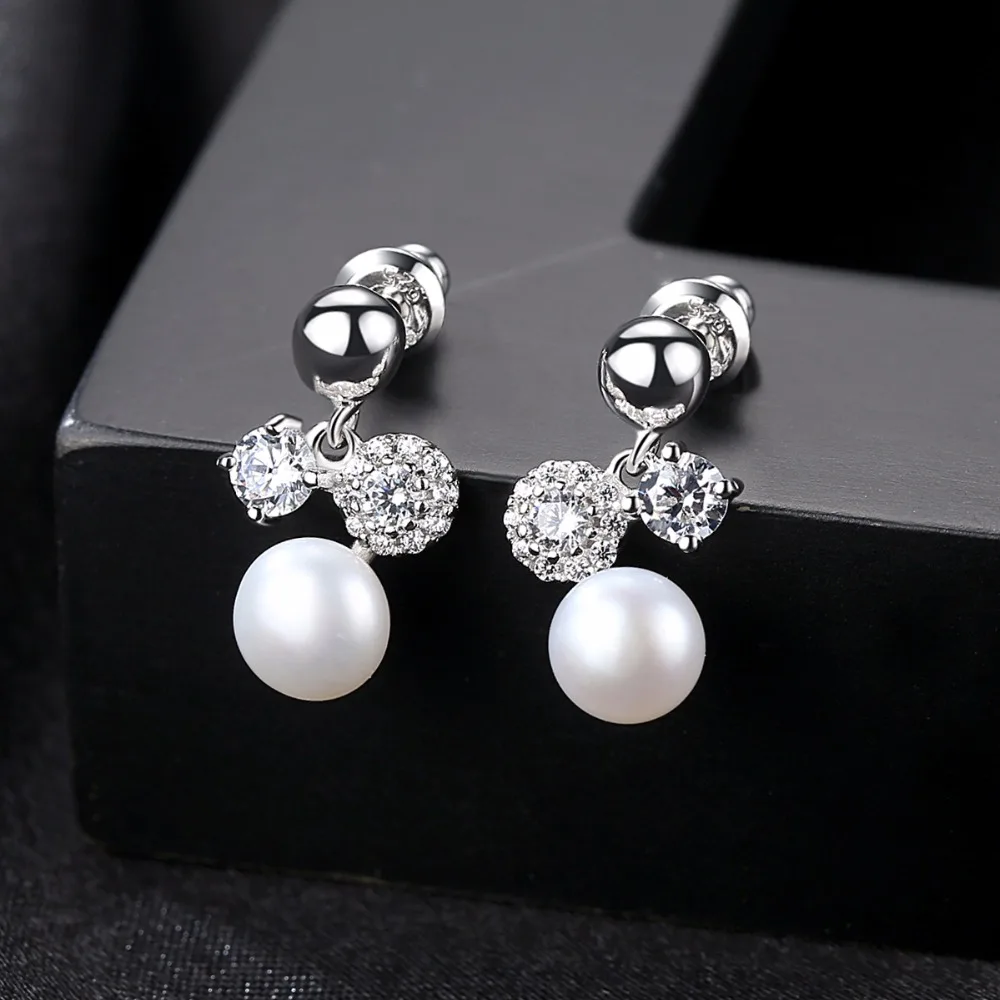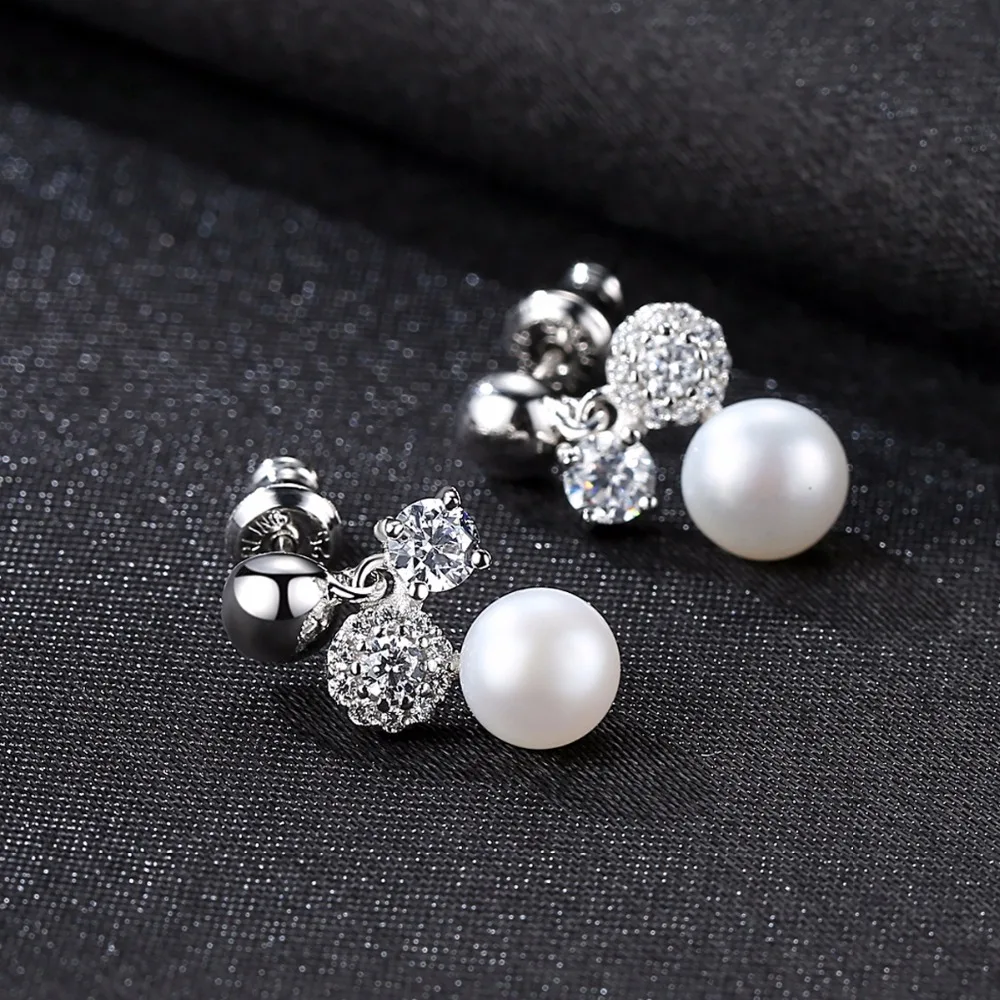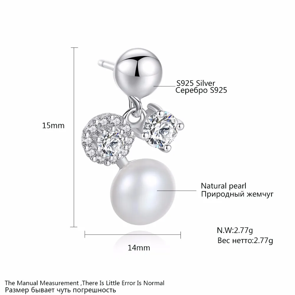 Popular Korean Style Natural Pearl Bling CZ Crystal Geometric Shape Sterling Silver Stud Earrings For Women Fine Jewelry