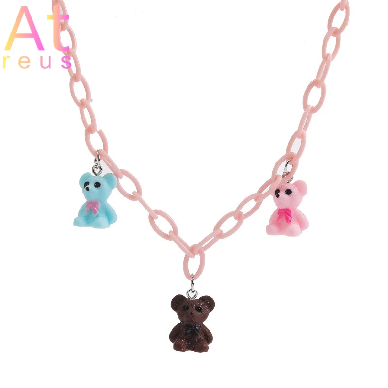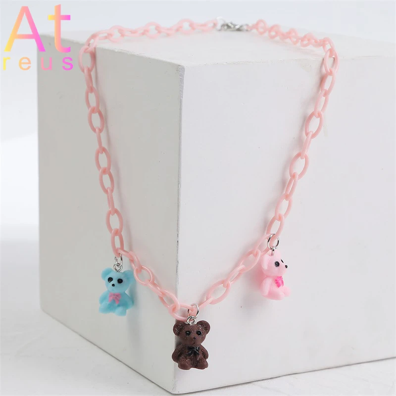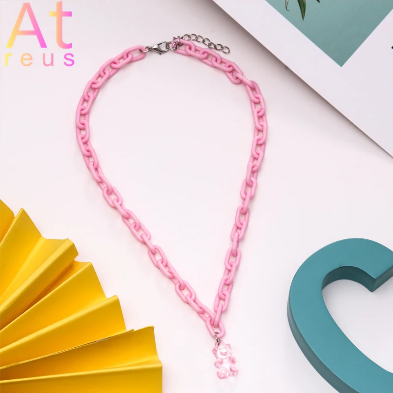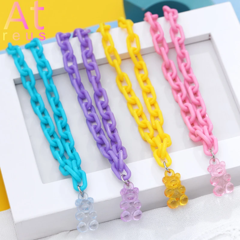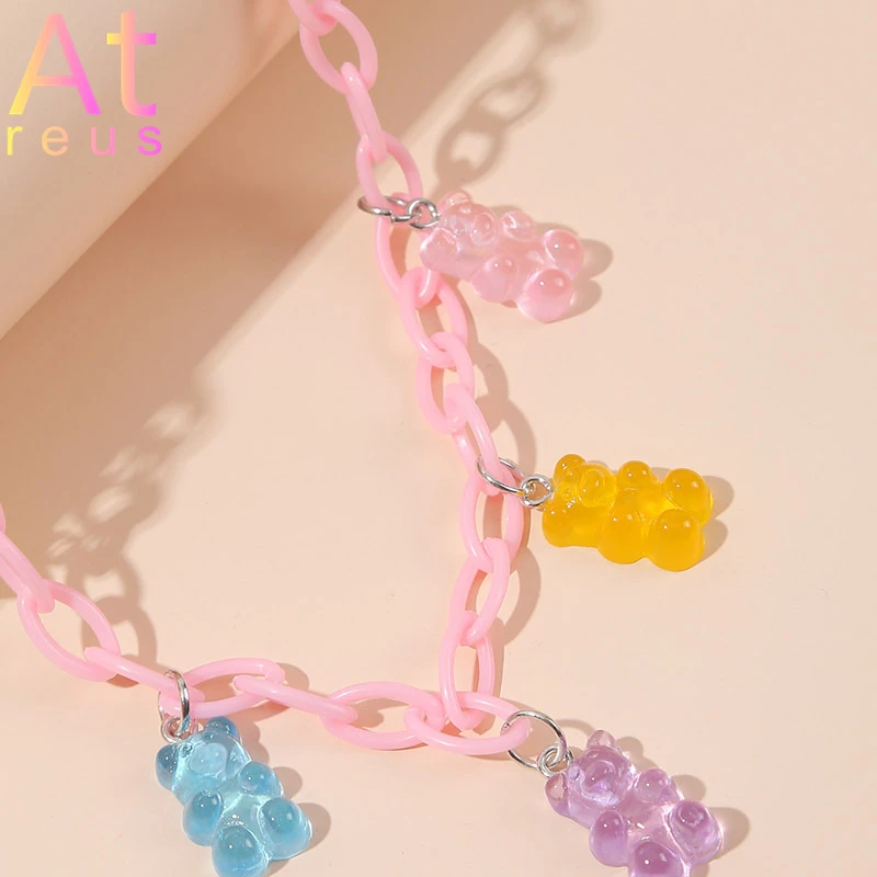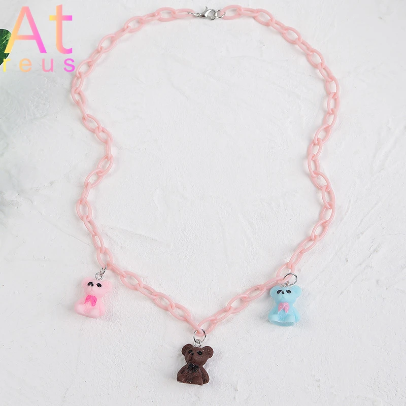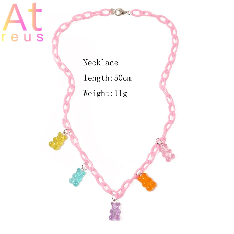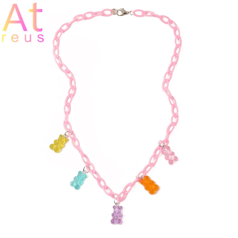 Pink Plastic Resin Chain Colorful Cartoon Gummy Mini Bear Resin Necklace Candy Color Pendant For Women Girl Jewelry Gift