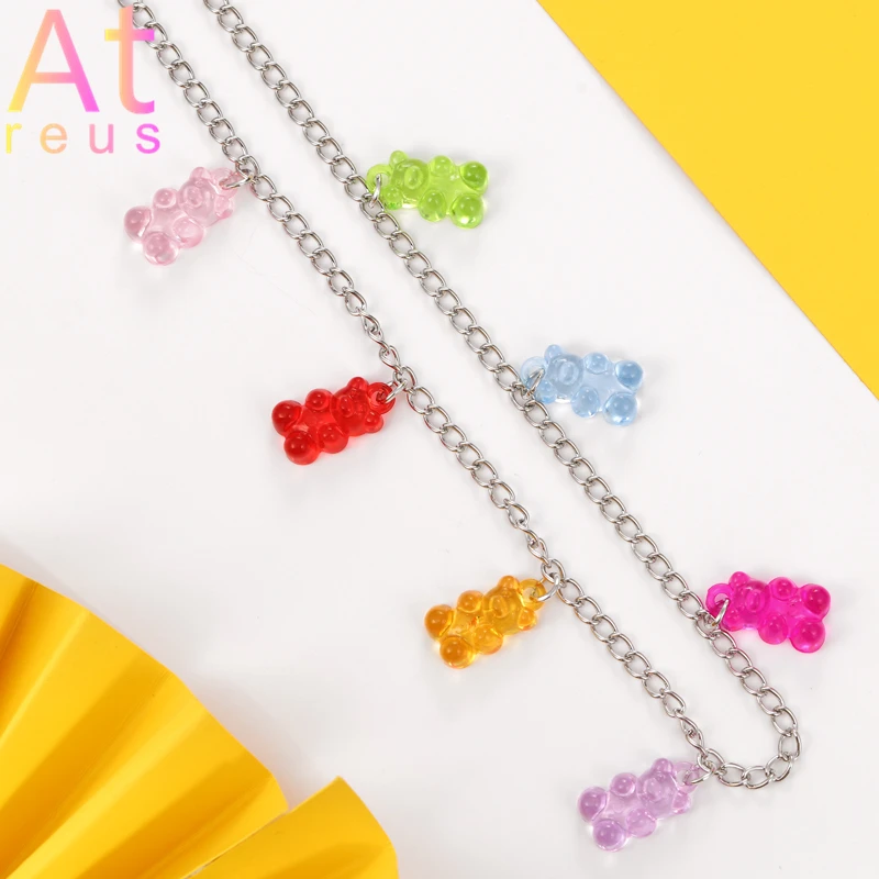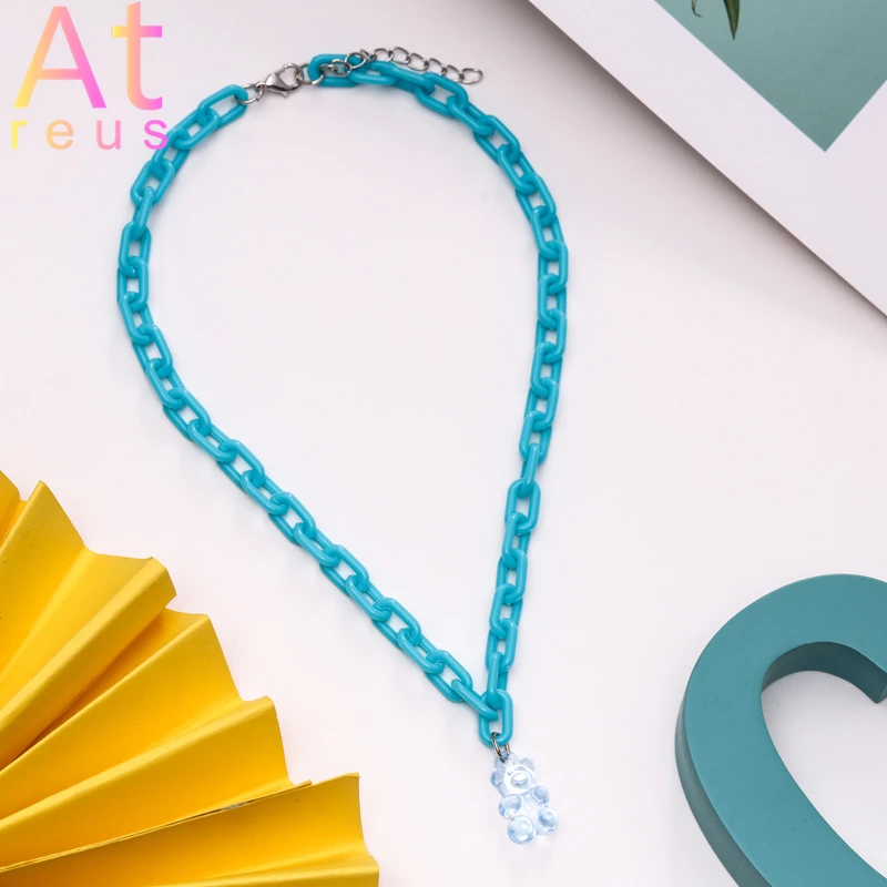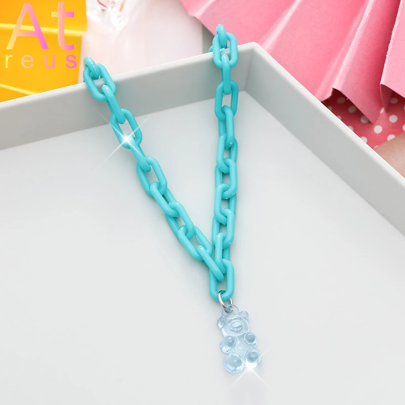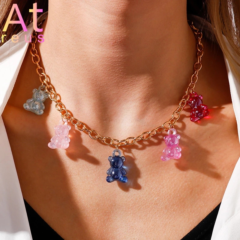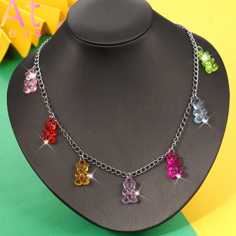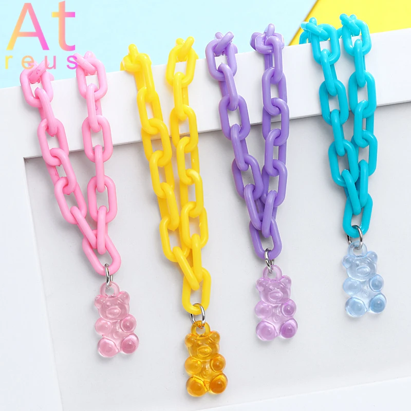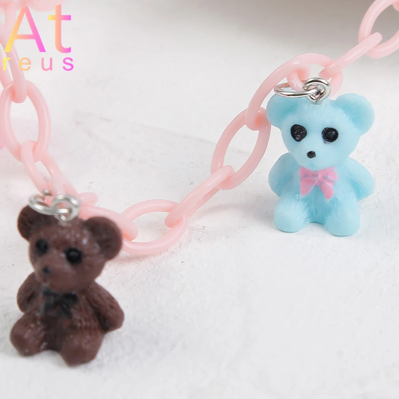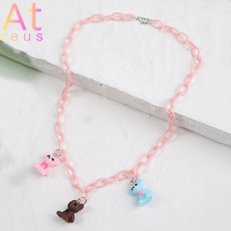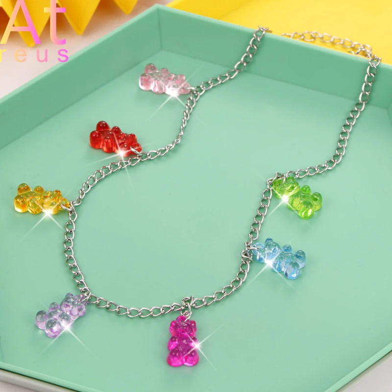 Pink Plastic Resin Chain Colorful Cartoon Gummy Mini Bear Resin Necklace Candy Color Pendant For Women Girl Jewelry Gift