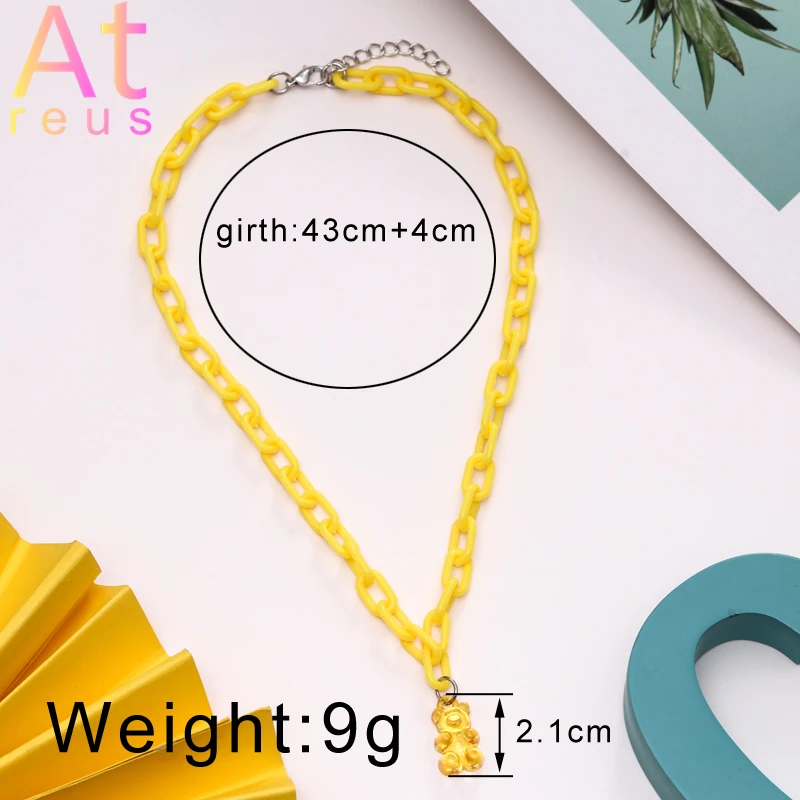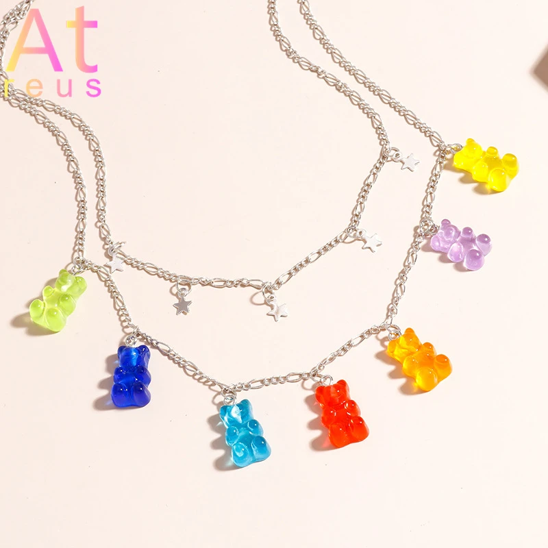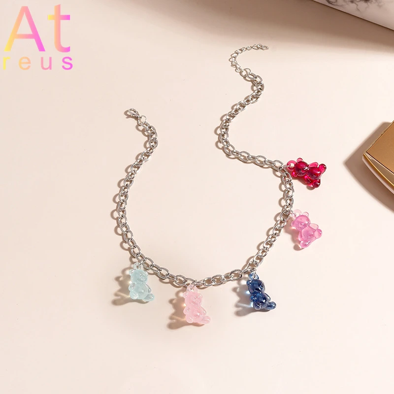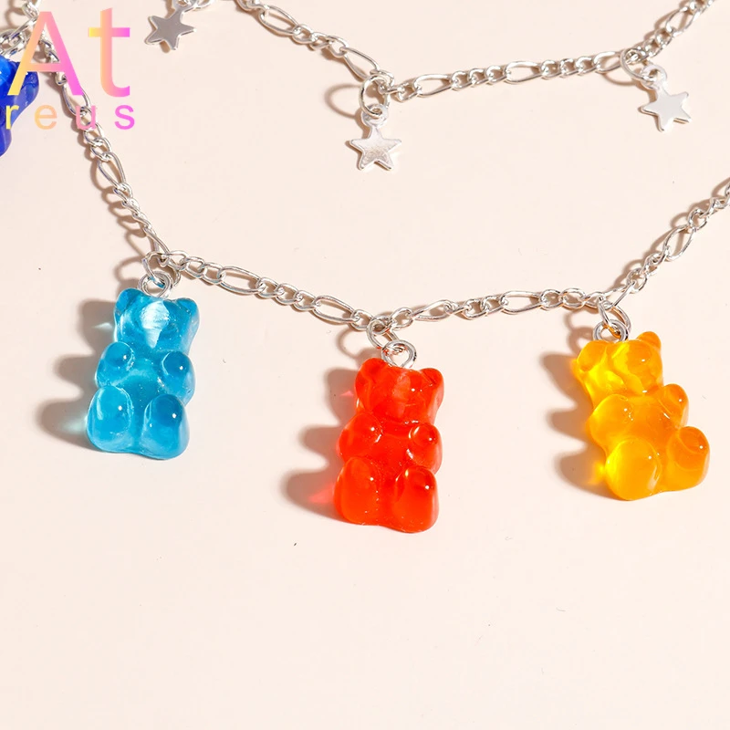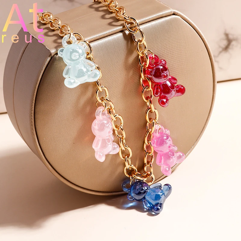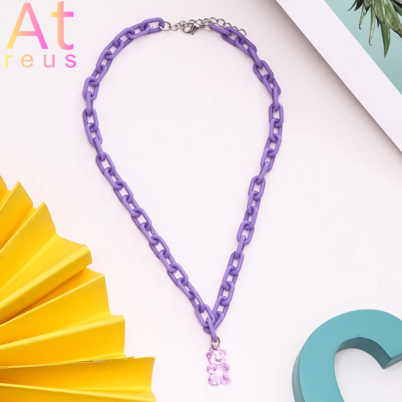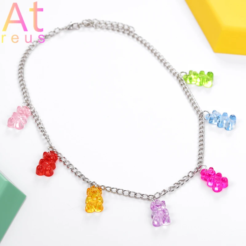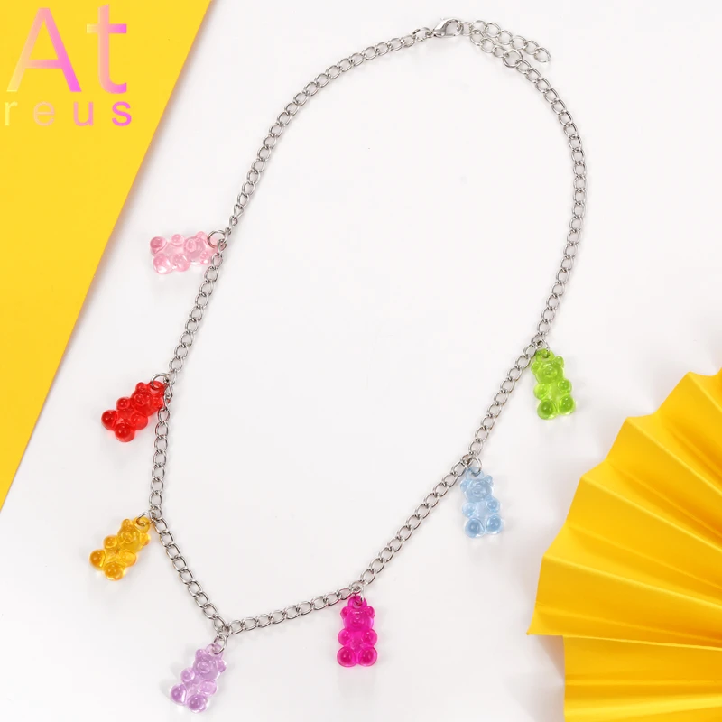Pink Plastic Resin Chain Colorful Cartoon Gummy Mini Bear Resin Necklace Candy Color Pendant For Women Girl Jewelry Gift