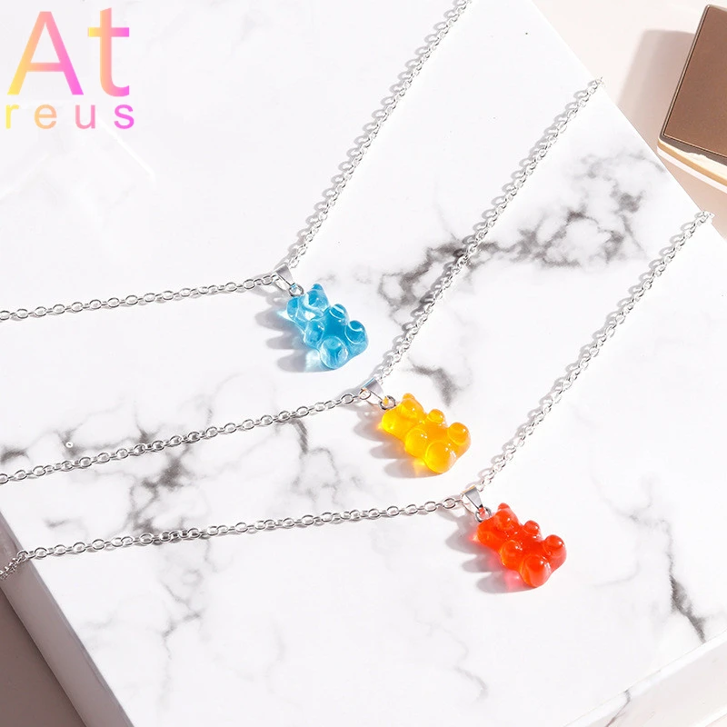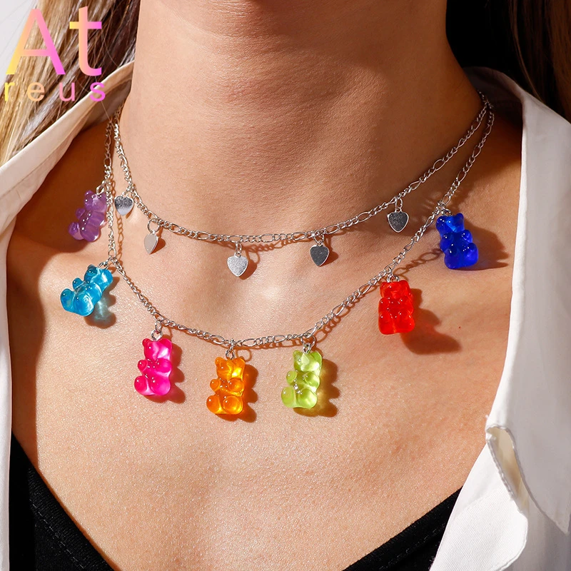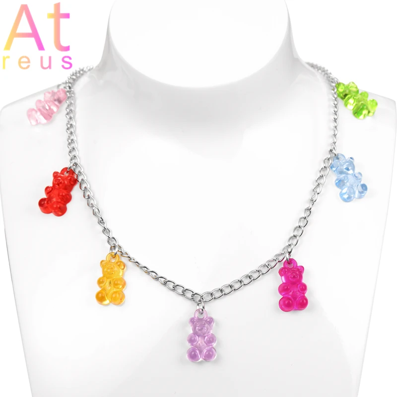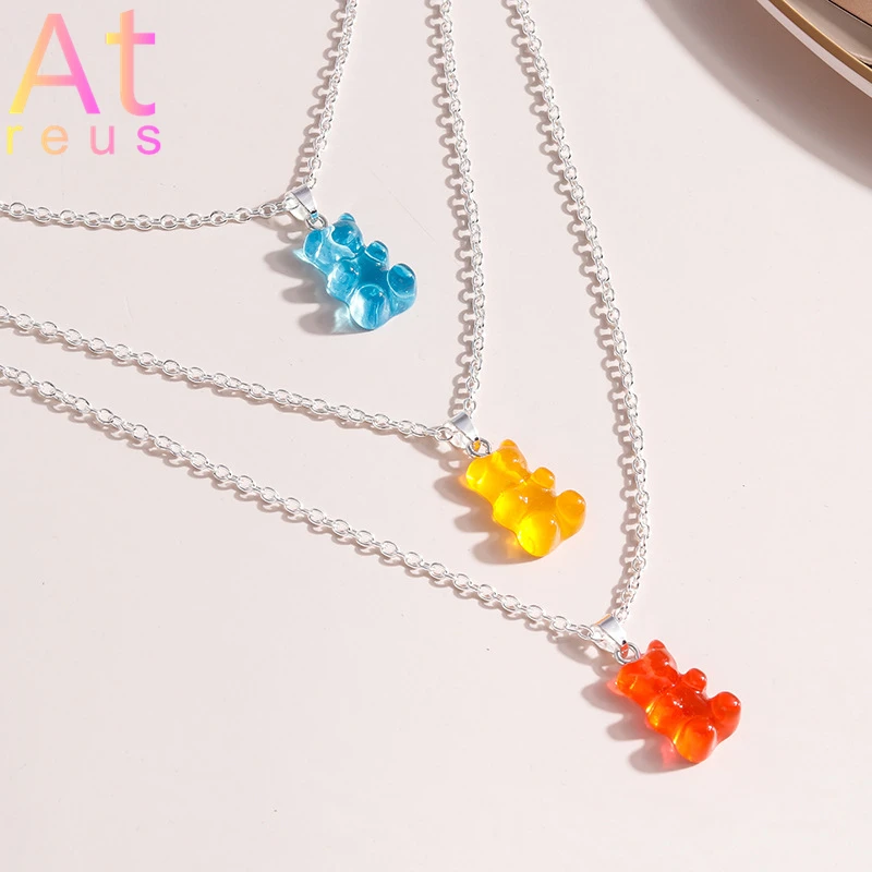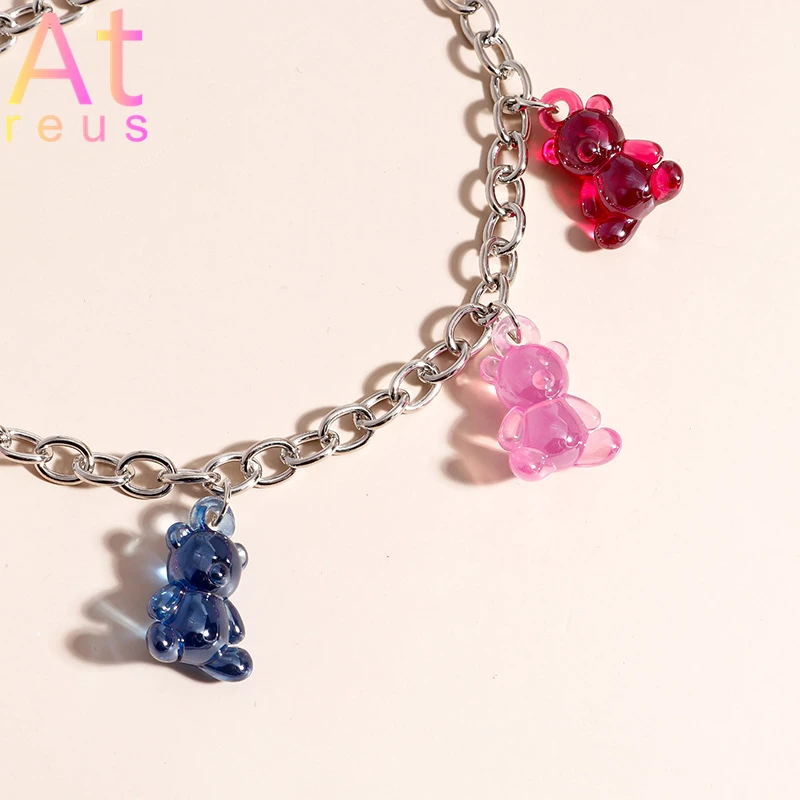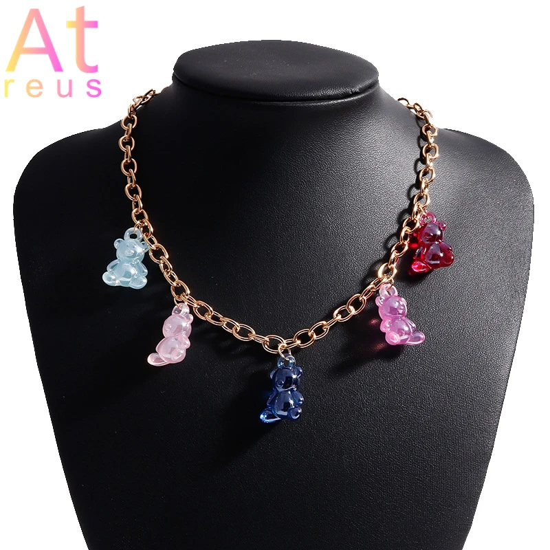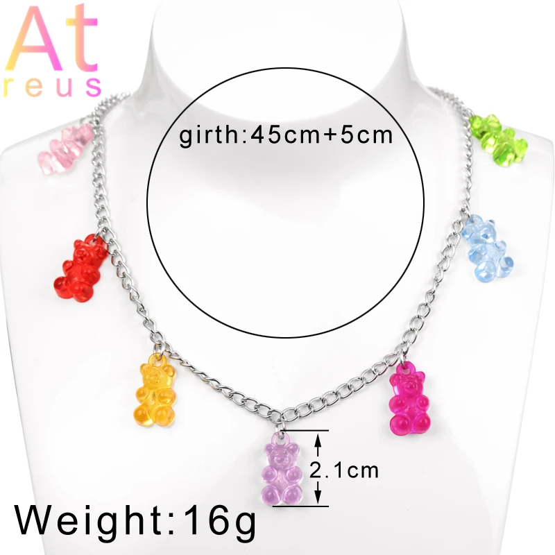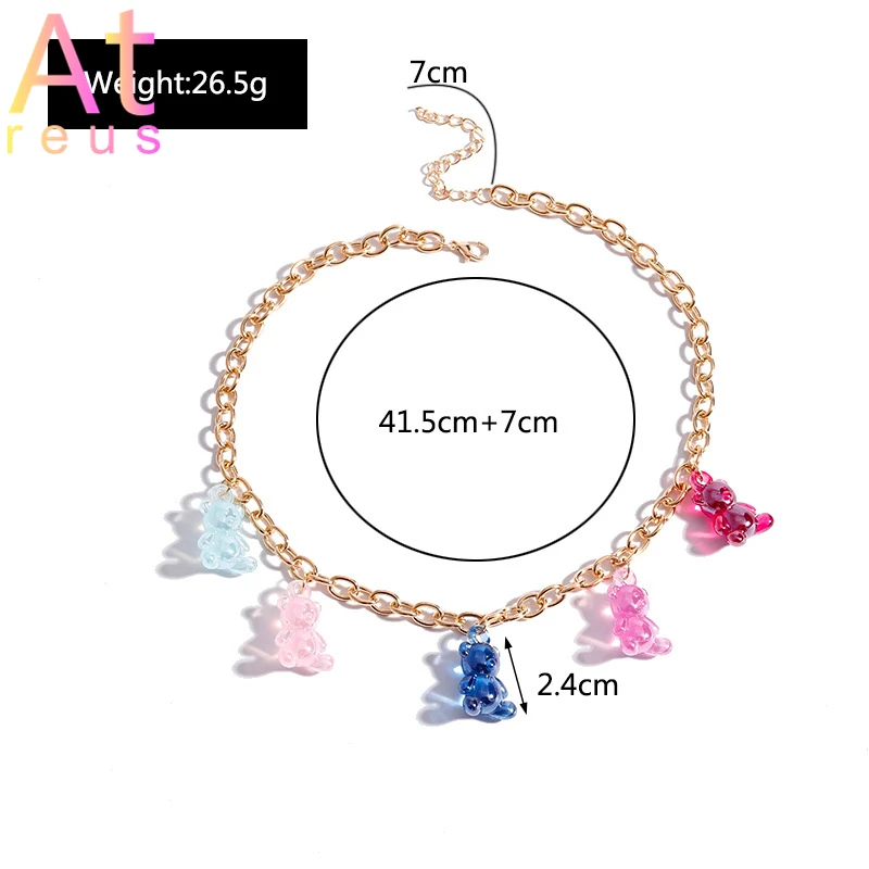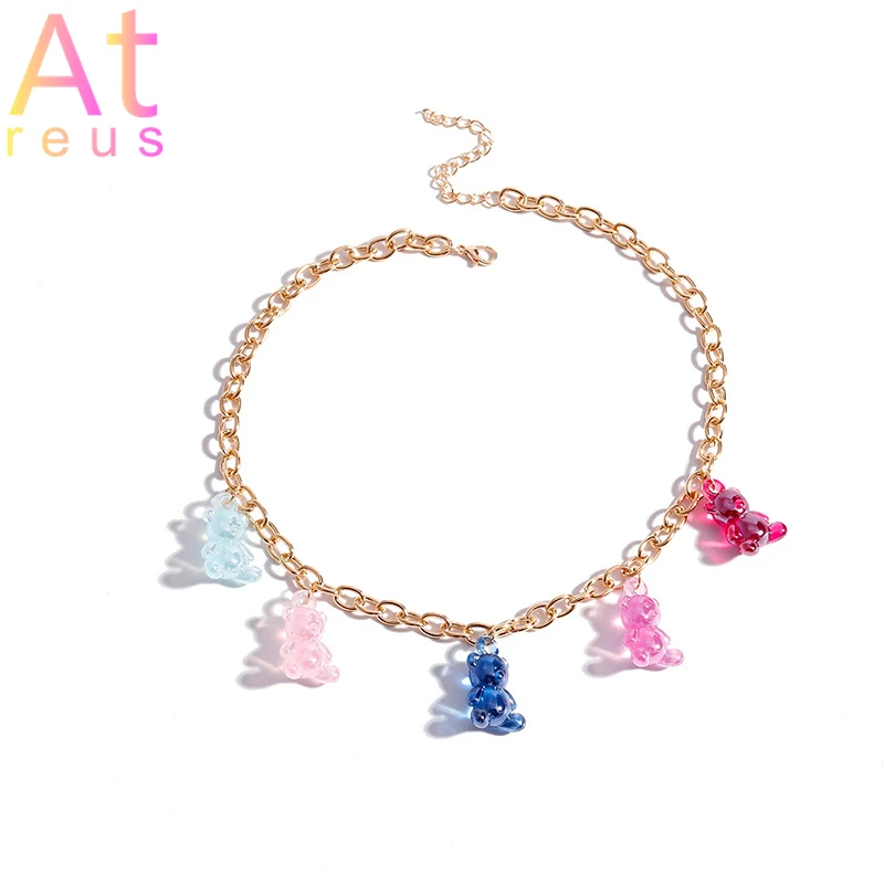 Pink Plastic Resin Chain Colorful Cartoon Gummy Mini Bear Resin Necklace Candy Color Pendant For Women Girl Jewelry Gift
